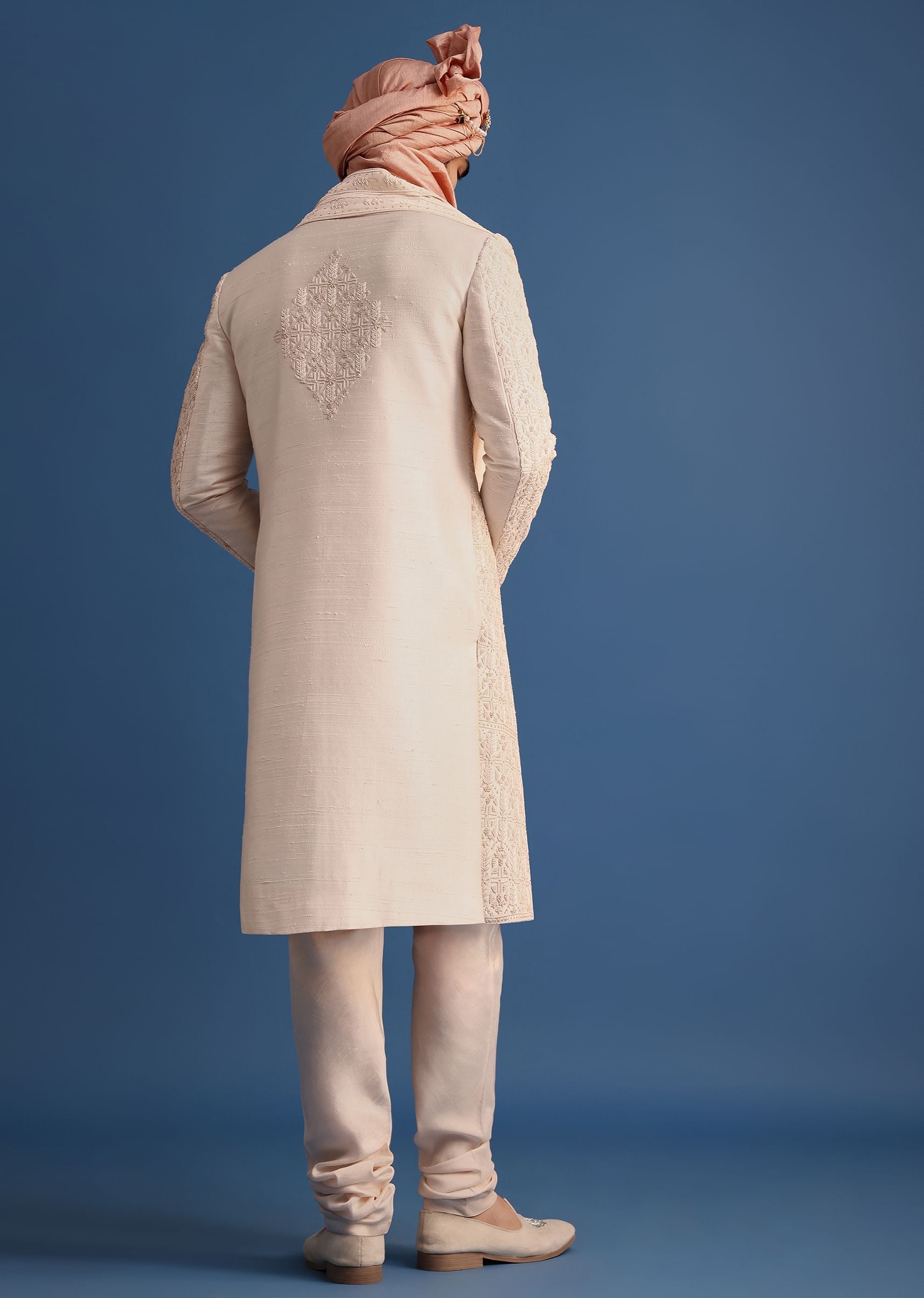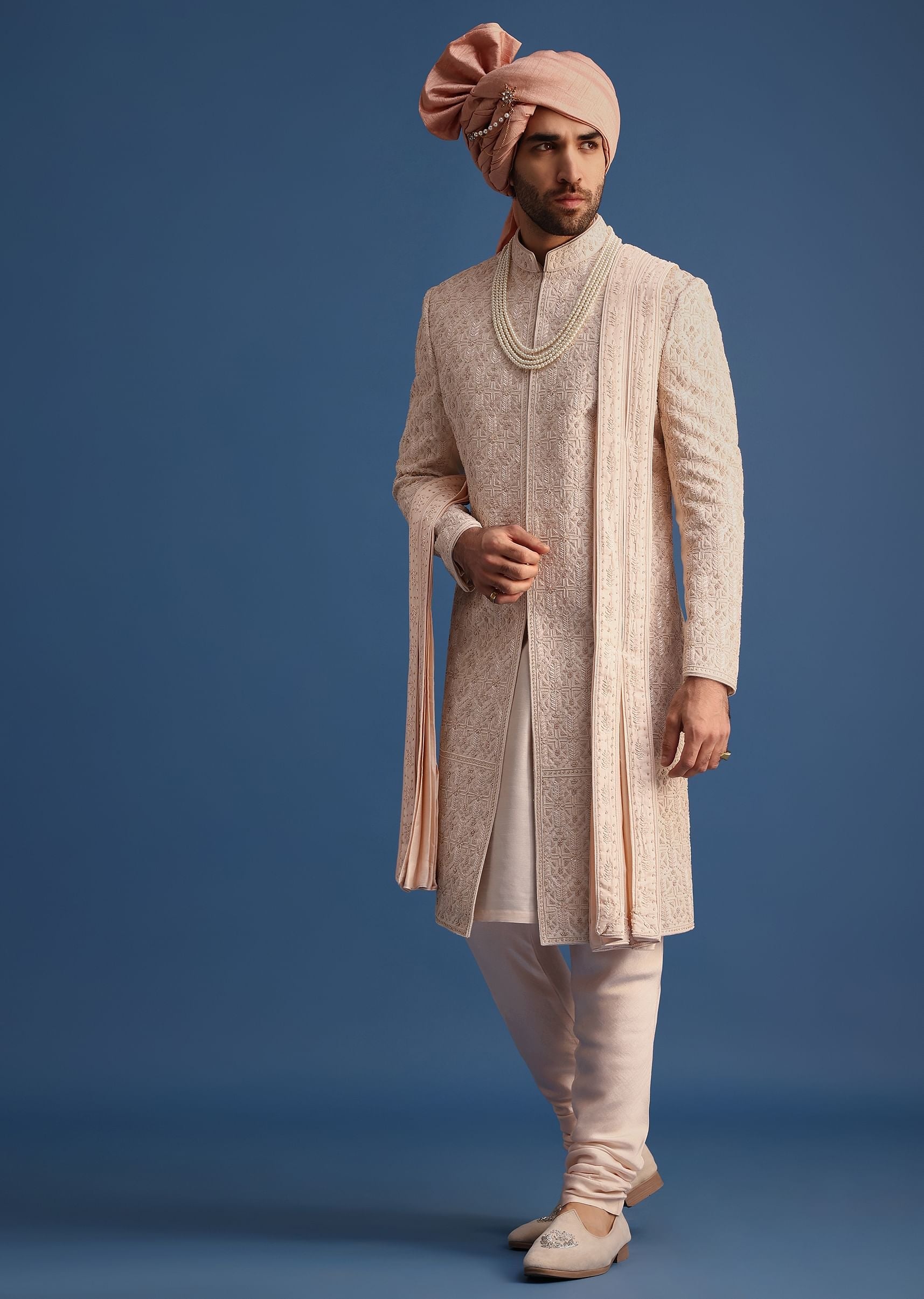 Radiate sophistication in our Peach Sherwani meticulously crafted from rich raw silk. Featuring exquisite handwork this sherwani blends classic elegance with contemporary style for a stunning look at a wedding or any special event. This sherwani comes with an kurta churidar and a dupatta. Awarded as the Most Trusted Brand, we're delivering styles you love, just as promised.