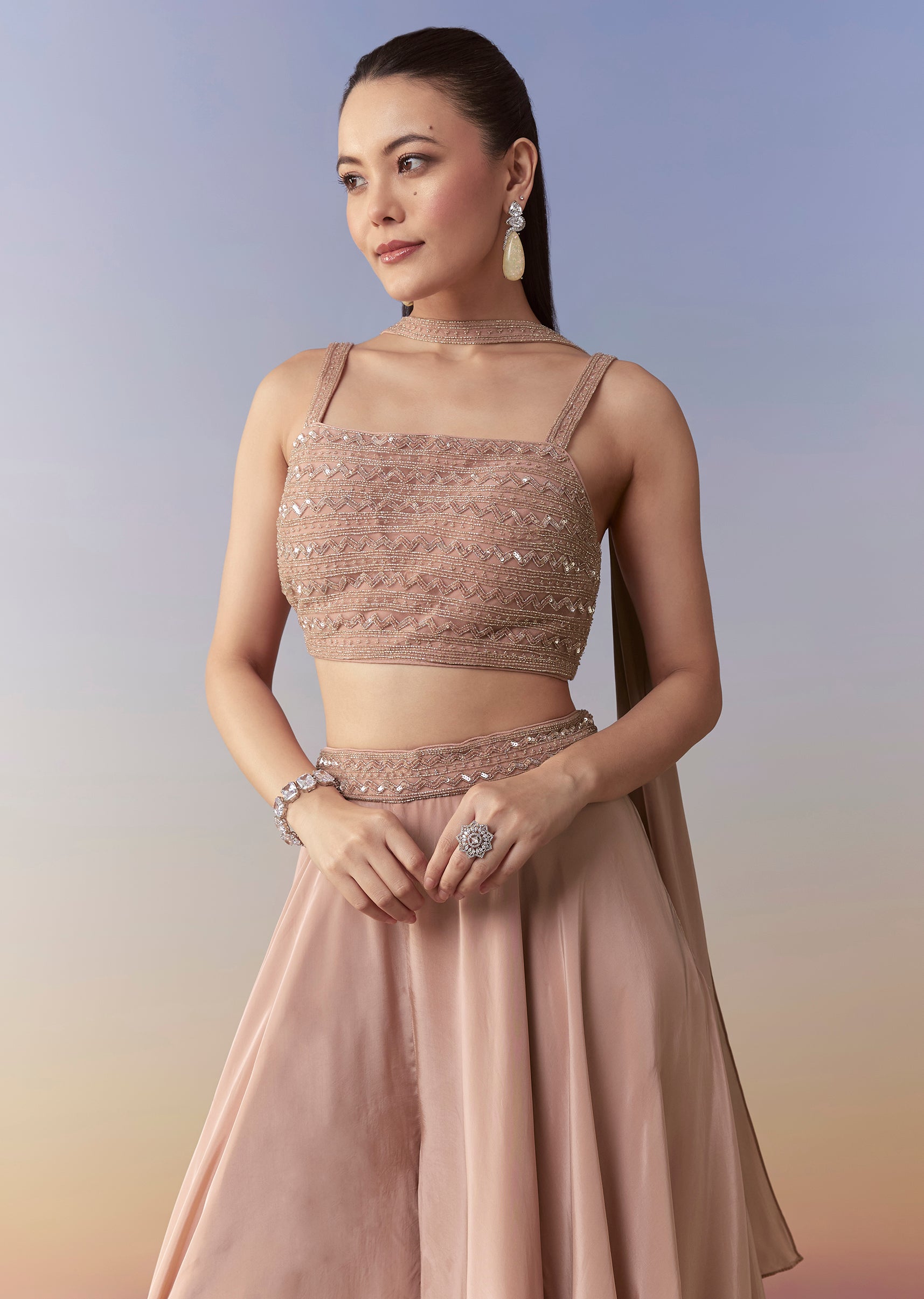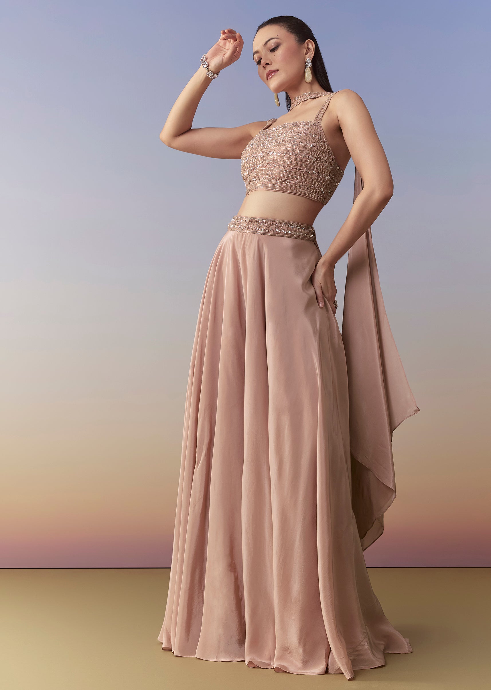 Embrace soft festive charm with this peach palazzo set, featuring a beautifully embellished crop top detailed with cutdana and sequin work for a delicate shimmer. The matching choker-style dupatta adds... More Product Details