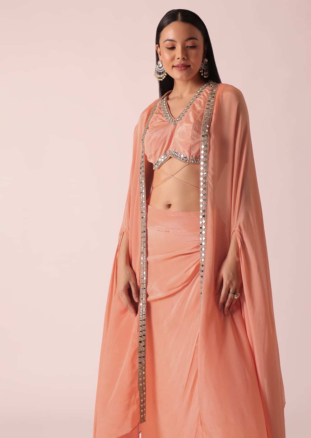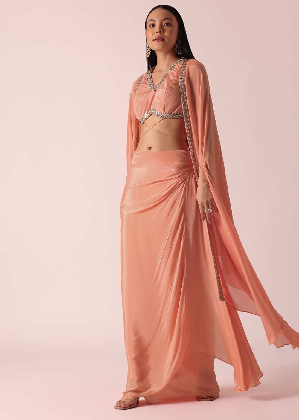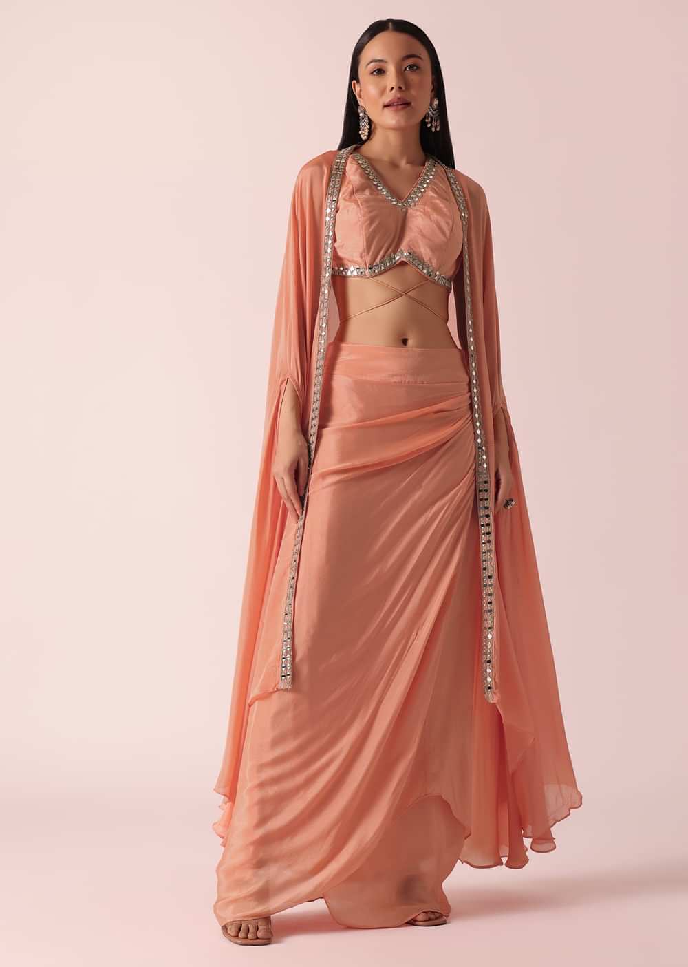 Meet your new favourite indofusion set that you will love to flaunt at the next destination wedding. This threepiece set has a stylish frontopen jacket and sleeveless blouse decked in mirrors and bead work. Made from smooth chiffon and finished in a soothing peach hue it is accompanied with a stellar dhoti that wraps beautifully over your figure. Awarded As The Most Trusted Brand We'Re Delivering Styles You Love Just As Promised.