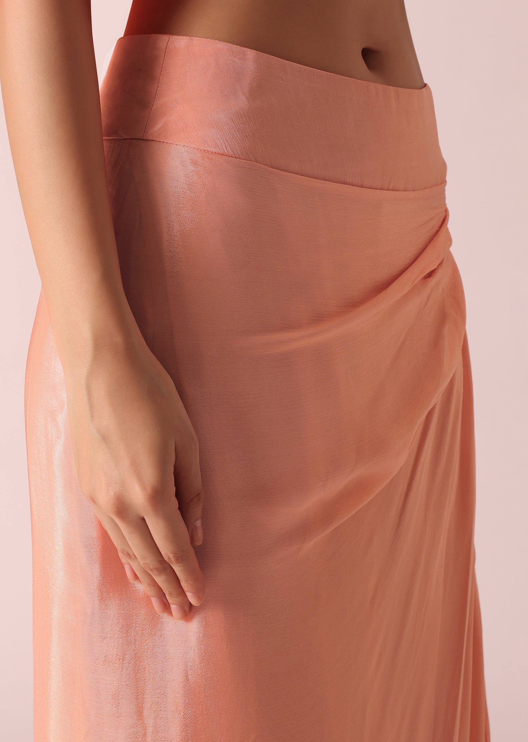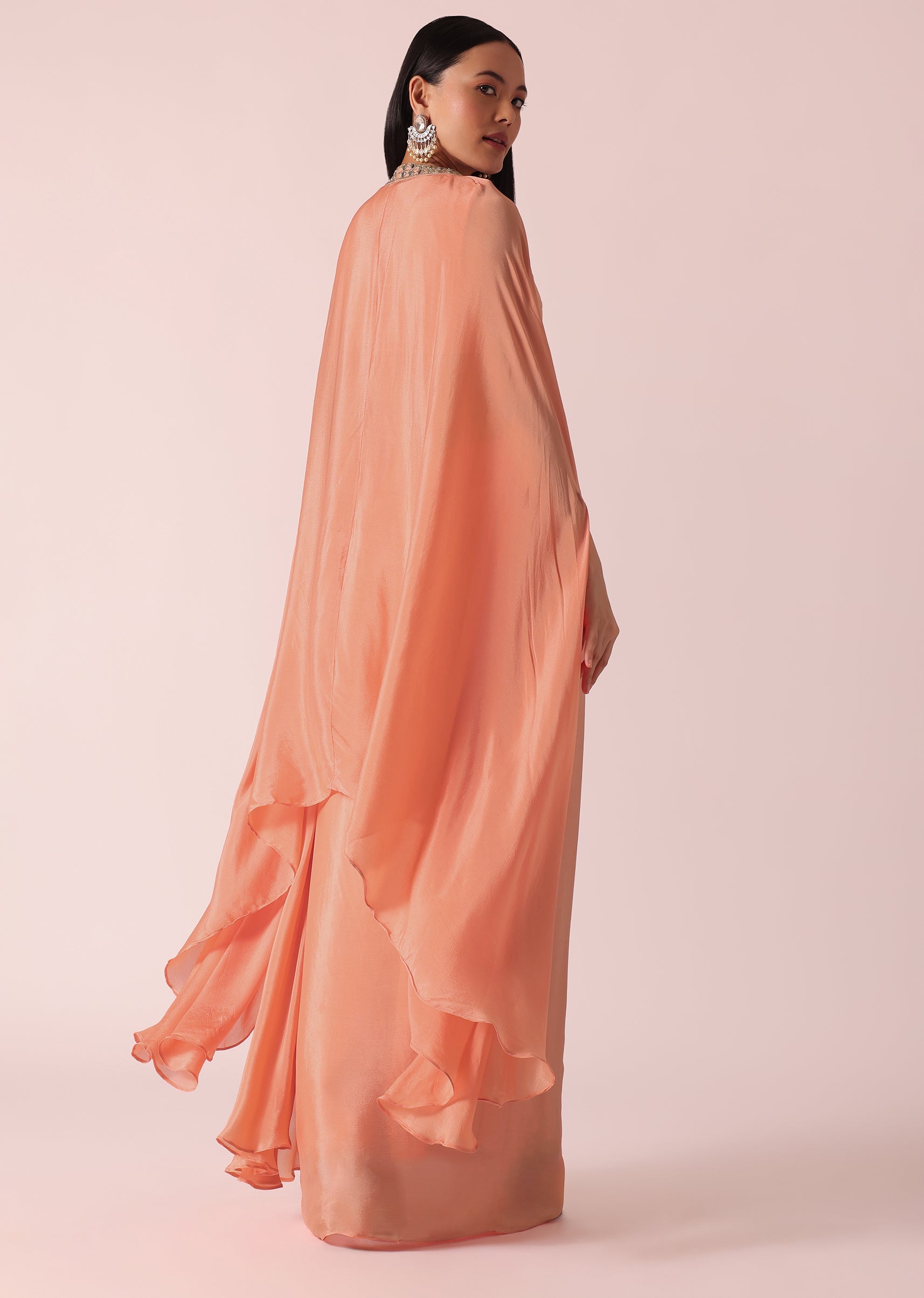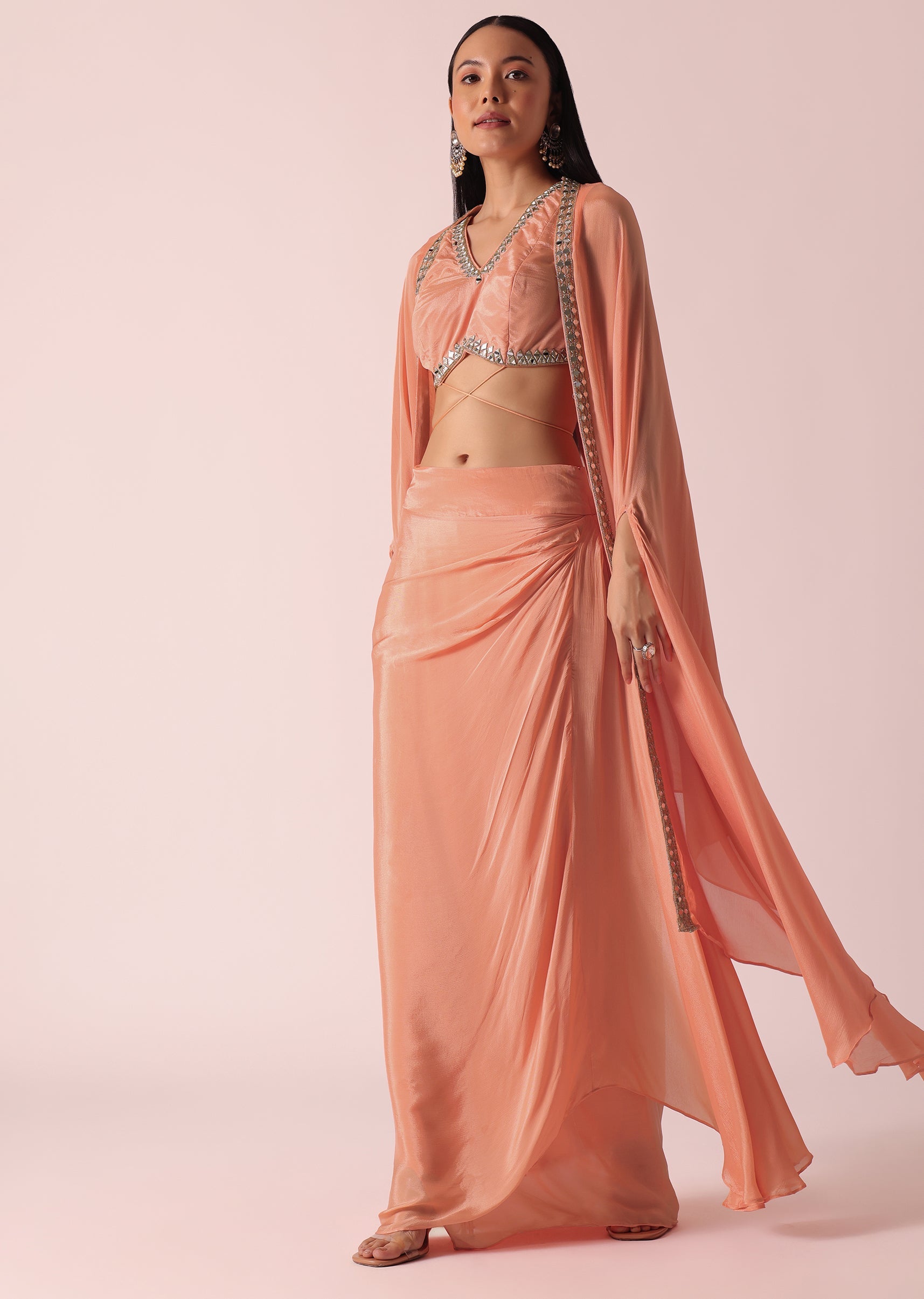 Meet your new favourite indofusion set that you will love to flaunt at the next destination wedding. This threepiece set has a stylish frontopen jacket and sleeveless blouse decked in mirrors and bead work. Made from smooth chiffon and finished in a soothing peach hue it is accompanied with a stellar dhoti that wraps beautifully over your figure. Awarded As The Most Trusted Brand We'Re Delivering Styles You Love Just As Promised.