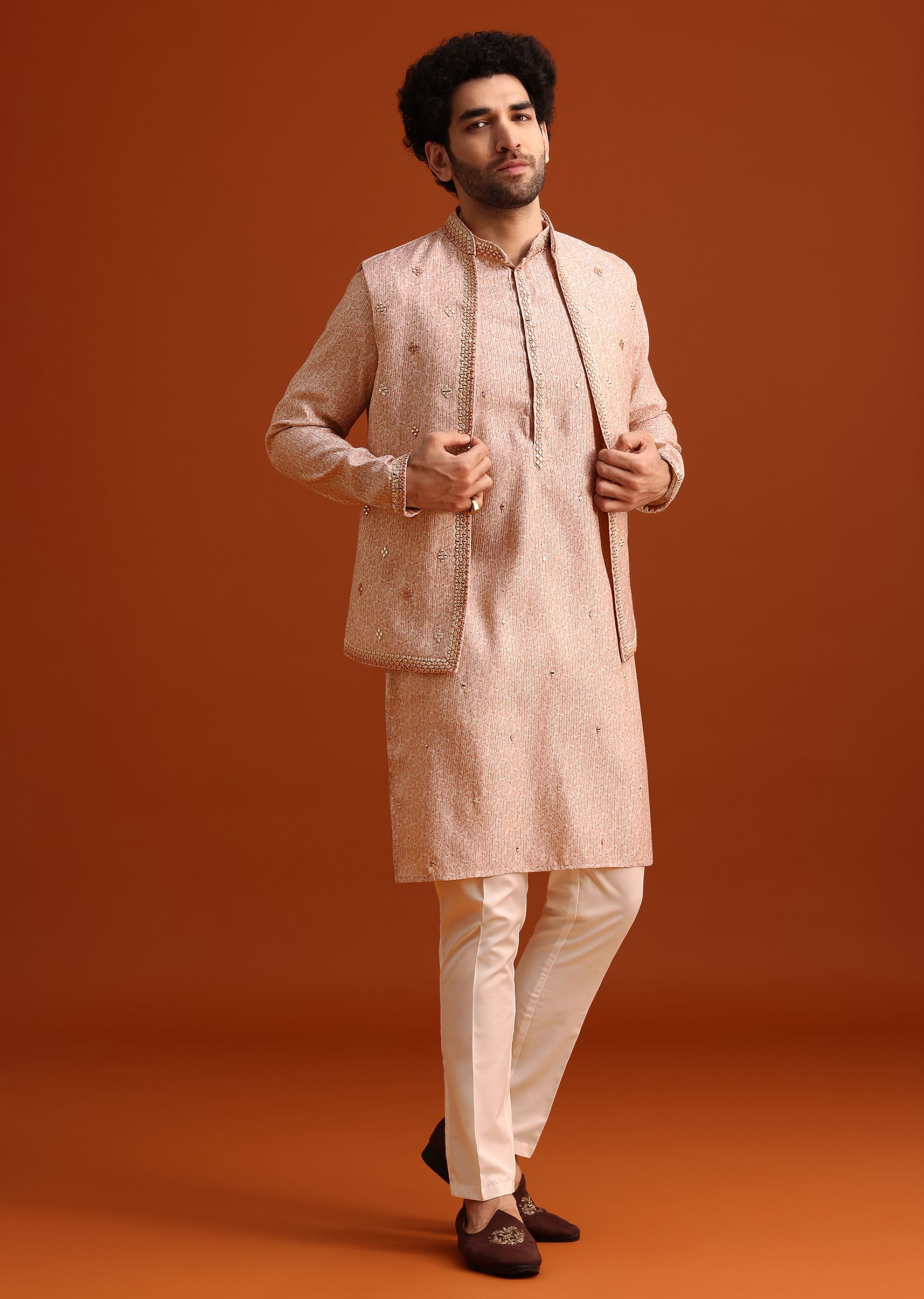 Dazzle and shine all through festive celebrations and wedding functions in this stellar kurta and jacket set. Designed with a front hookeye placket and mandarin collar the jacket is adorned with gleaming mirror work. Elevated with striking prints this set is paired with a kurta and coordinating pants. Awarded as the Most Trusted Brand, we're delivering styles you love, just as promised.
