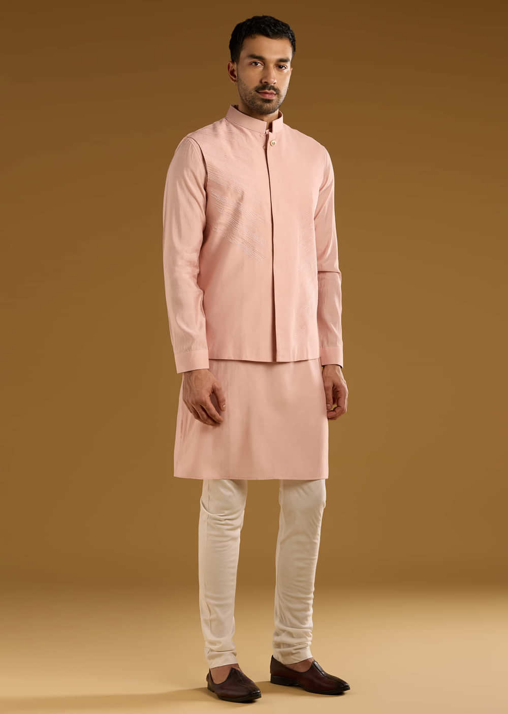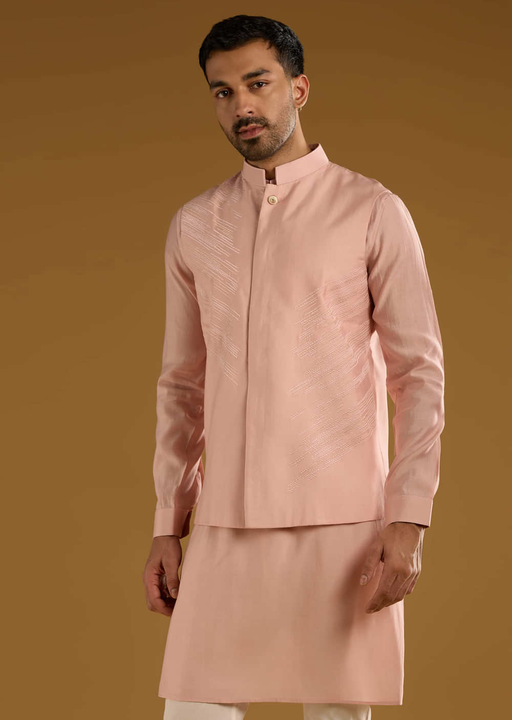 Peach Kurta Jacket Set For Men With Thread Embroidery
