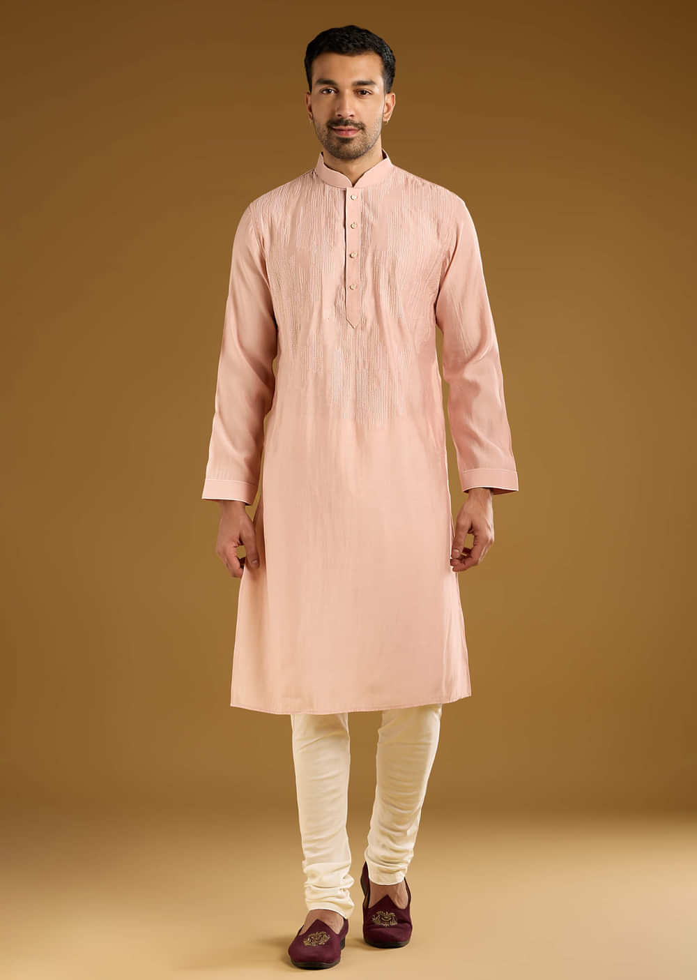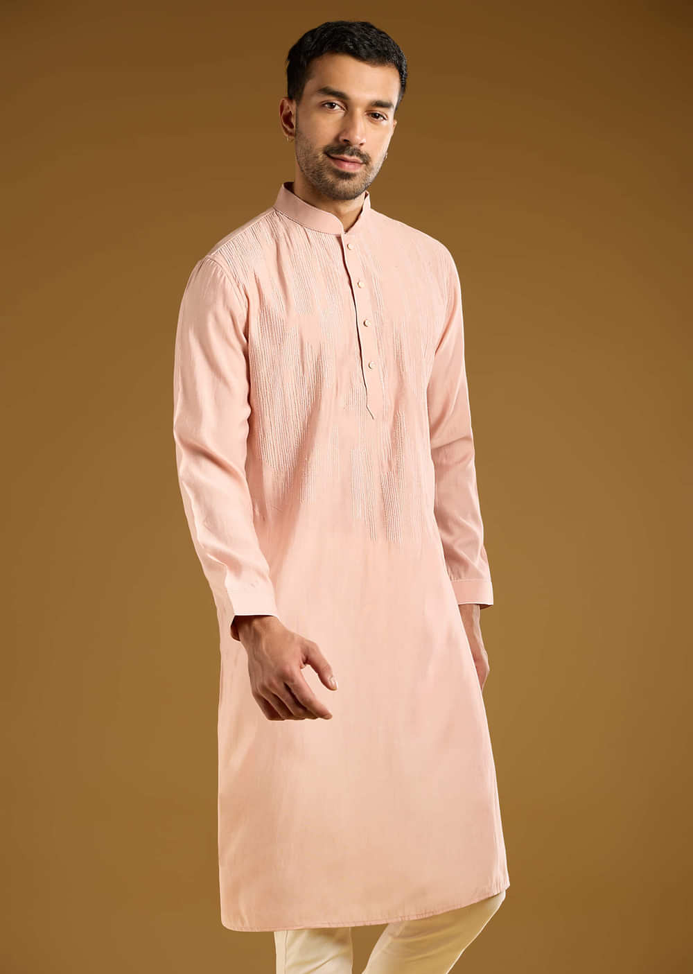 Soft and easy, this peach men’s kurta set in viscose carries thread resham work that adds fine definition at the collar and front. The drape stays cool and comfortable for... More Product Details