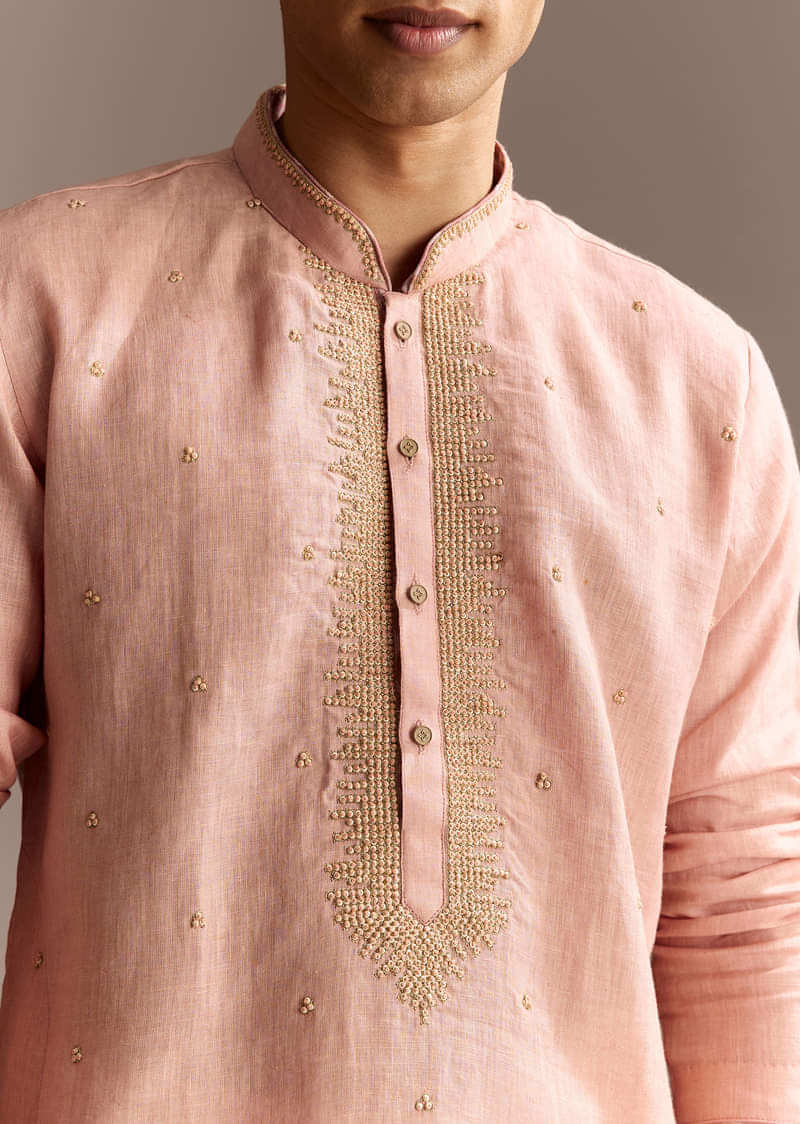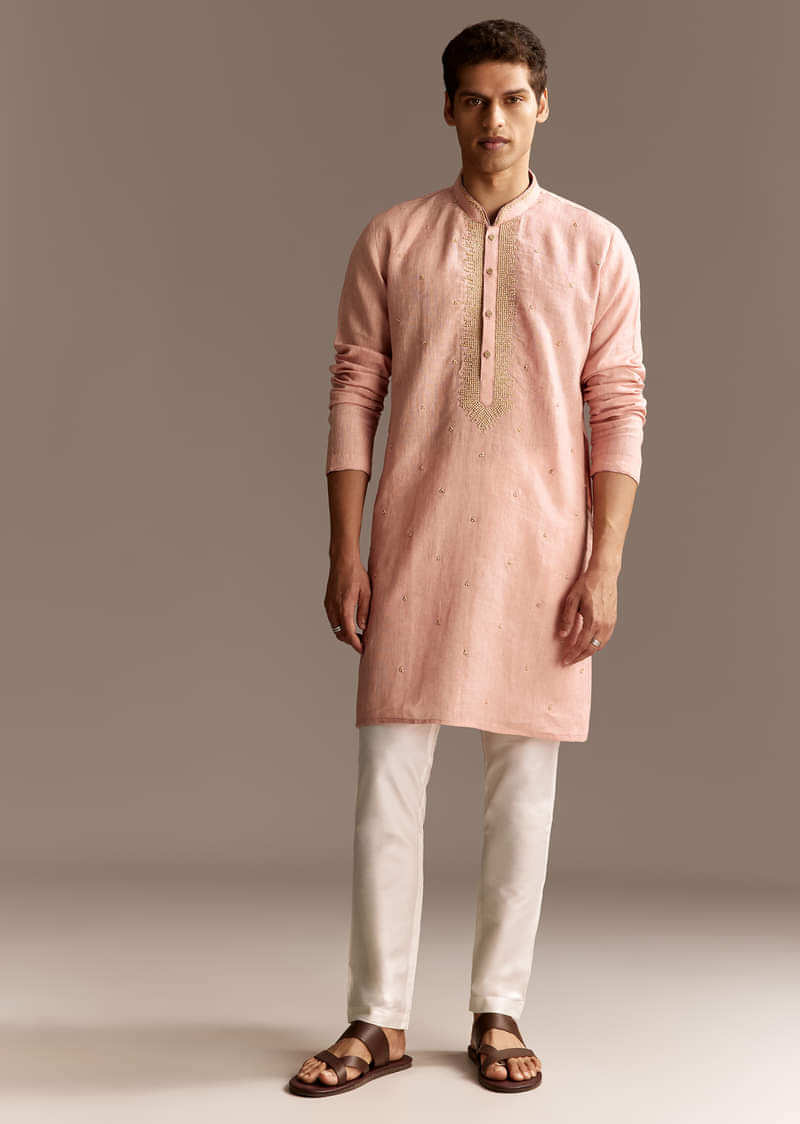 Delicately detailed with French knot embroidery, this linen kurta set in peach is soft, breathable, and charmingly festive. A go-to for poojas or intimate mehendi events. Awarded as the Most... More Product Details