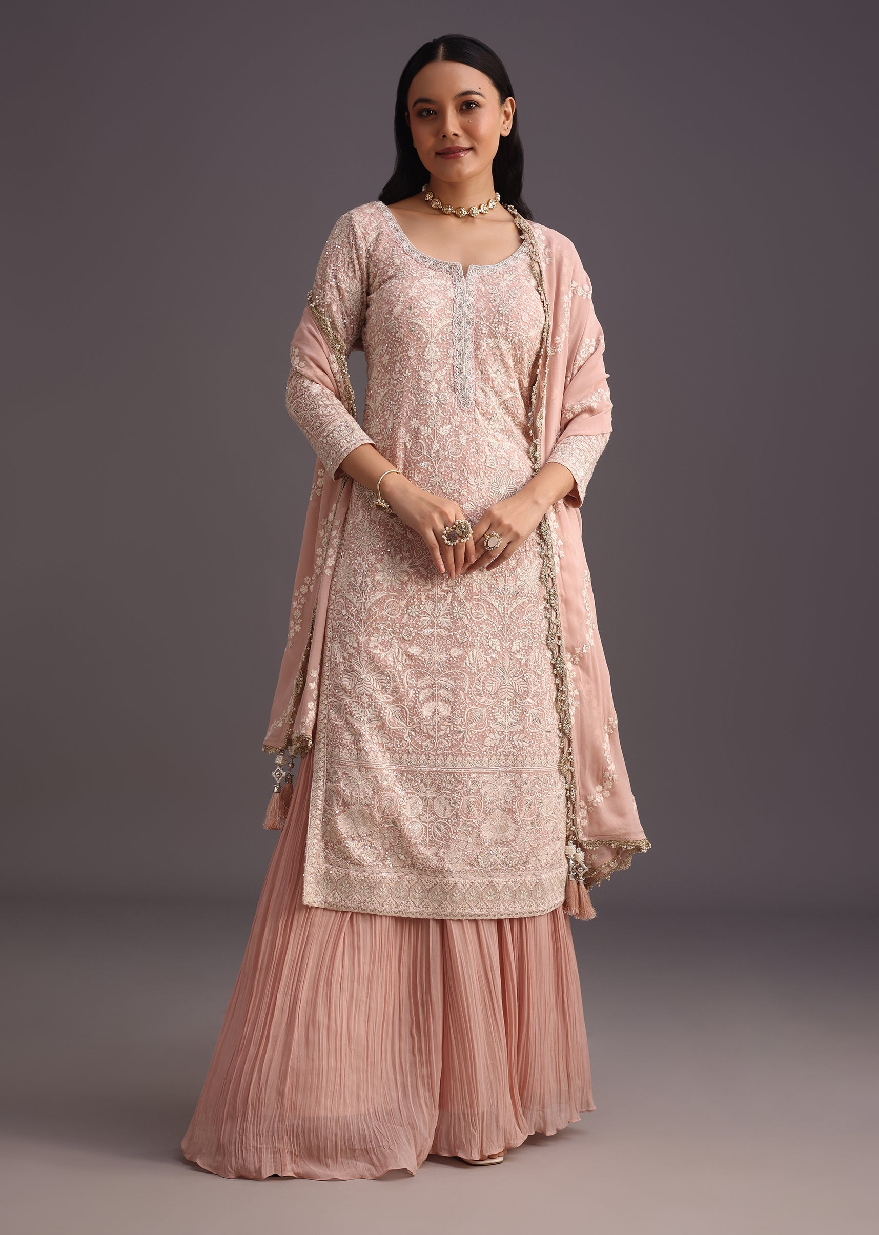 Peach Lucknowi Work Kurta Set With Flared Palazzo And Resham Dupatta