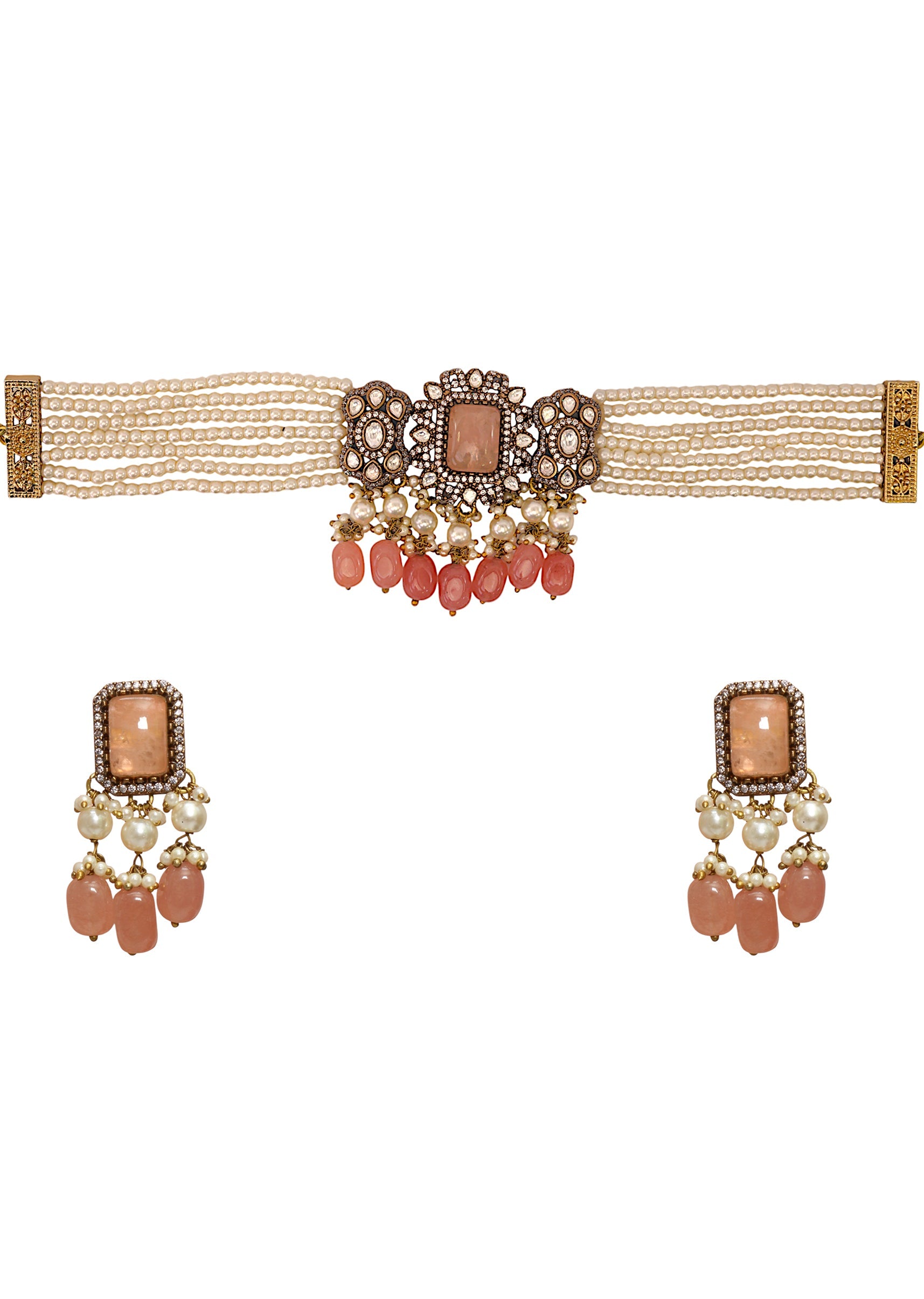 Peach Modern Polki Geometric Pendant Necklace and Earrings Set