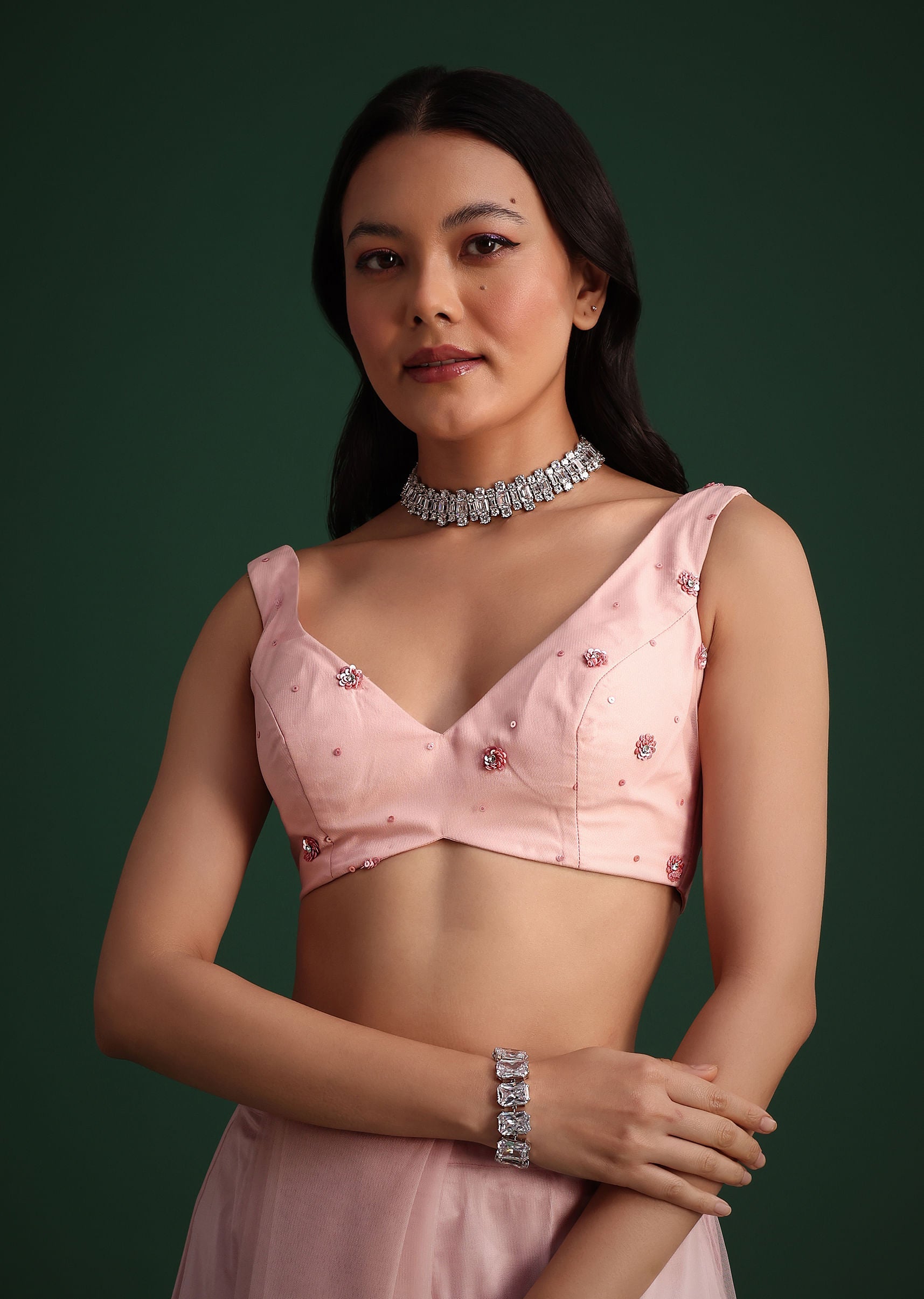 For a look that’s all about soft glamour this pink net saree with cutdana and sequin embroidery is the perfect choice. The delicate net fabric and subtle sparkle make it... More Product Details