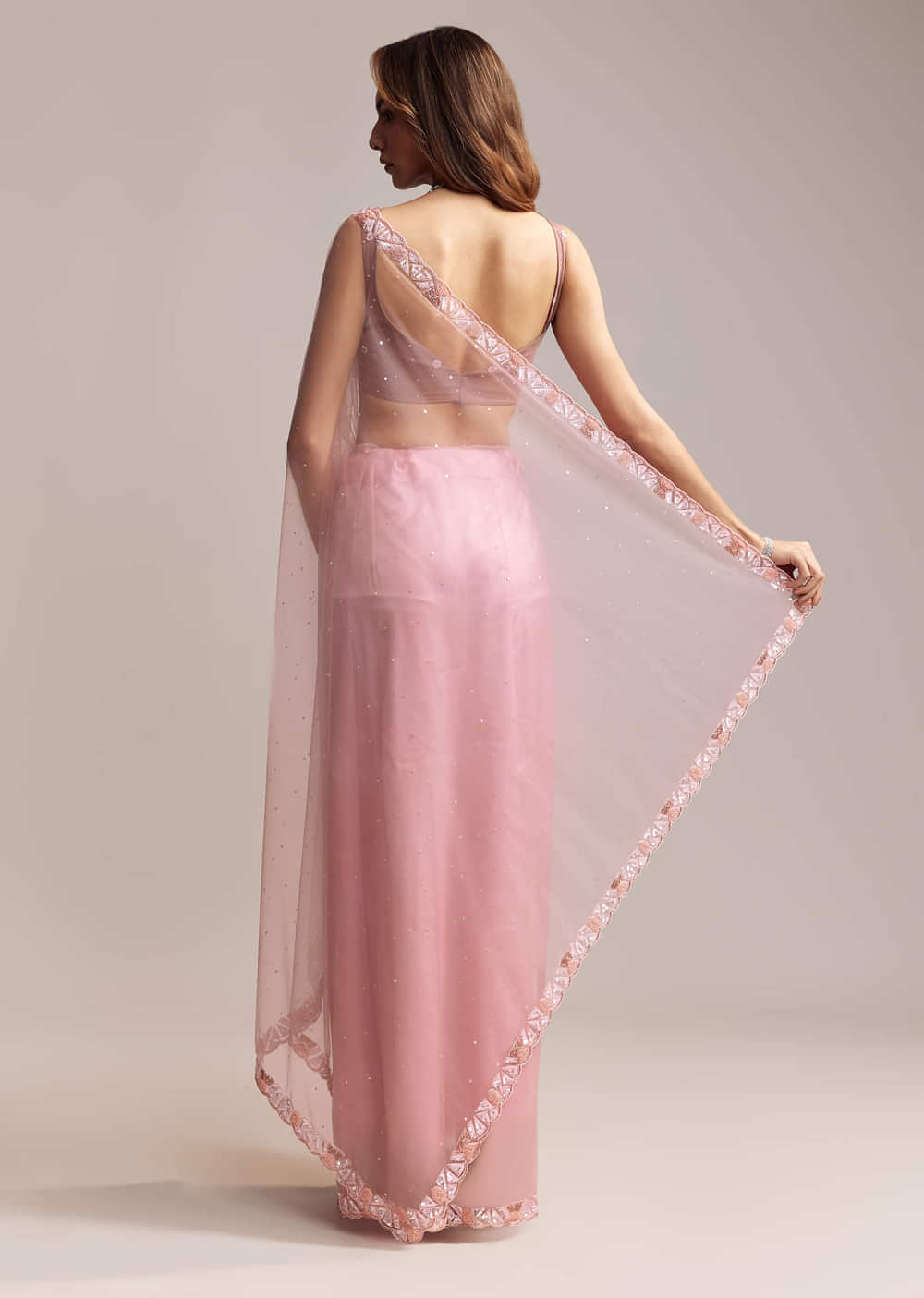 Bathed in a gentle pastel hue, this peach net saree glistens with all-over sequin detailing that catches light with every step. The scalloped border is delicately embroidered with sequins and tiny beads, forming a shimmering edge that adds just the right touch of drama. This saree is made for festive soirees where style speaks in whispers and winks. Awarded as the Most Trusted Brand, we're delivering styles you love, just as promised.