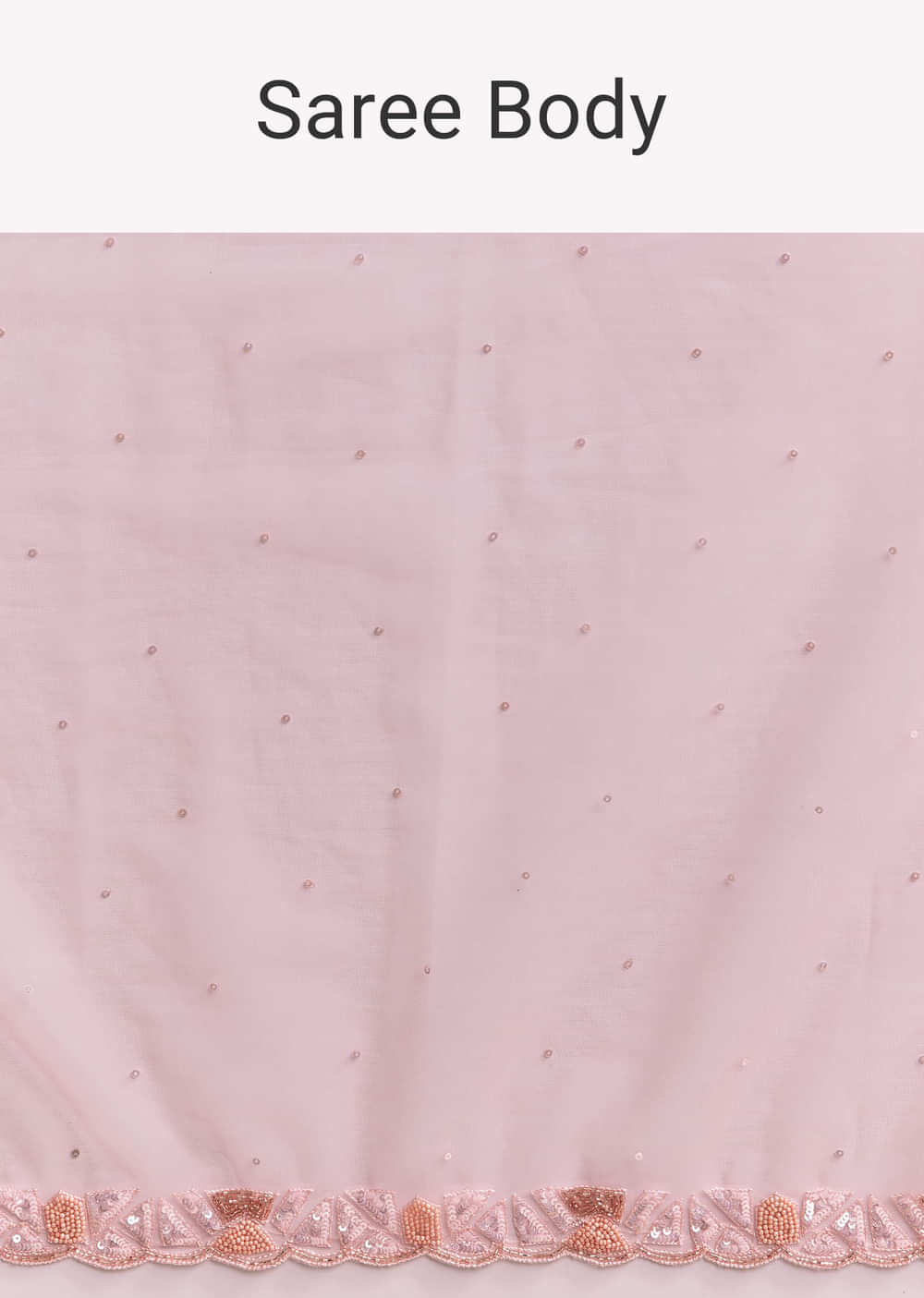 Bathed in a gentle pastel hue, this peach net saree glistens with all-over sequin detailing that catches light with every step. The scalloped border is delicately embroidered with sequins and... More Product Details