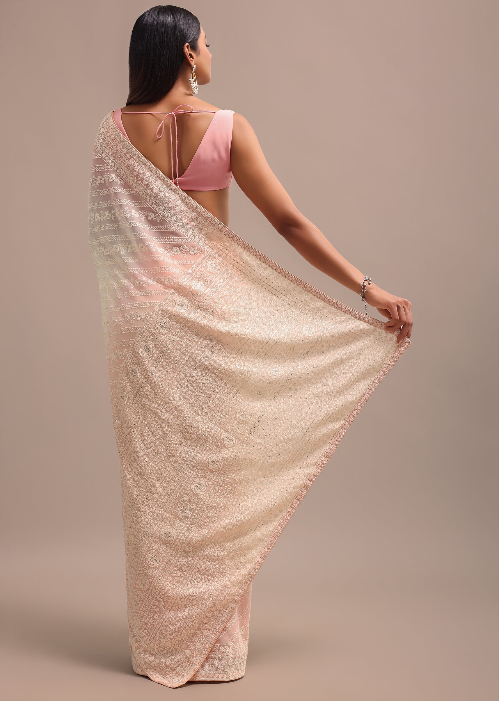 Embrace the sunset in our peach saree. This captivating saree embodies the gentle hues of a summer sunset. Crafted from lightweight georgette, it features a mesmerizing transition of color, with a soft peach shade delicately blending. The intricate chikankari embroidery, meticulously hand-stitched in a complementary thread color, creating a truly unique and breathtaking effect. And can be worn in social gatherings. The saree is paired with an unstitched blouse. Awarded As The Most Trusted Brand We'Re Delivering Styles You Love Just As Promised.