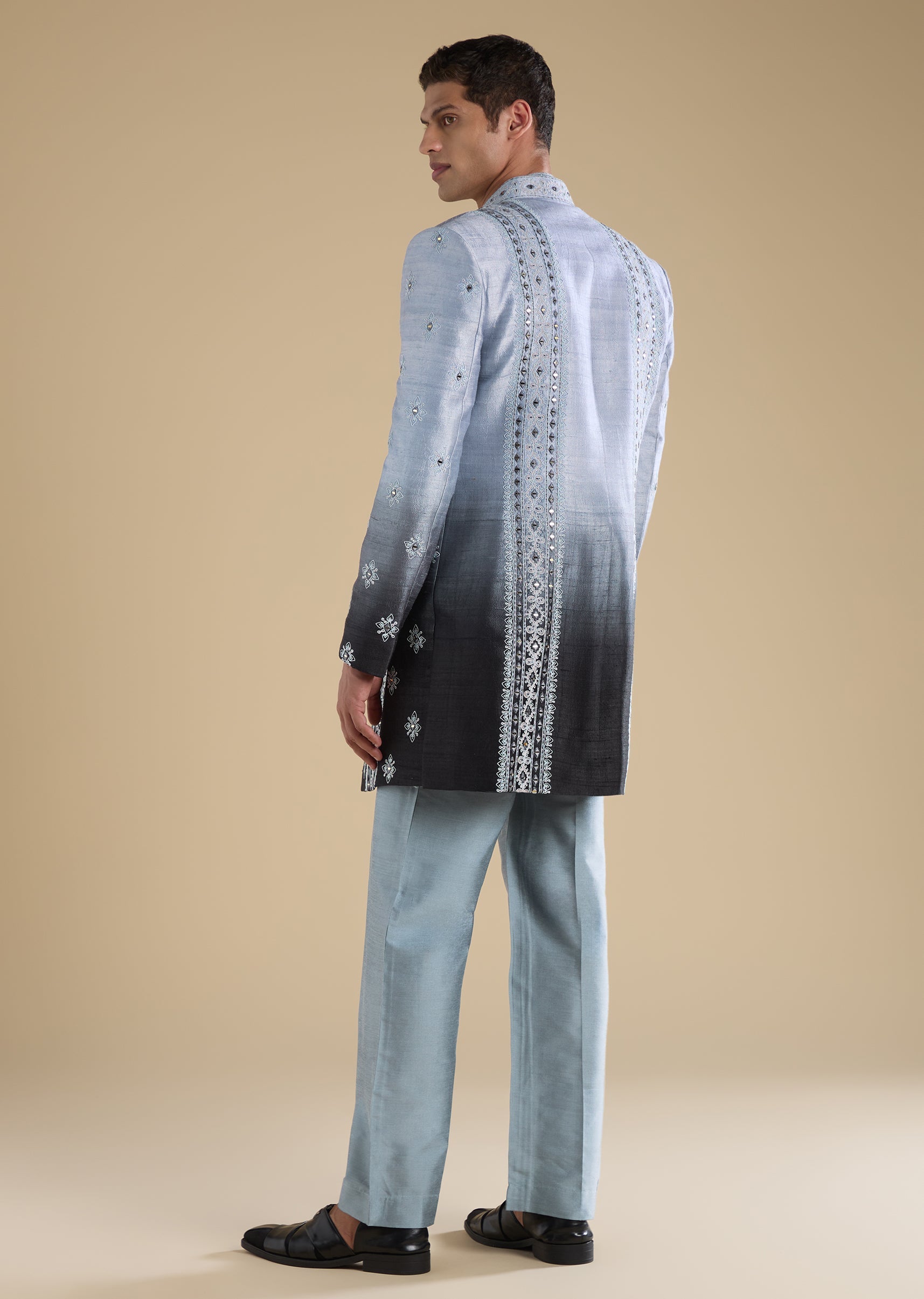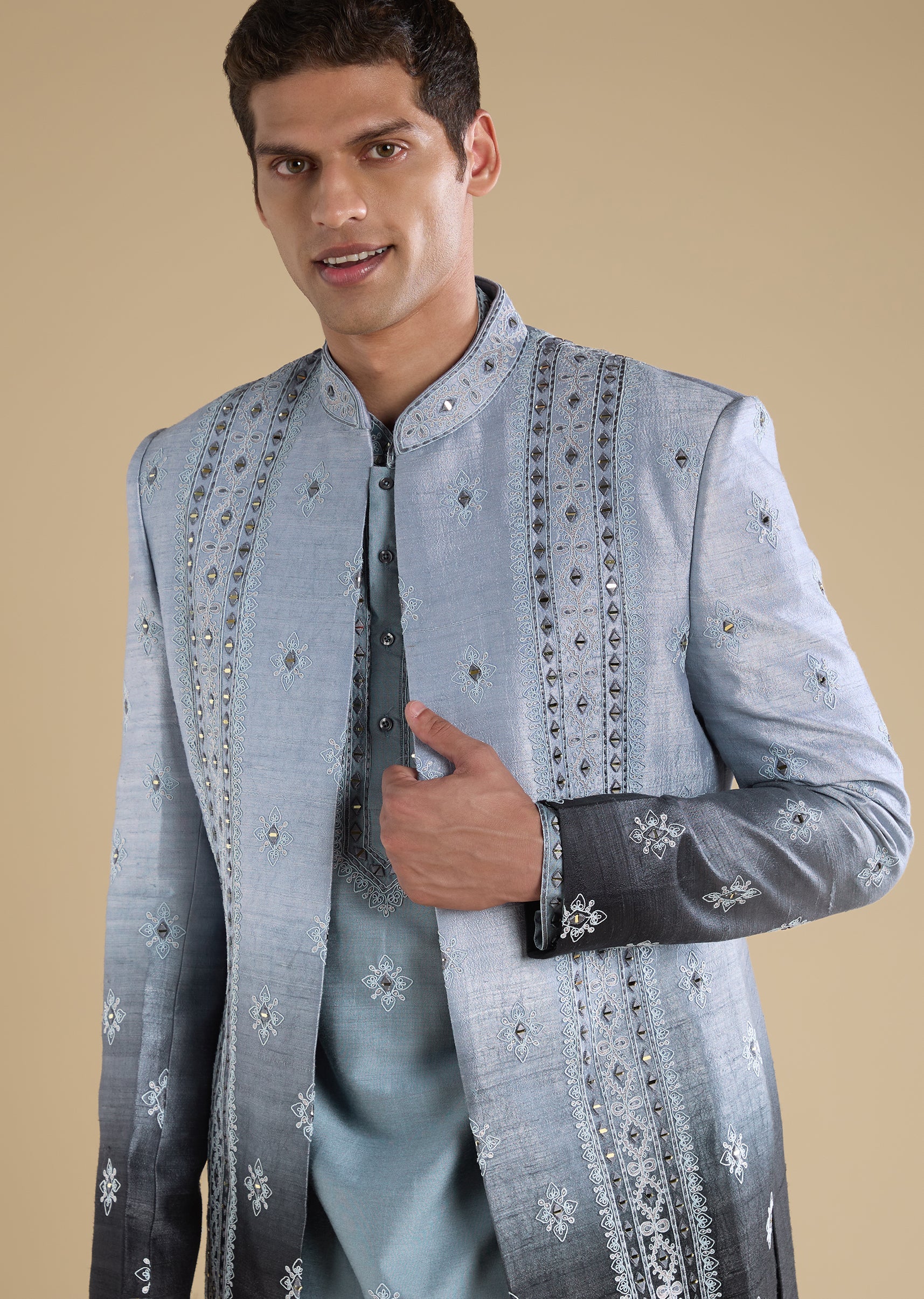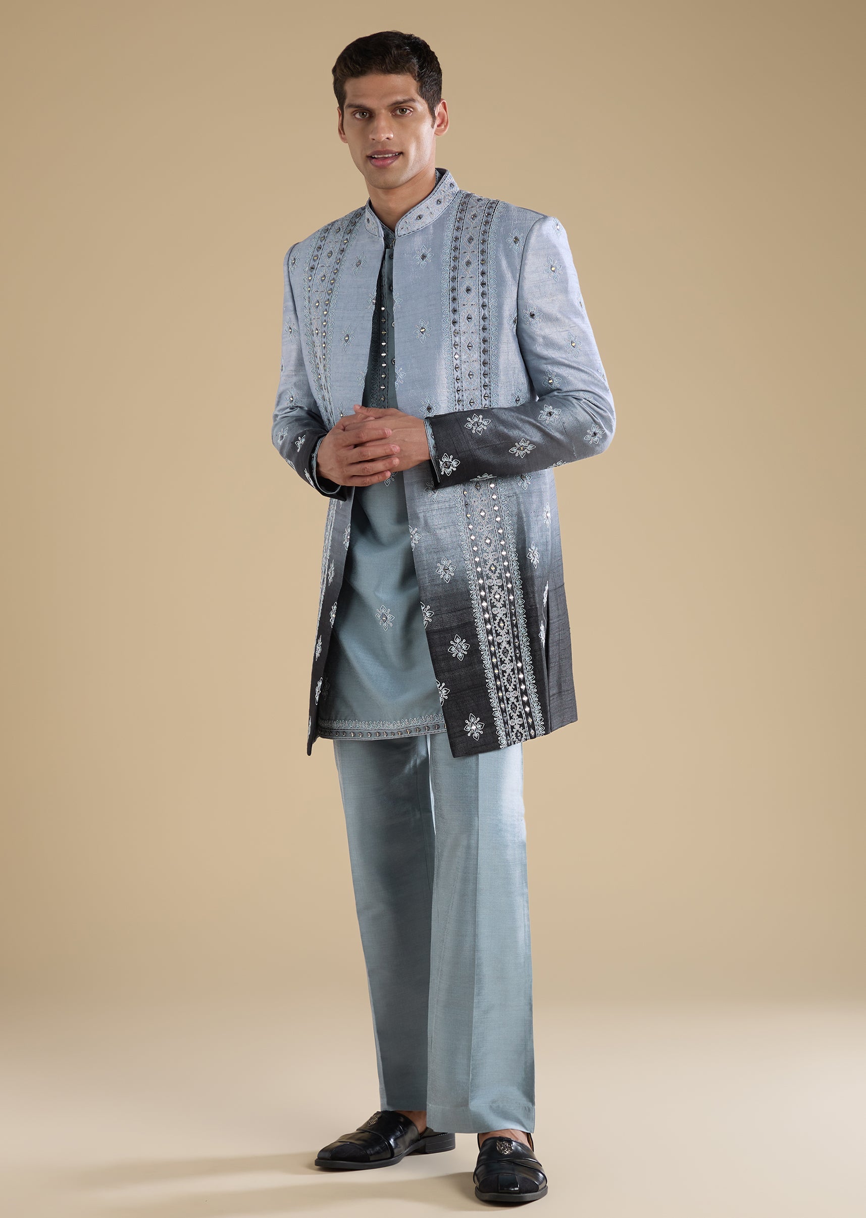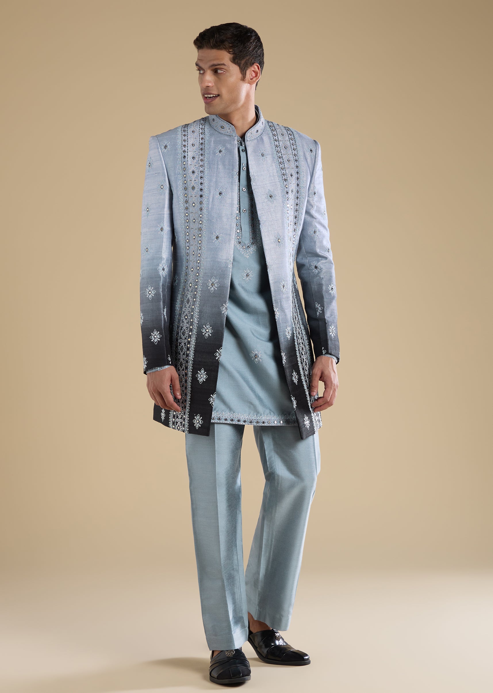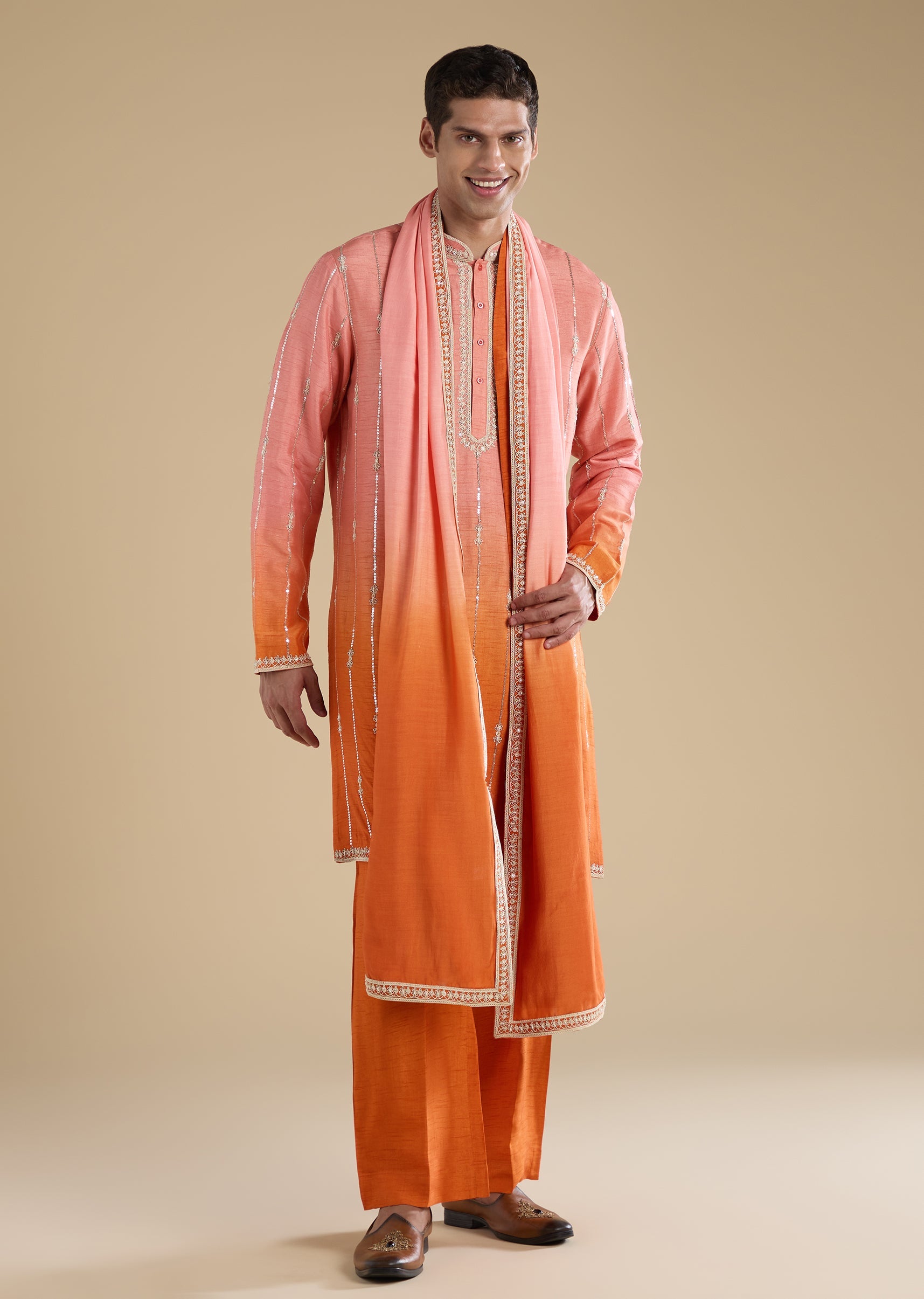 Crafted in a silk-blend, this peach kurta set features dori work with bead and sequin detailing. Designed with a mandarin collar, full sleeves and button with hook-eye closure, it comes with an embroidered dupatta and straight-fit mid-waist pants—ideal for mehendi, sangeet, haldi and wedding events. Awarded as the Most Trusted Brand, we're delivering styles you love, just as promised.