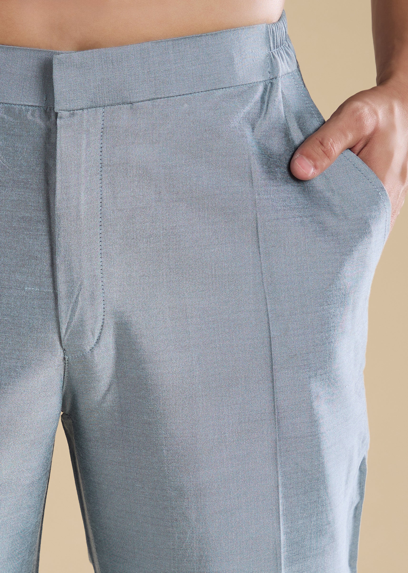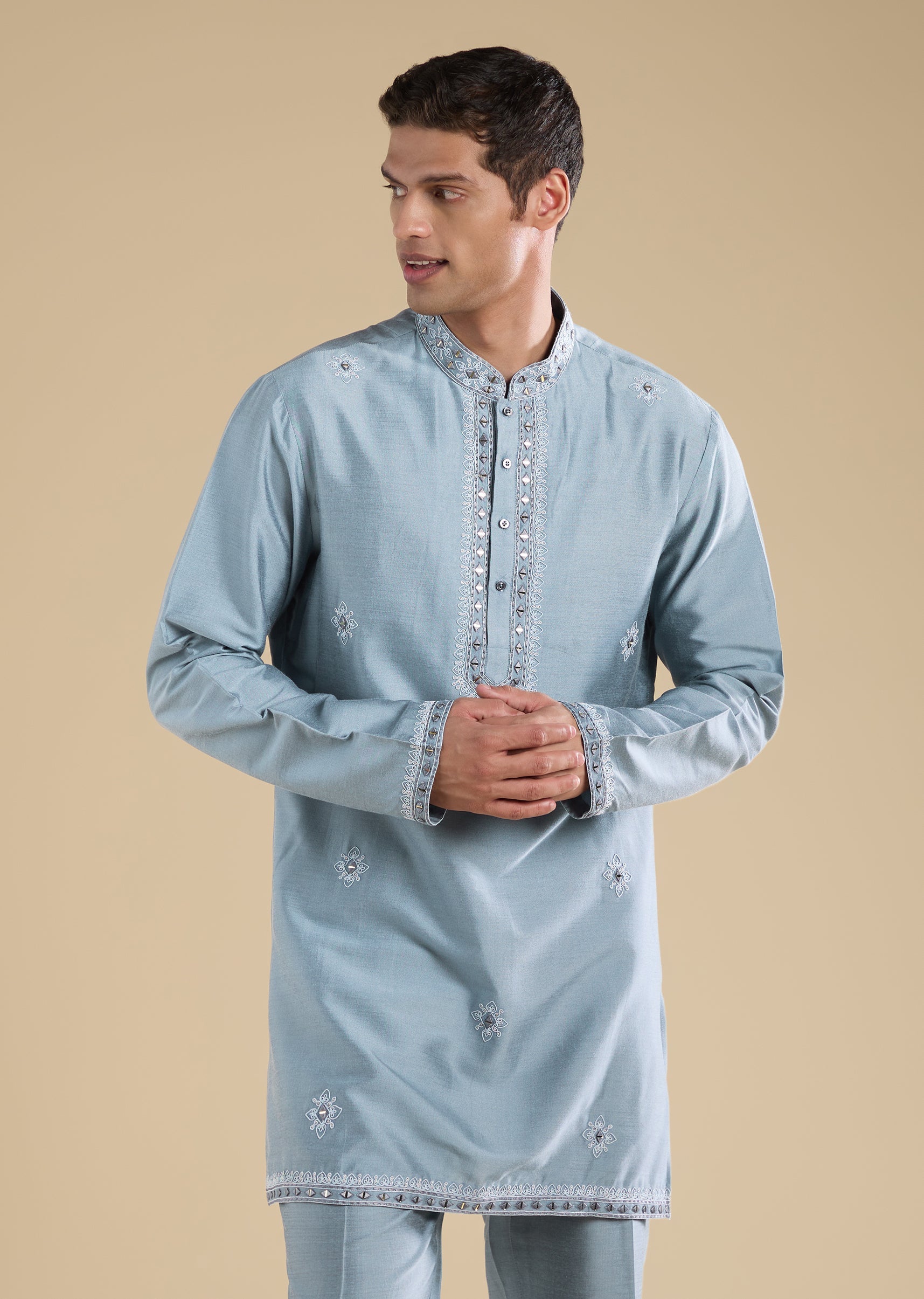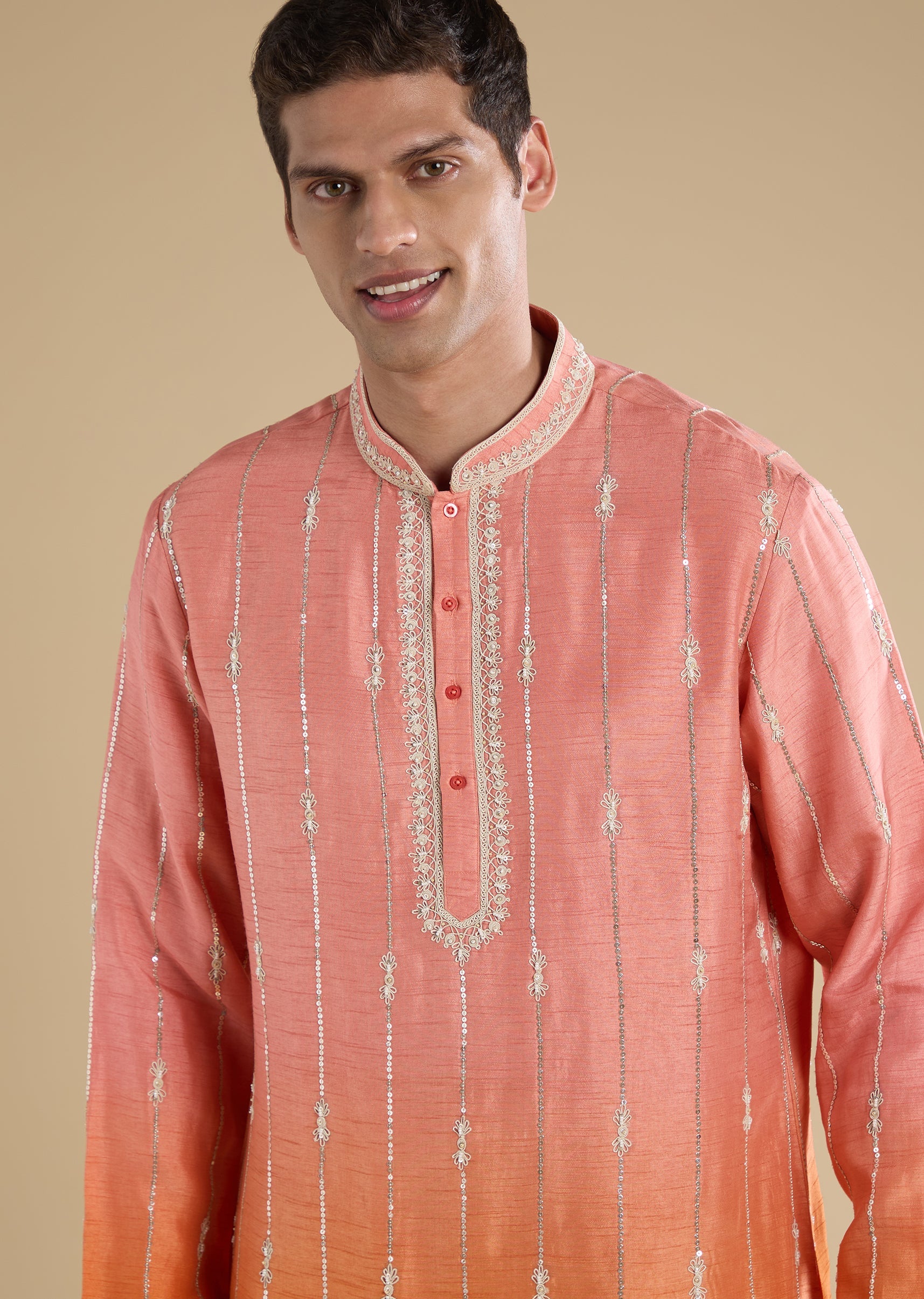 Crafted in a silk-blend, this peach kurta set features dori work with bead and sequin detailing. Designed with a mandarin collar, full sleeves and button with hook-eye closure, it comes... More Product Details