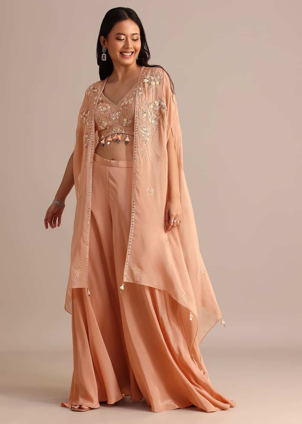 - Unveil elegance with this peach organza crop top and palazzo set.
