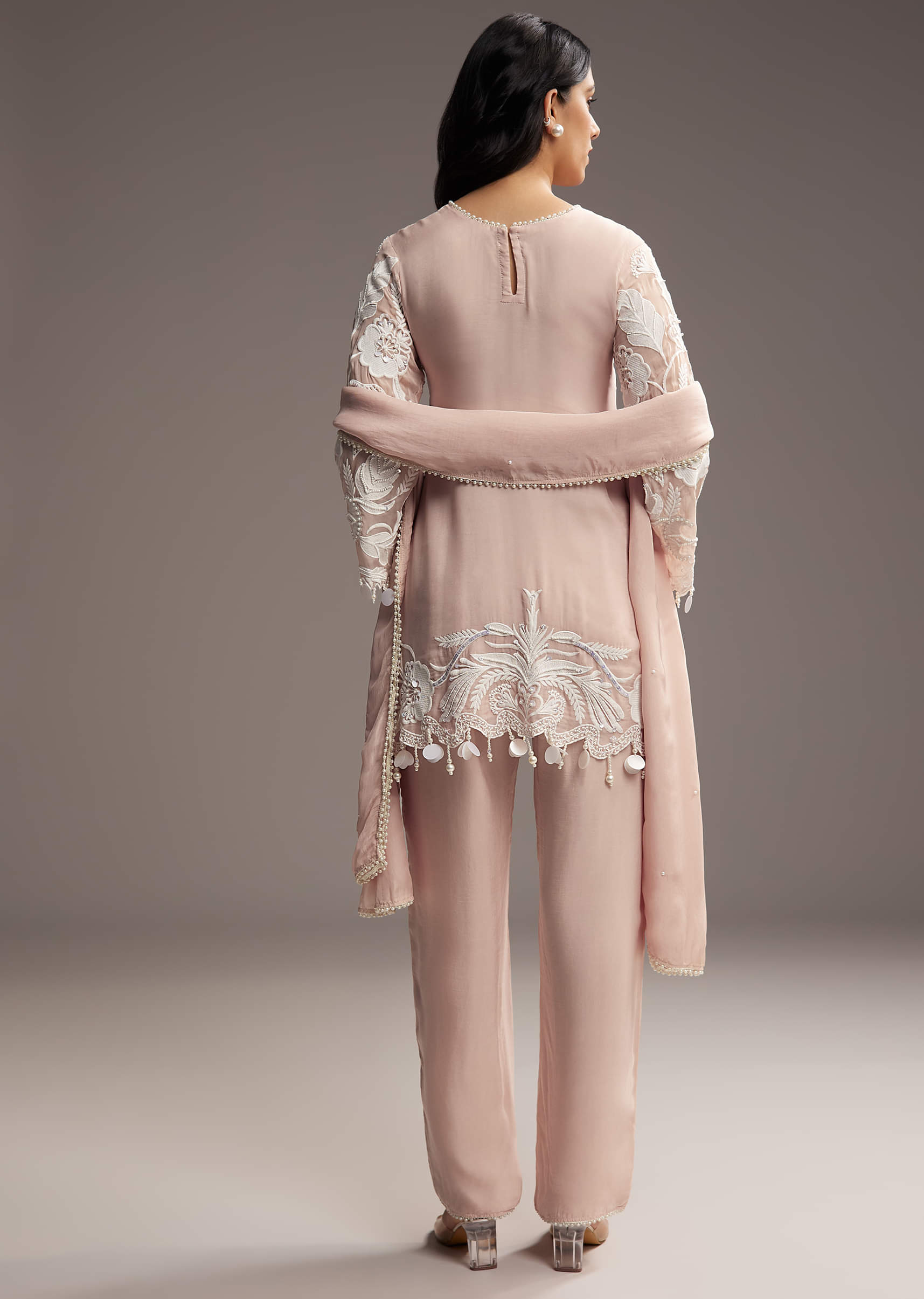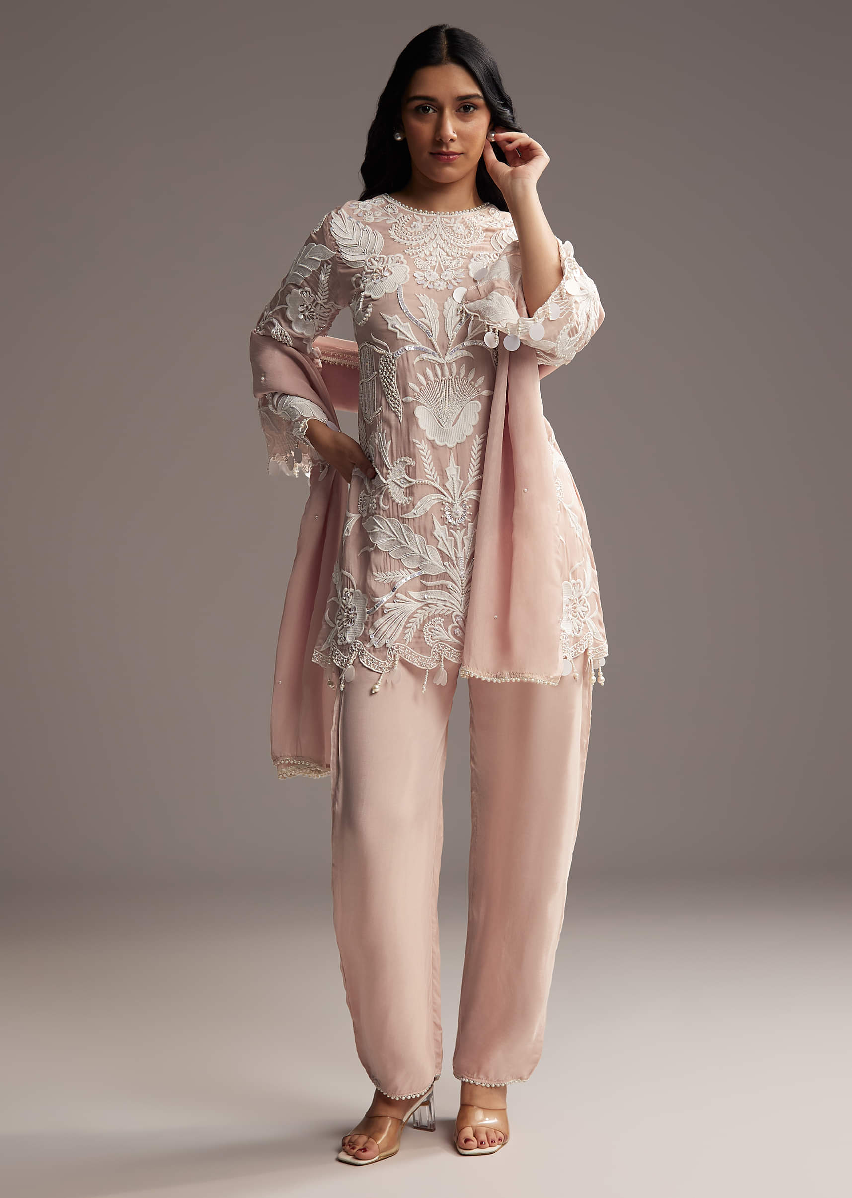 Light and graceful, this peach organza kurta set brings out festive elegance with delicate threadwork and a sprinkle of moti details. Its pastel tone lends a soft and serene vibe... More Product Details