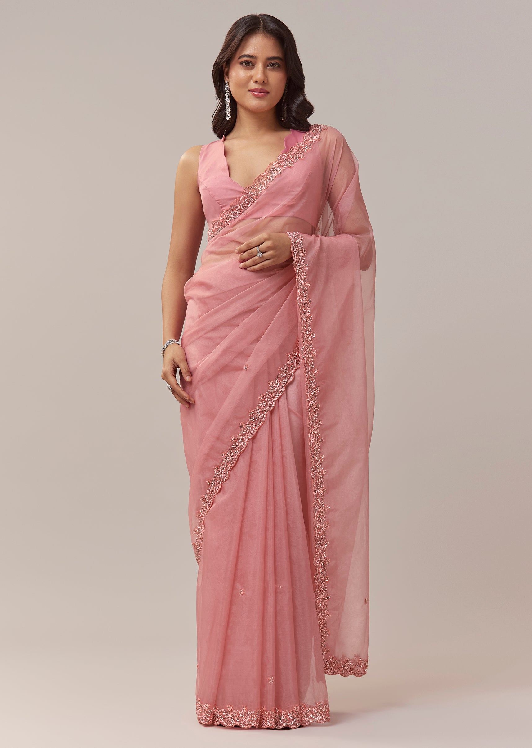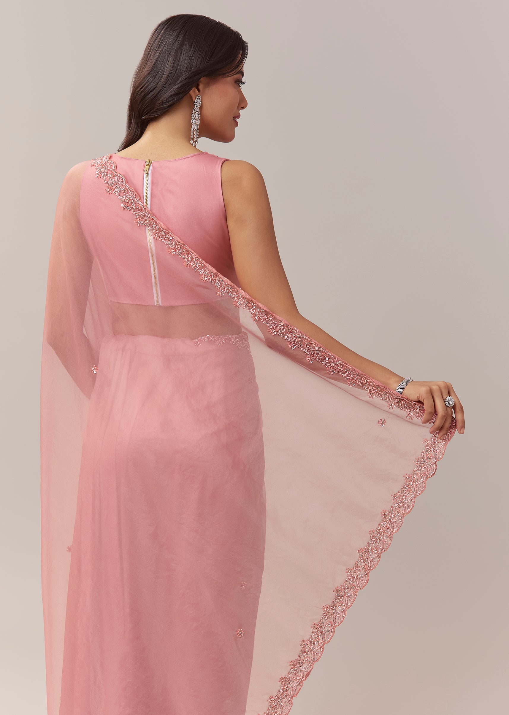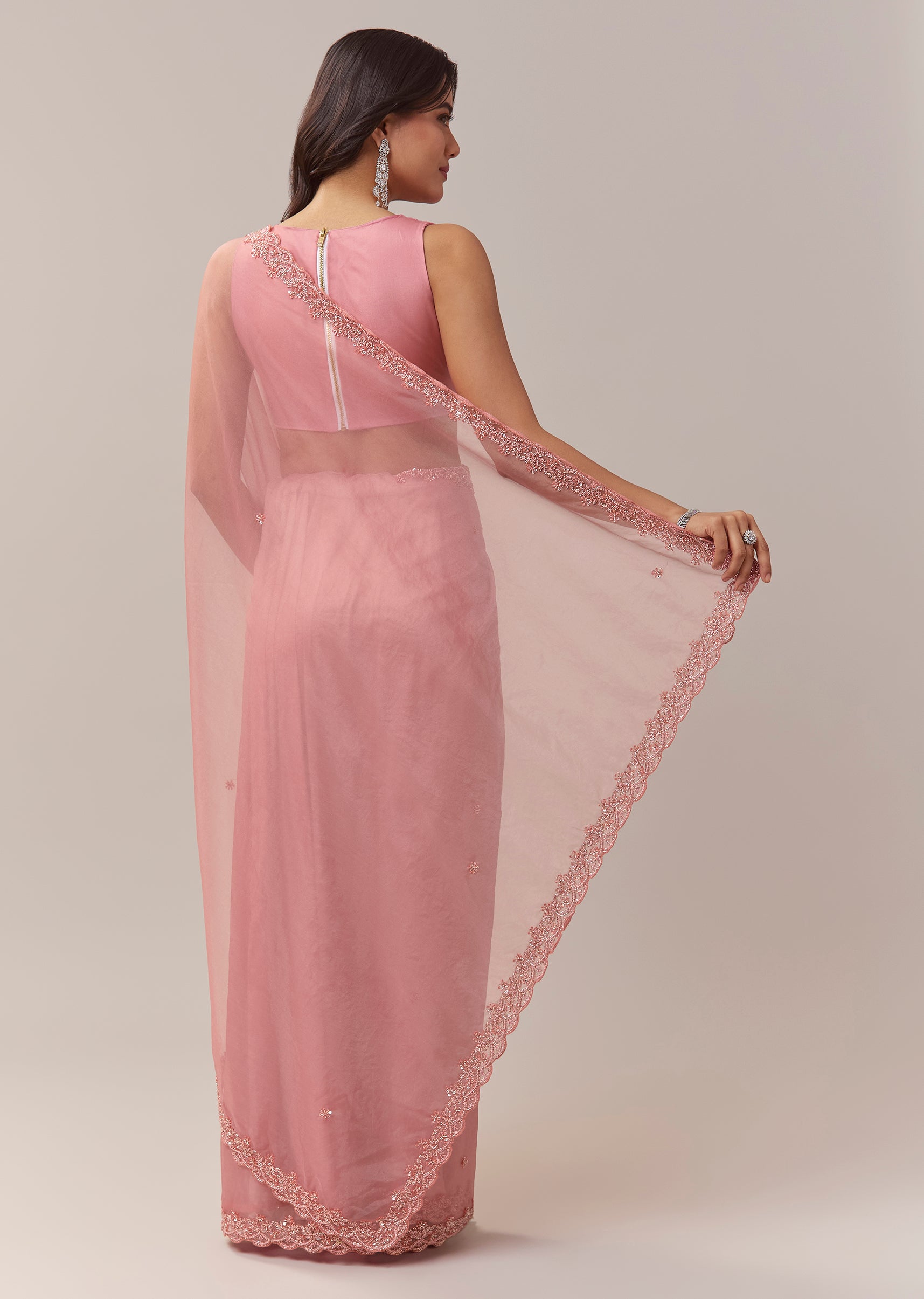 Peach Organza Saree With Scallop Border And Butti Embroidery