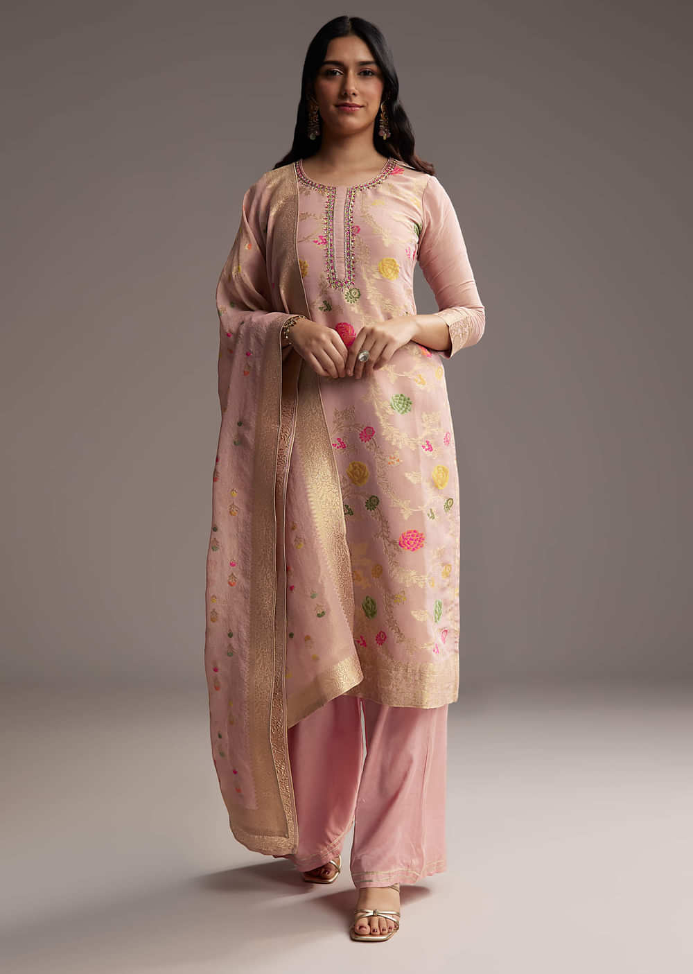 Grace meets tradition in this peach pink Banarasi tissue palazzo suit, where the gentle shimmer of the fabric pairs with a festive hue to create an understated standout. Ideal for... More Product Details