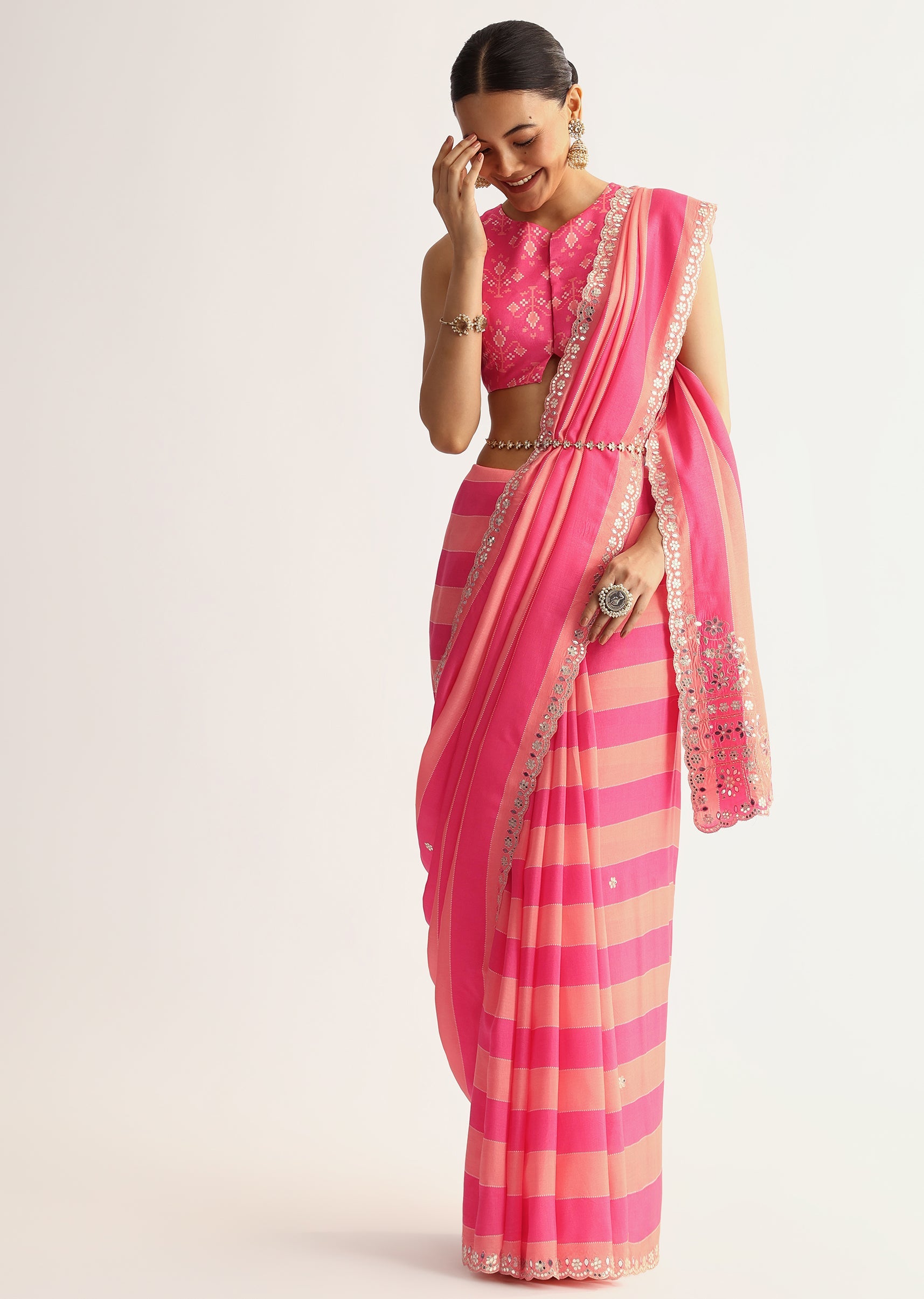 Peach Pink Mirrorwork Cutdana Work Georgette Saree