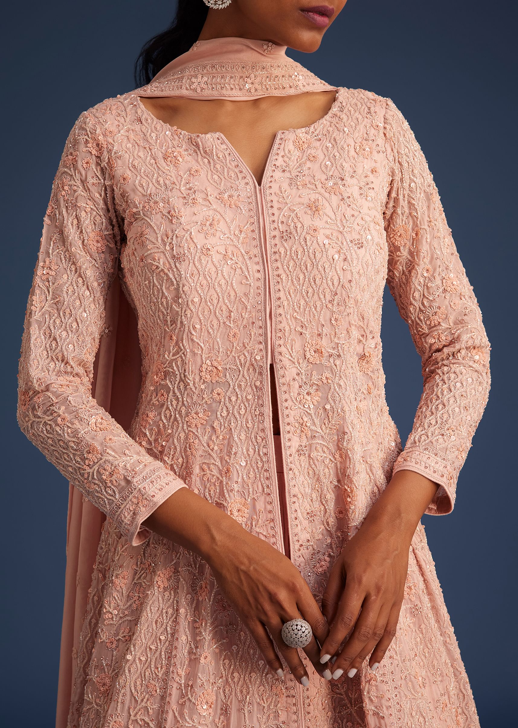 • Embrace Elegance With This Peach Pink Organza Kurta Set Adorned With Intricate Embroidery Featuring Cut Dana Sequins And Stone Embellishments.