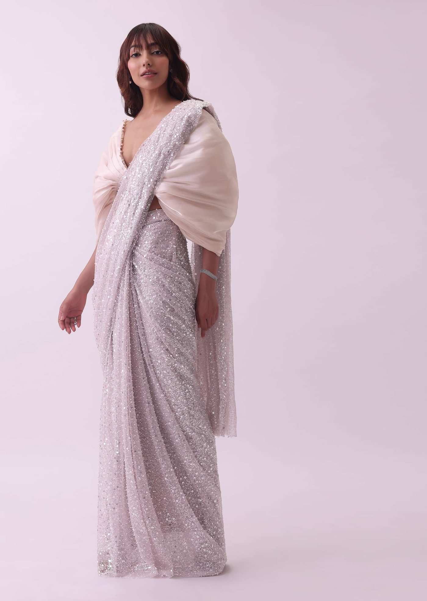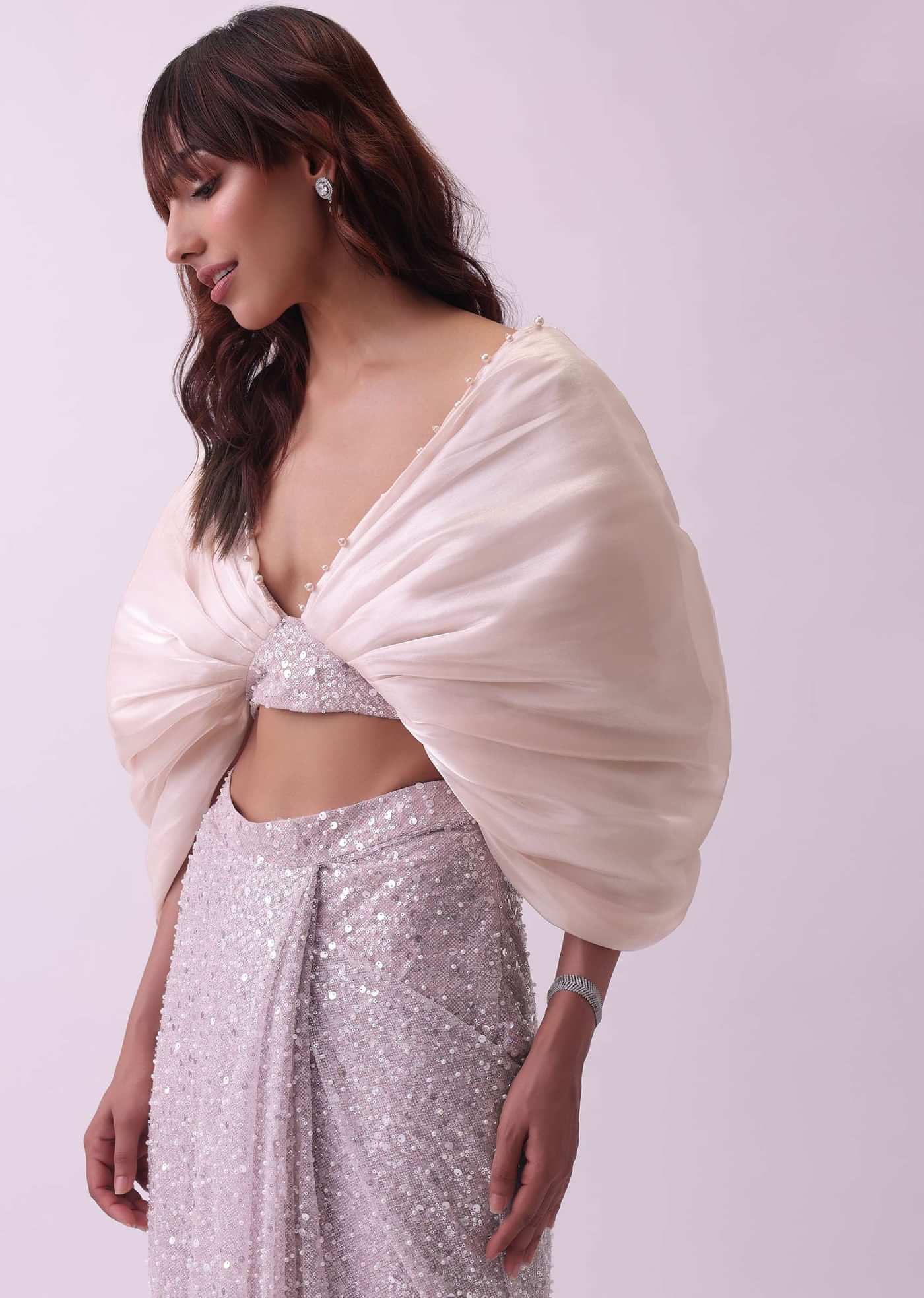 Peach Pink Pre-stitched Saree And Blouse With Pearl Embroidery
