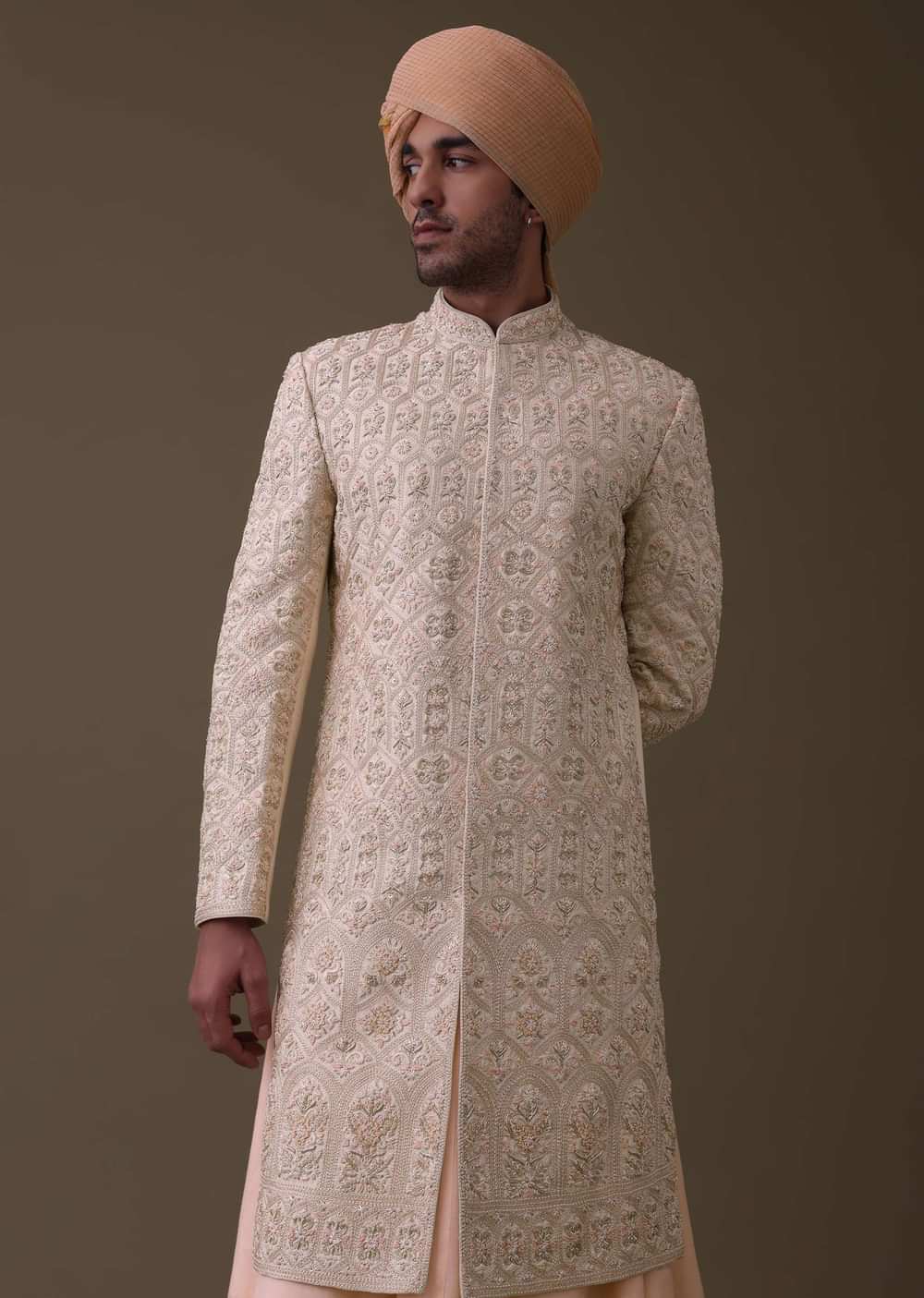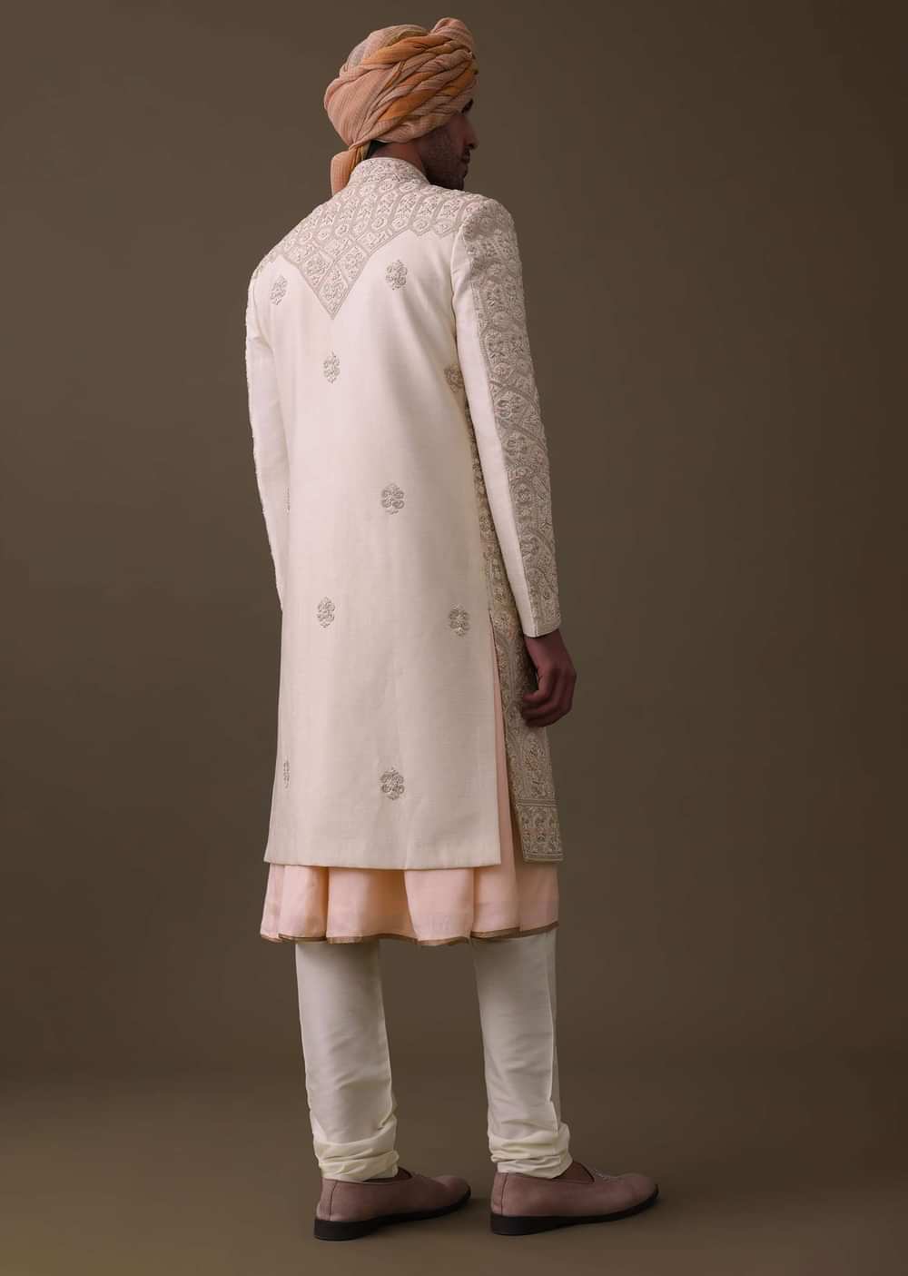 Peach Pink Sherwani Set In Silk With Resham And Cut Dana Work