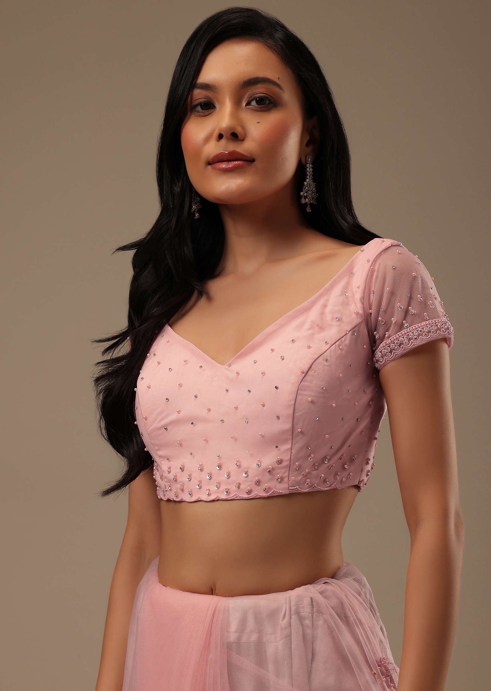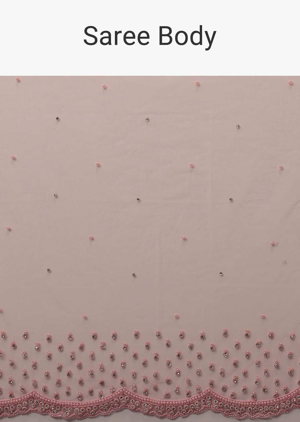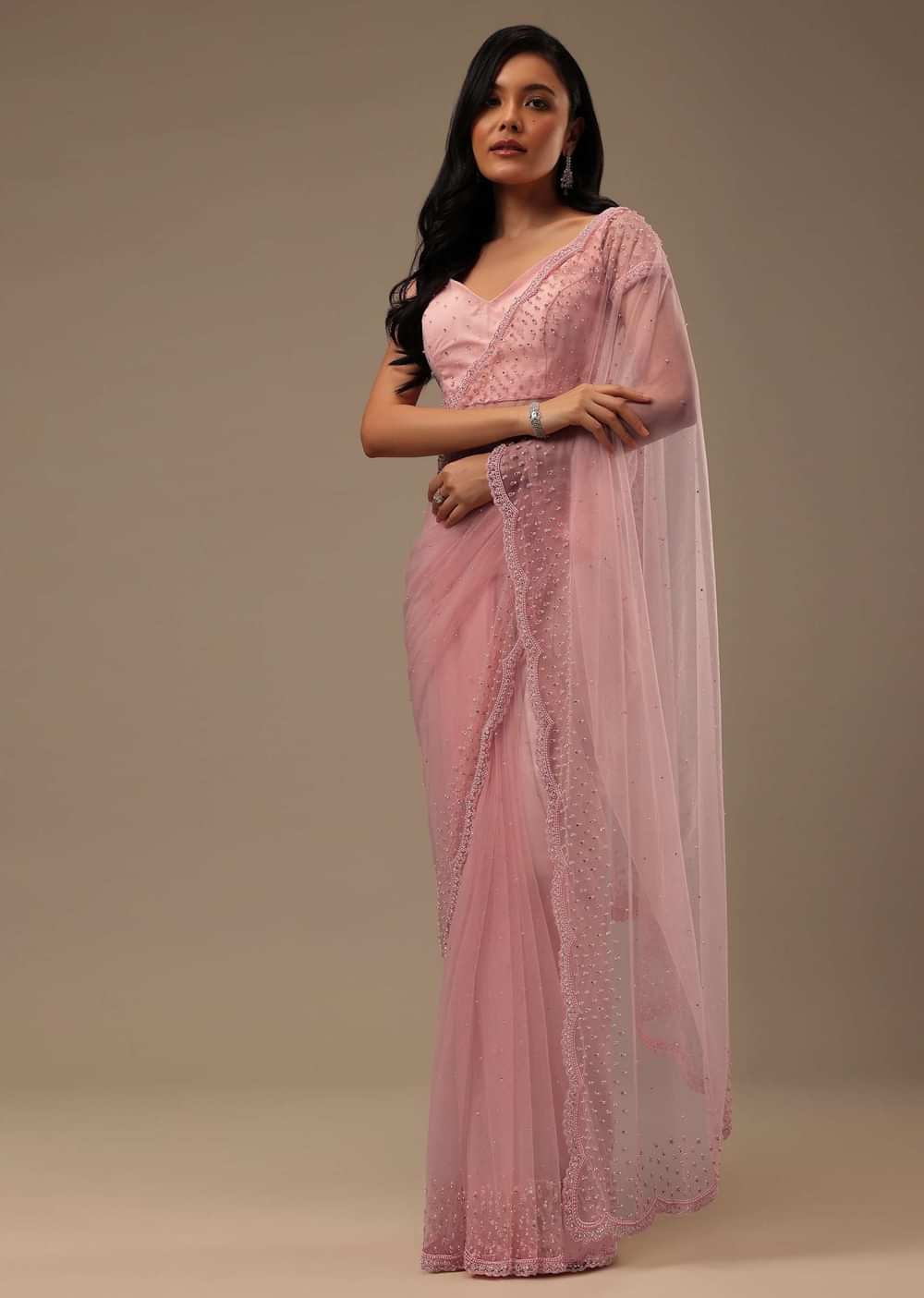 Introducing our peach pink net saree, an elegant embodiment of charm and allure. This saree is adorned with exquisite stone and bead embellishments that add a touch of shimmering elegance. EVENT - Perfect for evening parties. The saree comes with a matching unstitched blouse. Pair it with statement jewelry like a statement necklace and sparkling earrings. Awarded As The Most Trusted Brand We'Re Delivering Styles You Love Just As Promised.