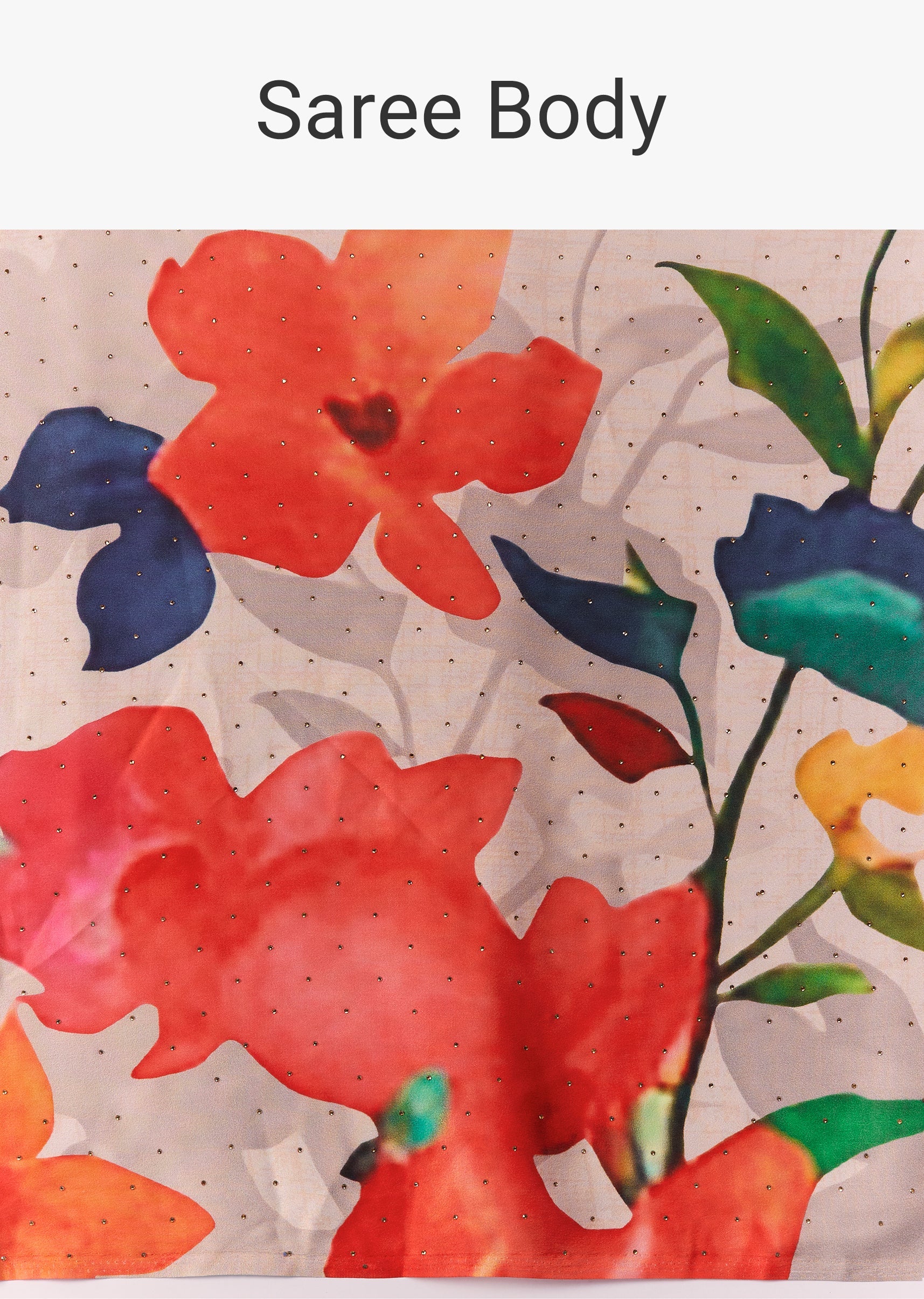 Radiate graceful elegance with this beige satin saree, adorned with vibrant multi-colored floral prints and subtle stone embellishments all over. The smooth satin fabric lends a luxurious sheen and fluid drape, while the contrasting orange blouse fabric adds a striking pop of color. Perfect for festive occasions, daytime celebrations, or elegant gatherings, this saree beautifully blends modern charm with timeless sophistication. Awarded as the Most Trusted Brand, we're delivering styles you love, just as promised.