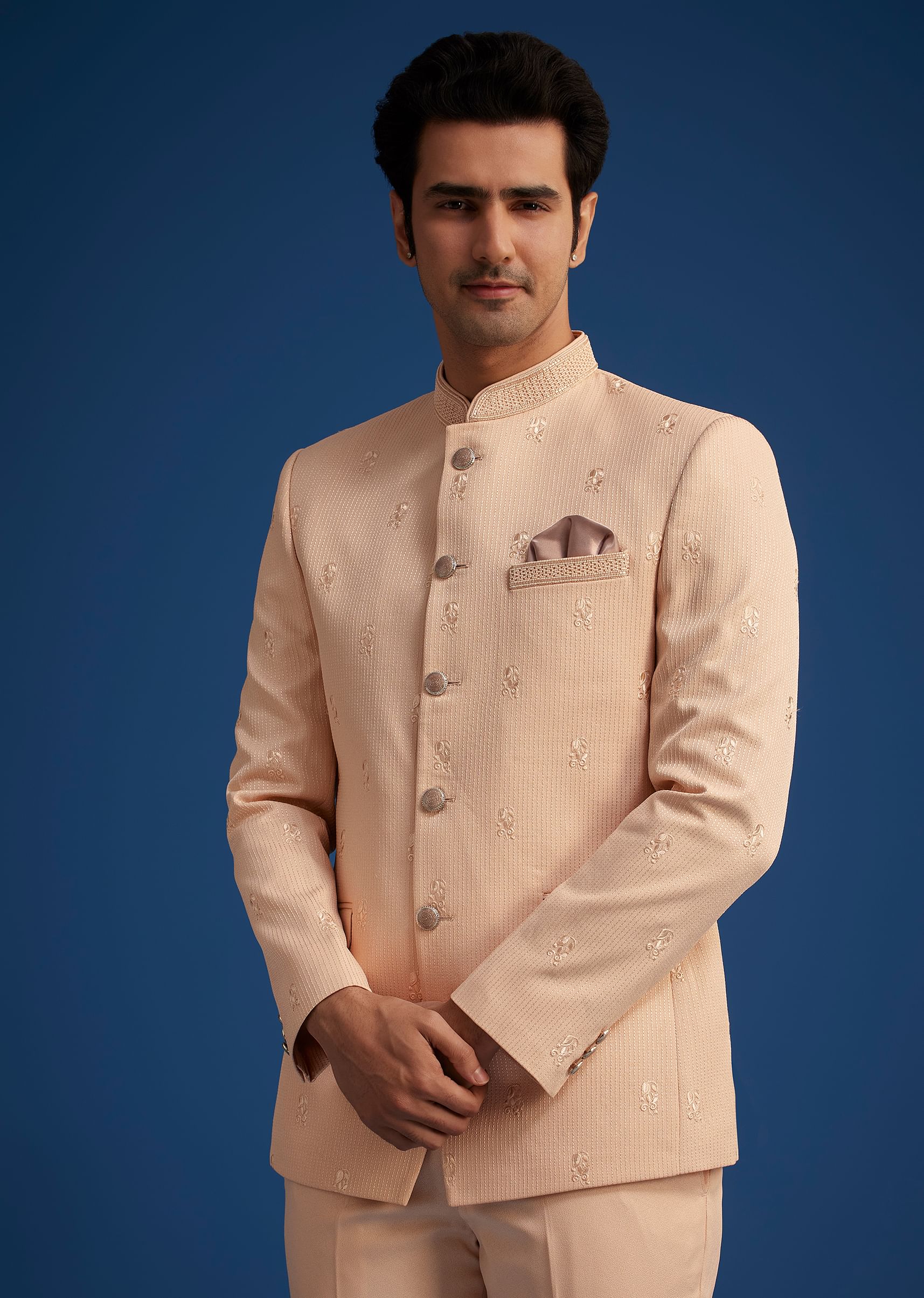 Step into sophistication with this peach rayon Jodhpuri, featuring intricate self-embroidery that elevates its timeless charm. The finely stitched detailing enhances the structured silhouette, offering a regal appeal perfect for grand celebrations. Designed for a flawless fit, this ensemble blends classic heritage with contemporary finesse.Awarded as the Most Trusted Brand, we're delivering styles you love, just as promised.
