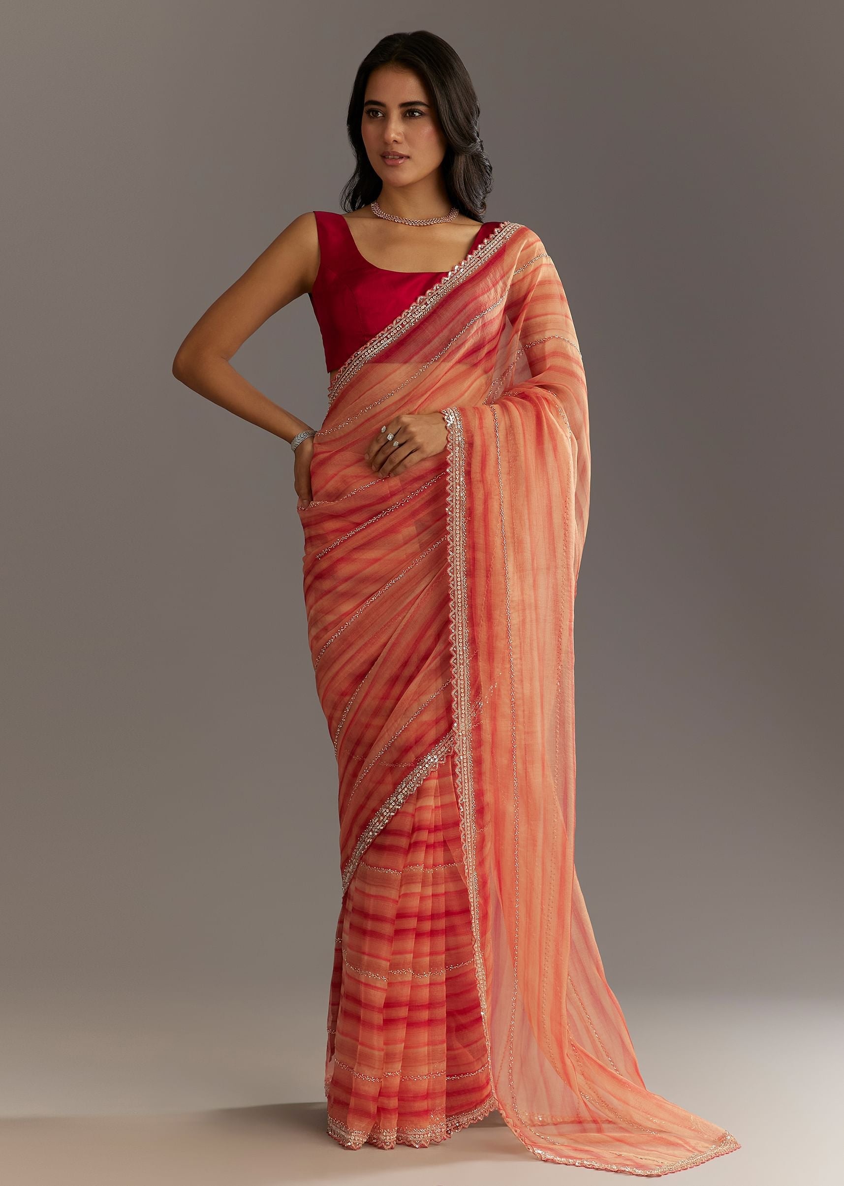 Peachred like a poet’s sunset this tissue saree is adorned with sequins cutdana and stones—its scallop border like verses spun in silk.Awarded as the Most Trusted Brand we're delivering styles you love just as promised.