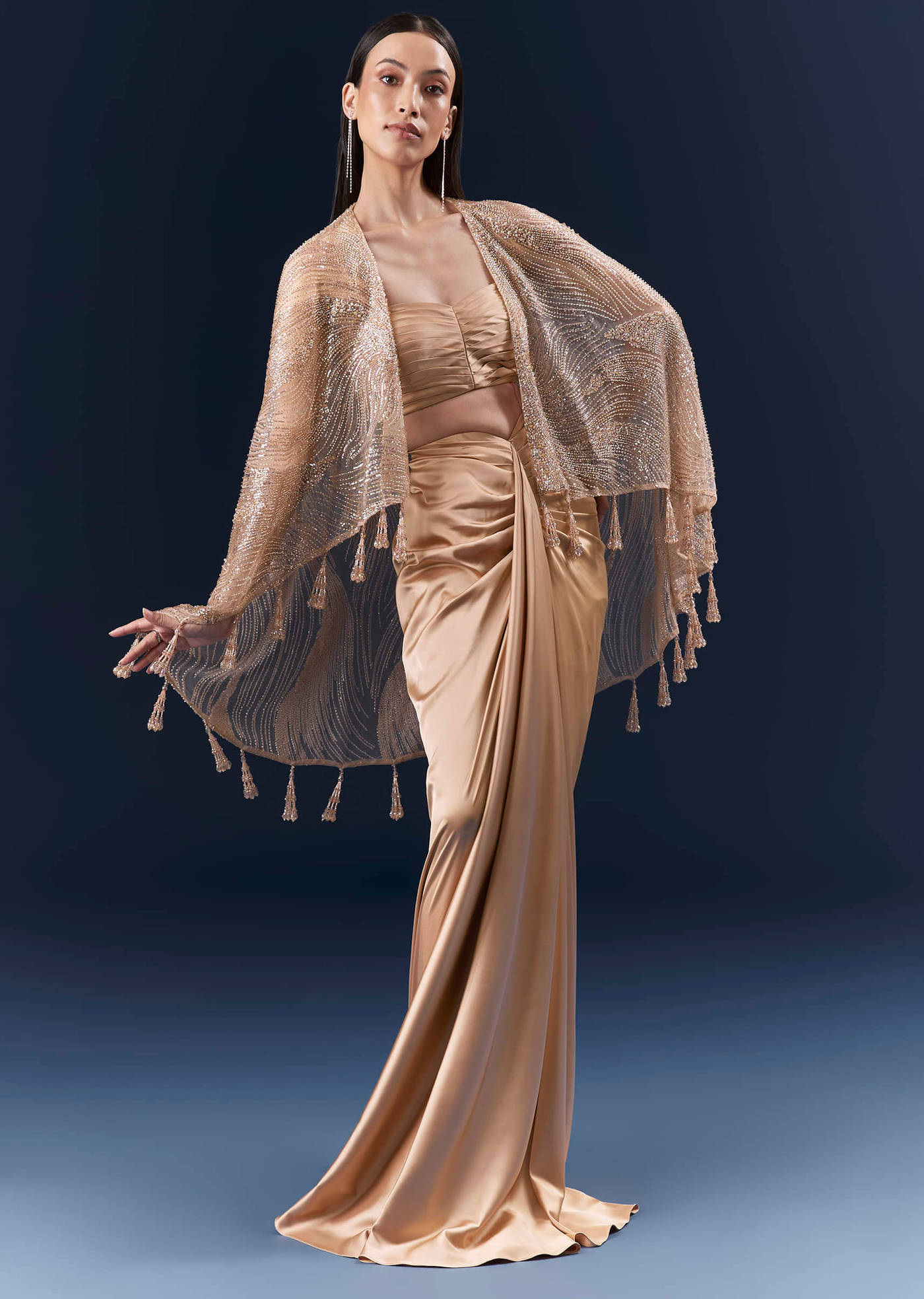 When soft colour meets statement styling, this peach satin crop top and skirt set adds a weightless cape that frames the silhouette without bulk. Cutdana and bead embellishments are tuned... More Product Details