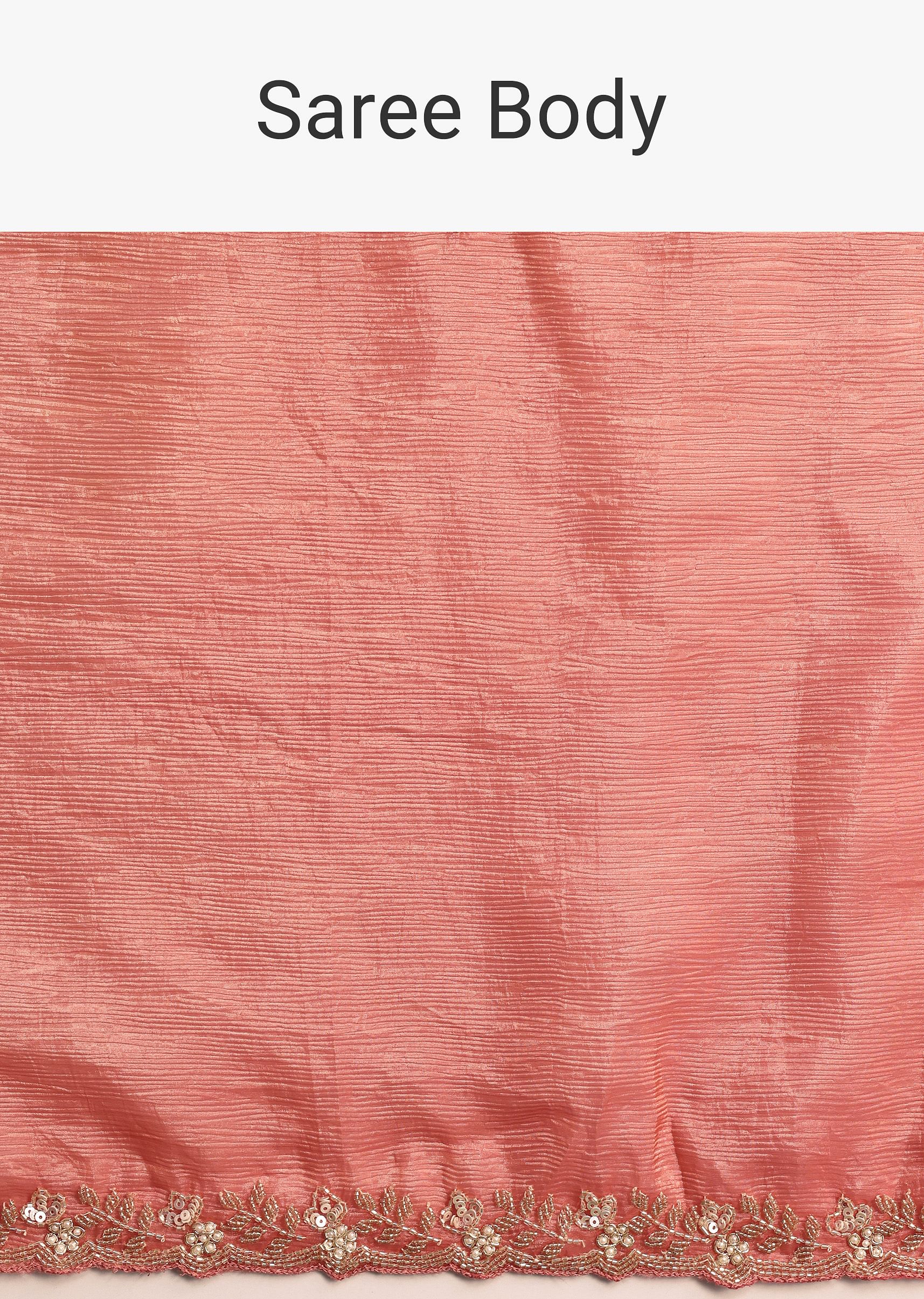 Elevate your ethnic wardrobe with our heritage-rich peach crushed tissue saree. Featuring exquisite embroidery, it is adorned with sequin and cutdana embellishments. A luxurious pick for grand celebration and festive occasions, this drape will ensure you command attention at every gathering. Awarded as the Most Trusted Brand, we're delivering styles you love, just as promised.