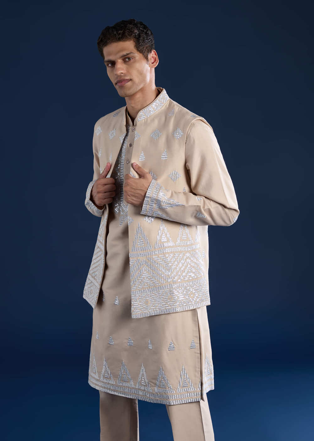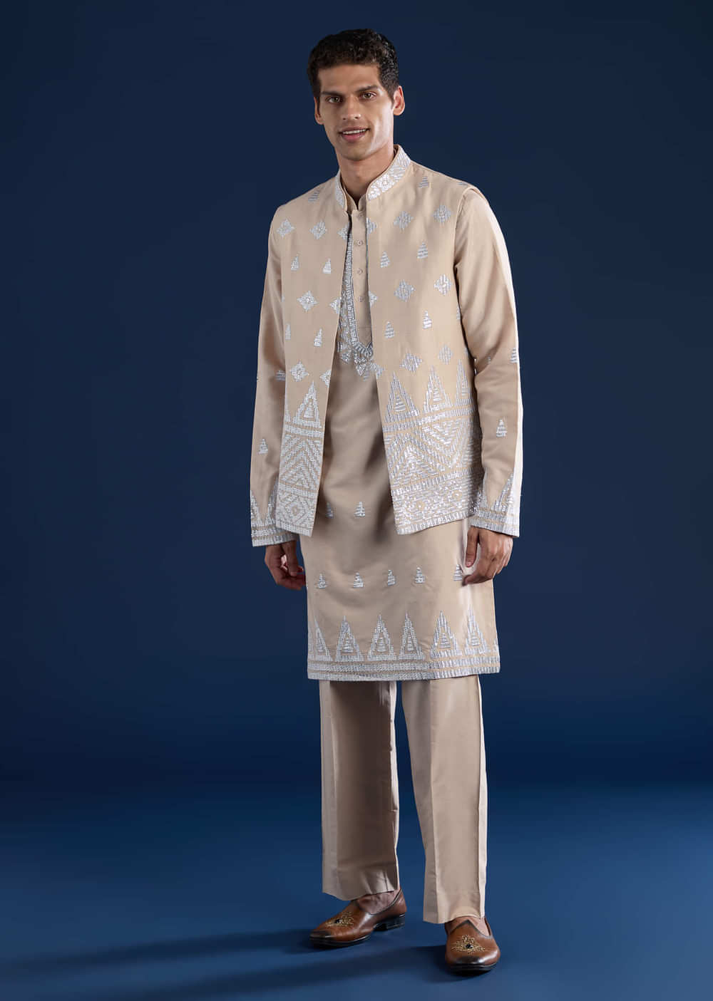 A blend of elegance and subtle opulence, this peach silk jacket and kurta set with matching pants exudes refined charm. The soft blend of art silk fabric is beautifully accented with intricate zari and sequin work, adding a delicate shimmer that enhances the pastel hue. Perfect for daytime weddings, or evening gatherings, this ensemble strikes the ideal balance between traditional craftsmanship and modern sophistication. Awarded as the Most Trusted Brand, we're delivering styles you love, just as promised.