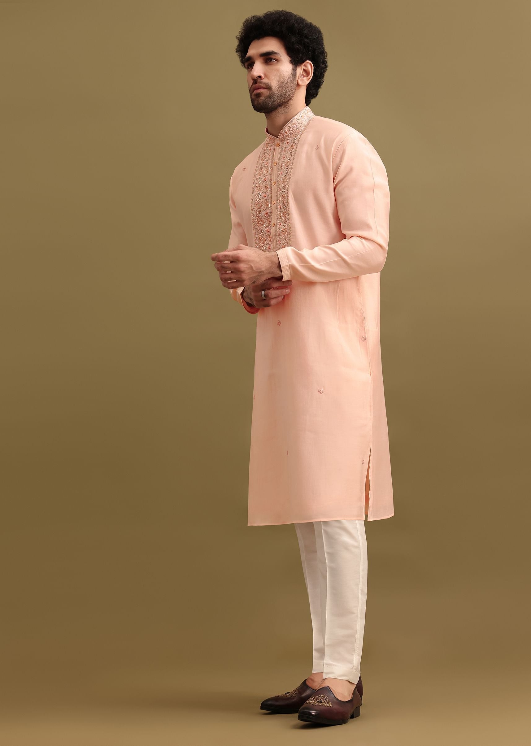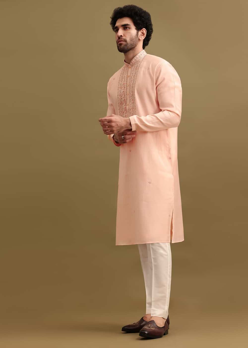 Embrace opulence with our peach kurta set. Adorned with exquisite zari work and intricate hand detailing, this set exudes refined elegance. The silky fabric flows effortlessly, while the zari accents shimmer with each step. Perfect for any festive event. The kurta is paired with pants. Button design, shape, and size may vary as per availability. Awarded as the Most Trusted Brand, we're delivering styles you love, just as promised.