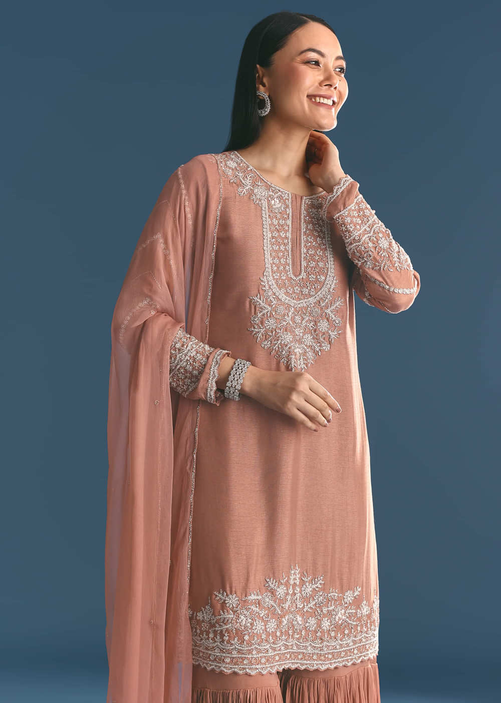 Peach Silk Kurta Sharara Suit With Cutdana Sequins Work