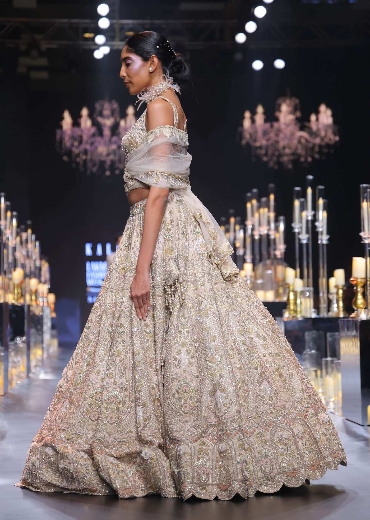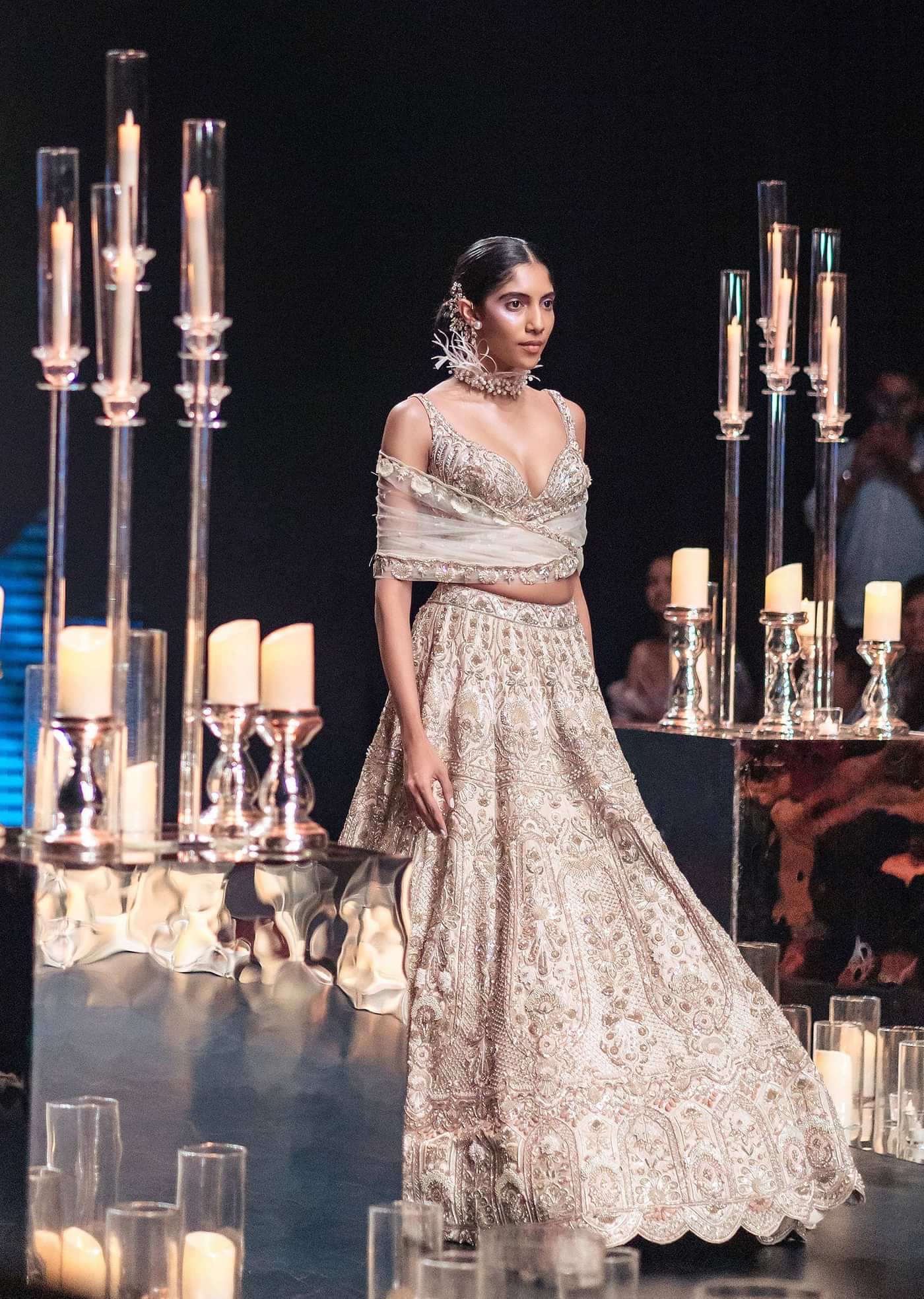 This fish-cut ultra-modern lehenga is going to give you all the attention you deserve.A four-piece ensemble that includes a lehenga, blouse, and two dupattas.Perfect for the moden bride, this look... More Product Details