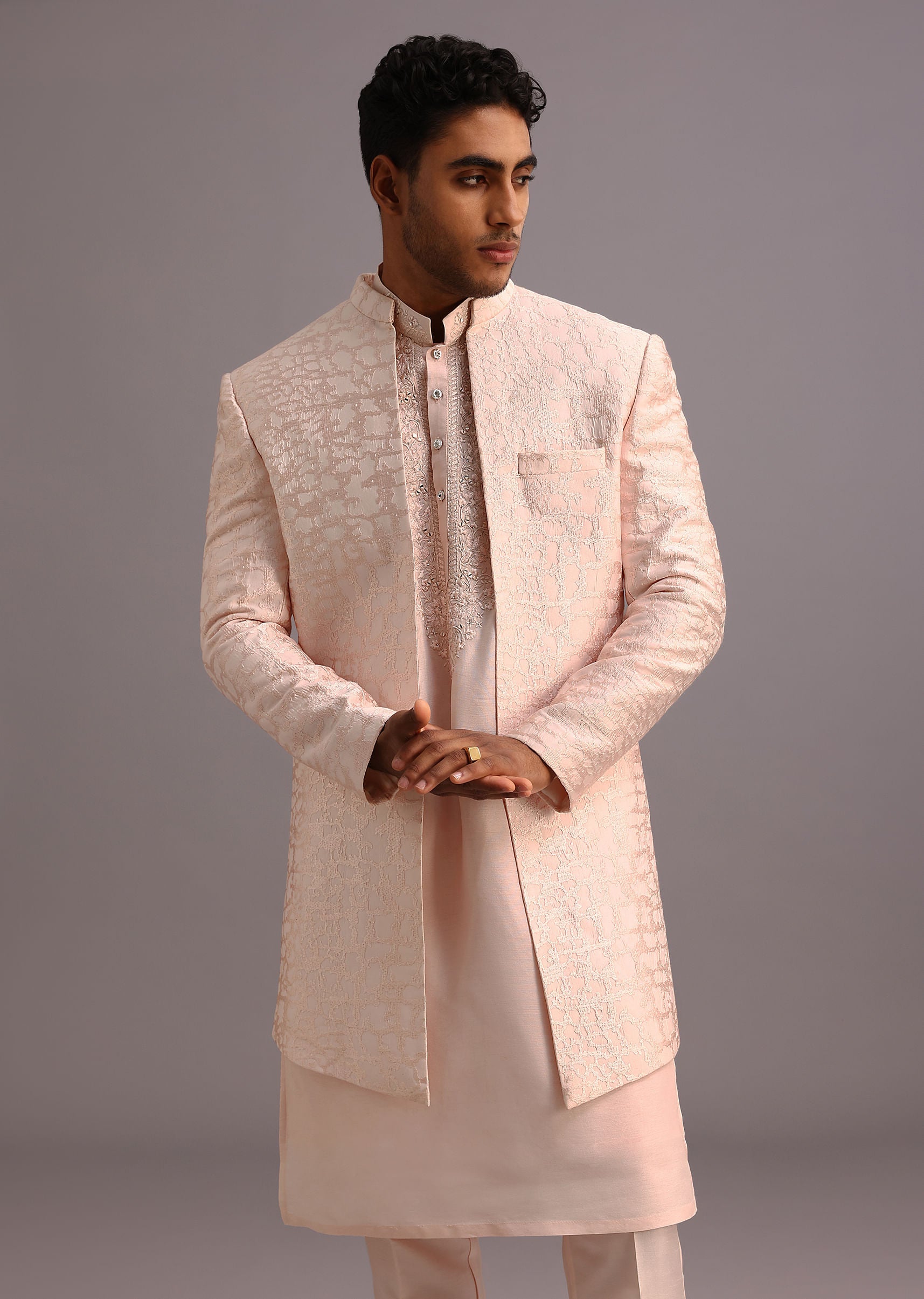 Elevate your festive wardrobe with our Peach Silk Thread Resham Work Sherwani Set. Crafted from luxurious silk, this exquisite piece features intricate resham embroidery that adds a touch of elegance... More Product Details