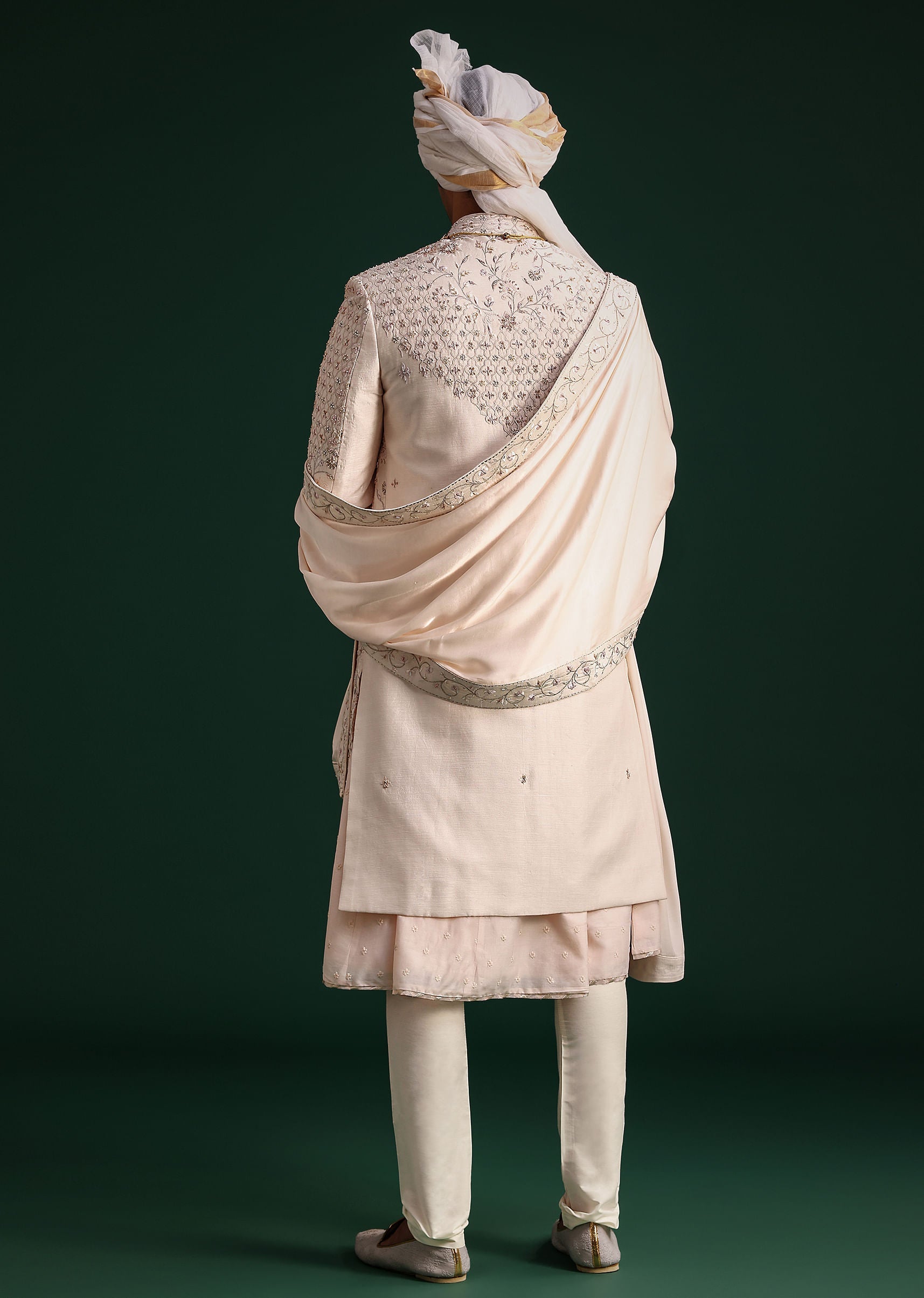 Enhance the regal charm by pairing it with mojris and a traditional pocket square for a polished look.