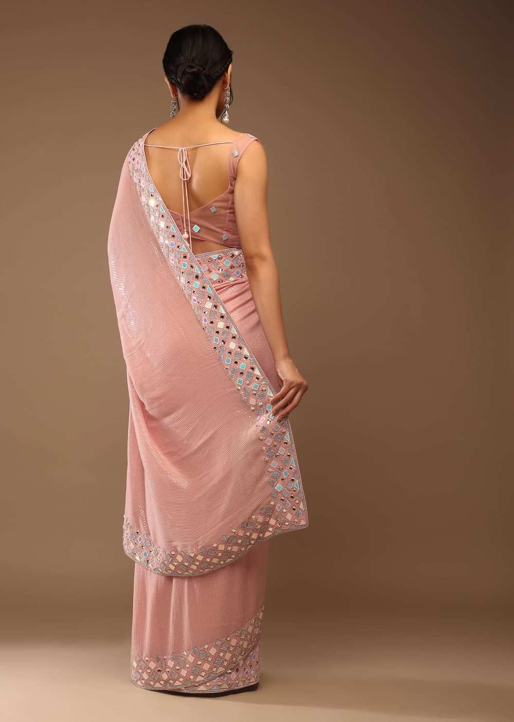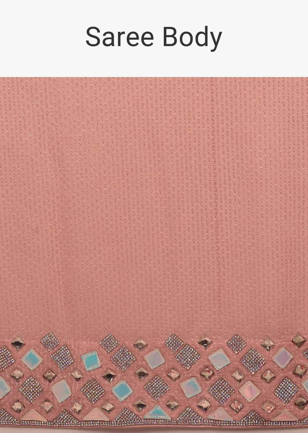 Peach skin saree with a crop top in iridescent foil embellishment. Crafted in net with stones and foil adornment. It comes in sleeveless, curved hemline with a V neckline and tie-up tassel Dori at the back. This piece comes with padding and back hooks closure. Saree is crafted in georgette with threadwork and sequins embellished all over. The border is adorned with foil iridescent and stones embroidery. It comes with the side hooks closure. Soon-to-be-bride? Tada. we have the apt piece for you to look marvelously beautiful. You can beautify it with diamond dangling earrings and a studded embellished clutch to complete the look. This can be a perfect piece for pre-wedding parties. the length of the crop top comes in 14 inches and the saree comes in 45 inches. Model height - 5'10 bust - 32 inches wearing size Small. Awarded As The Most Trusted Brand We'Re Delivering Styles You Love Just As Promised.