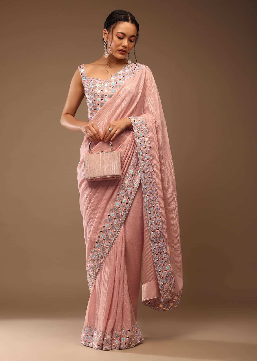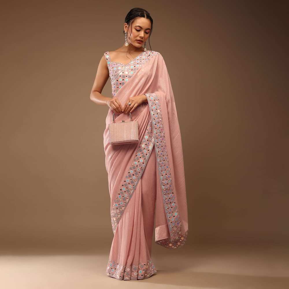 Peach Skin Saree With A Crop Top In Iridescent Foil Embellishment