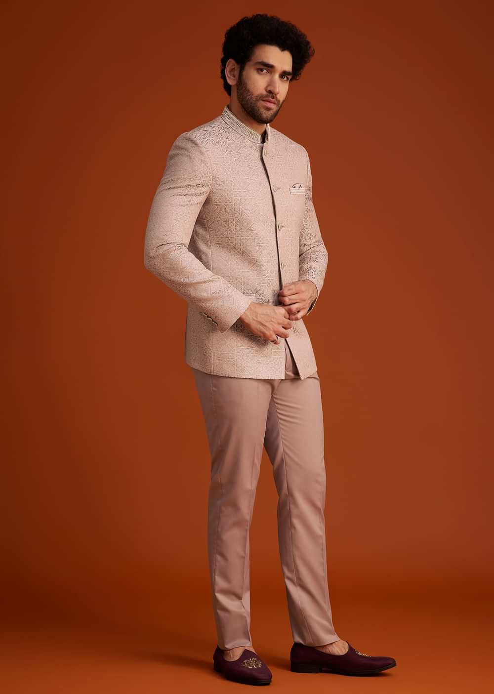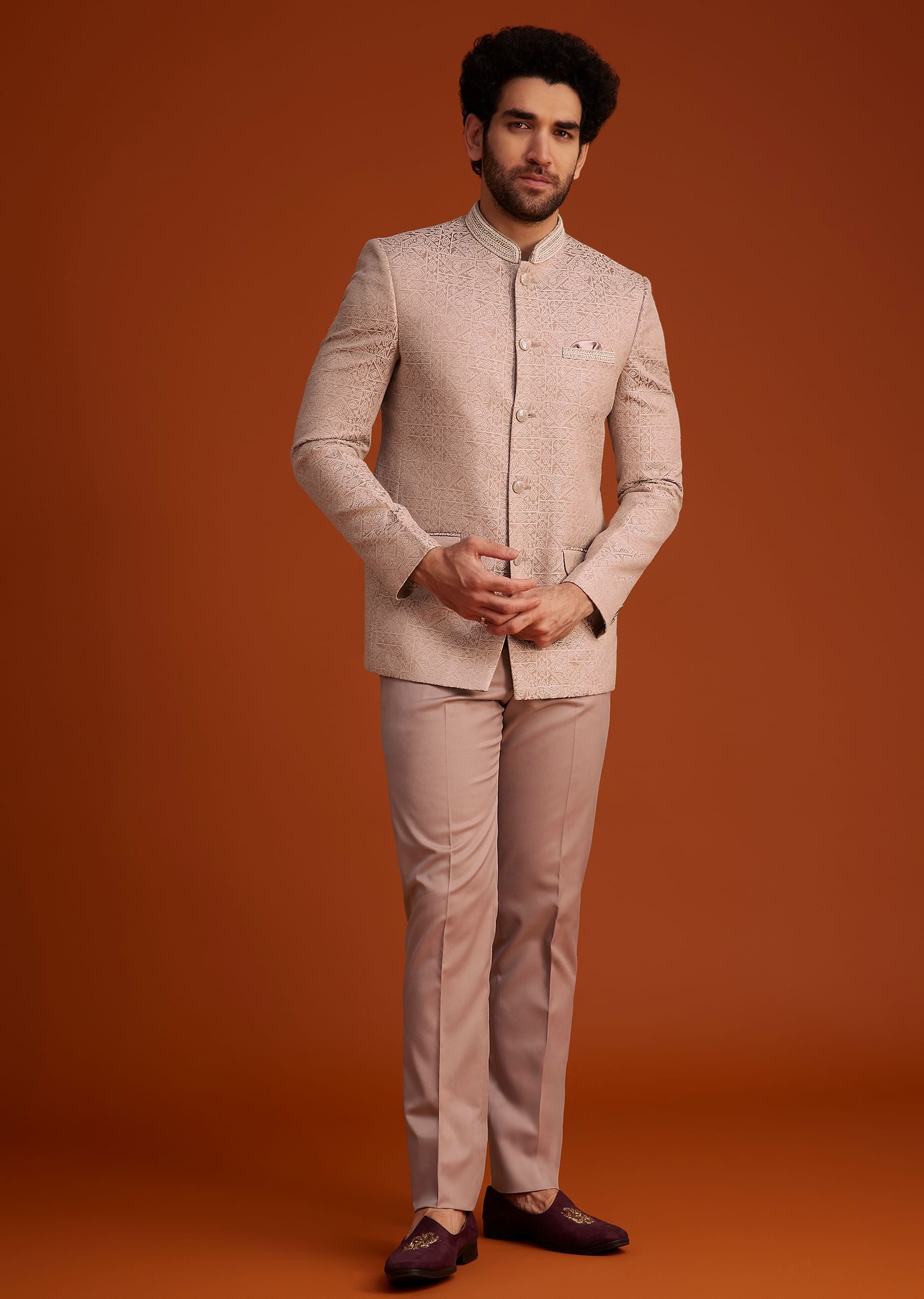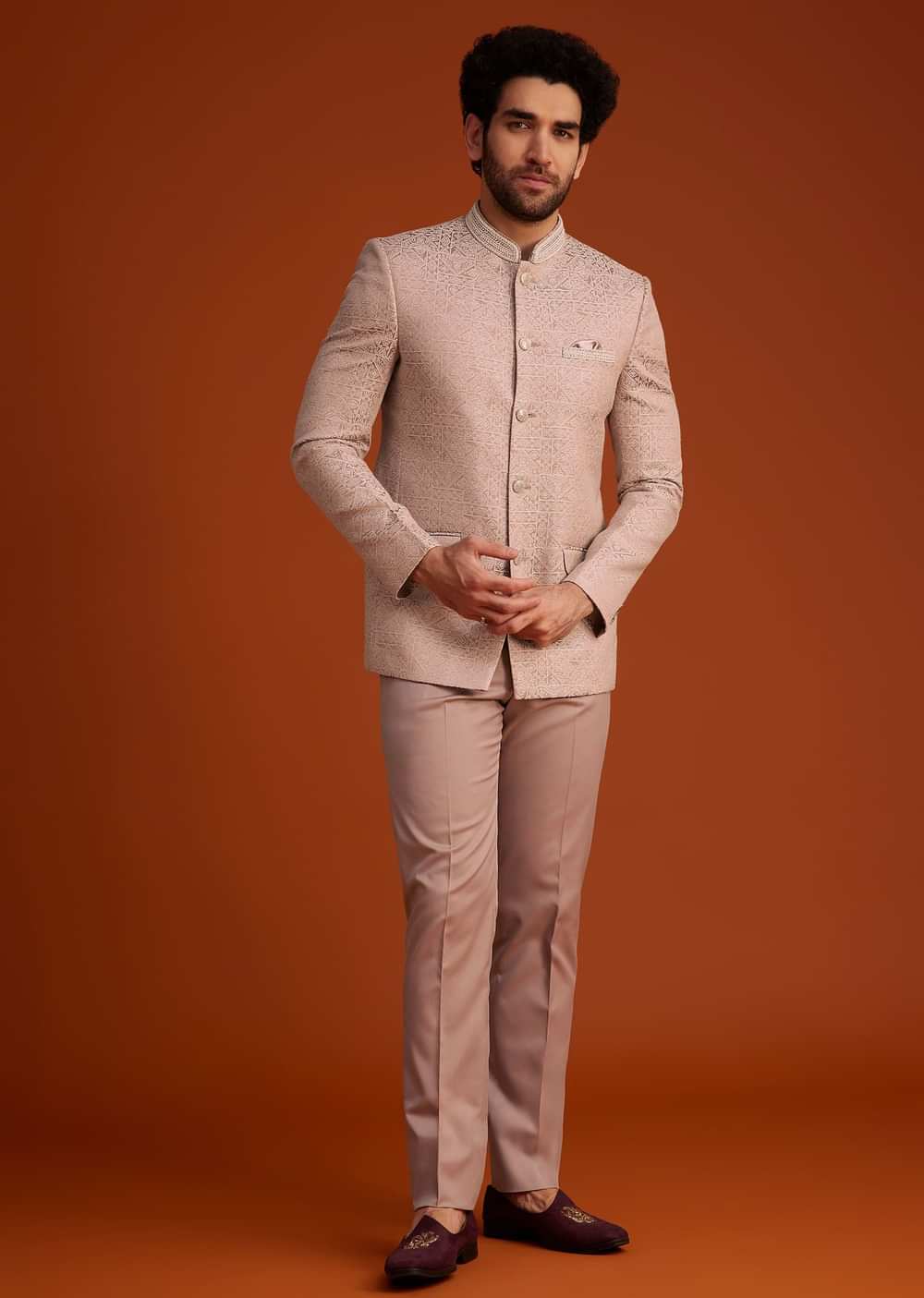 This refined peach bandhgala suit is designed with a luxurious textured fabric showcasing intricate patterns that add a touch of sophistication. Perfect for weddings receptions and festive gatherings its soft hue and modern tailoring create a timeless yet contemporary look. Paired with perfectly fitted trousers this ensemble exudes elegance and charm making it an impeccable choice for grand occasions. Awarded as the Most Trusted Brand, we're delivering styles you love, just as promised.