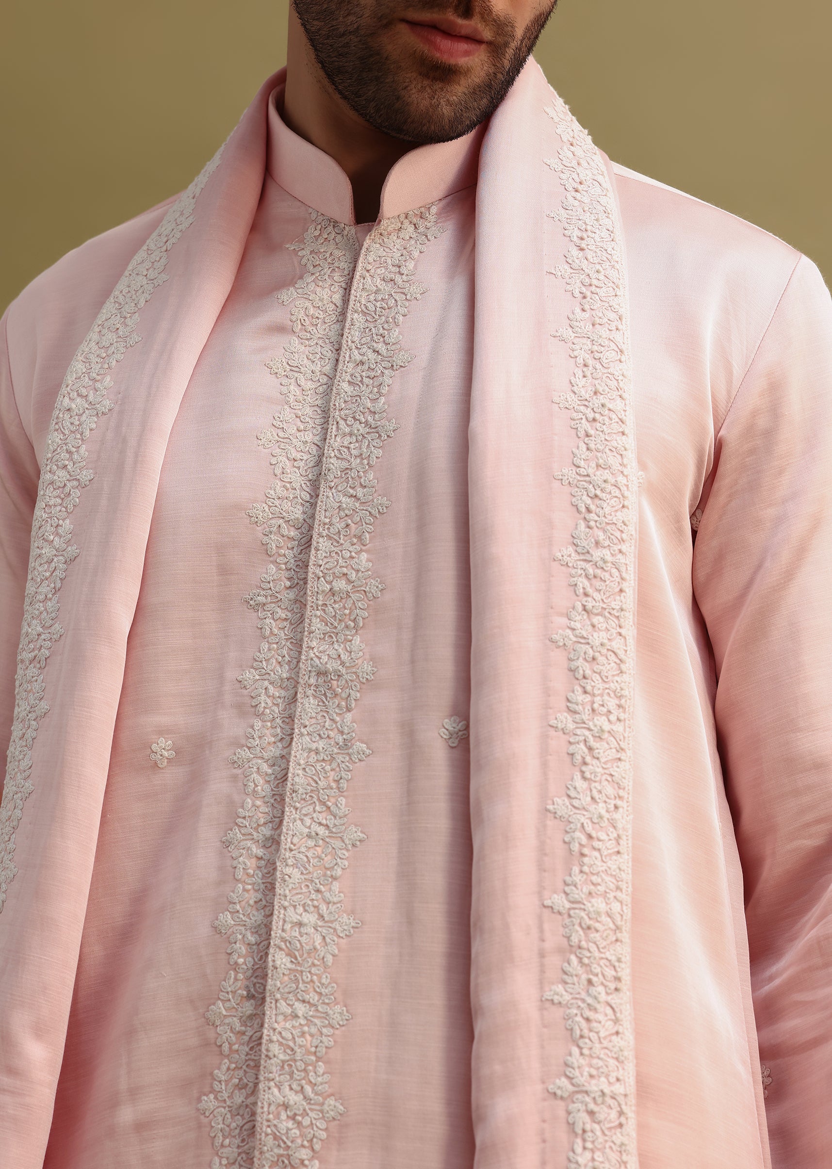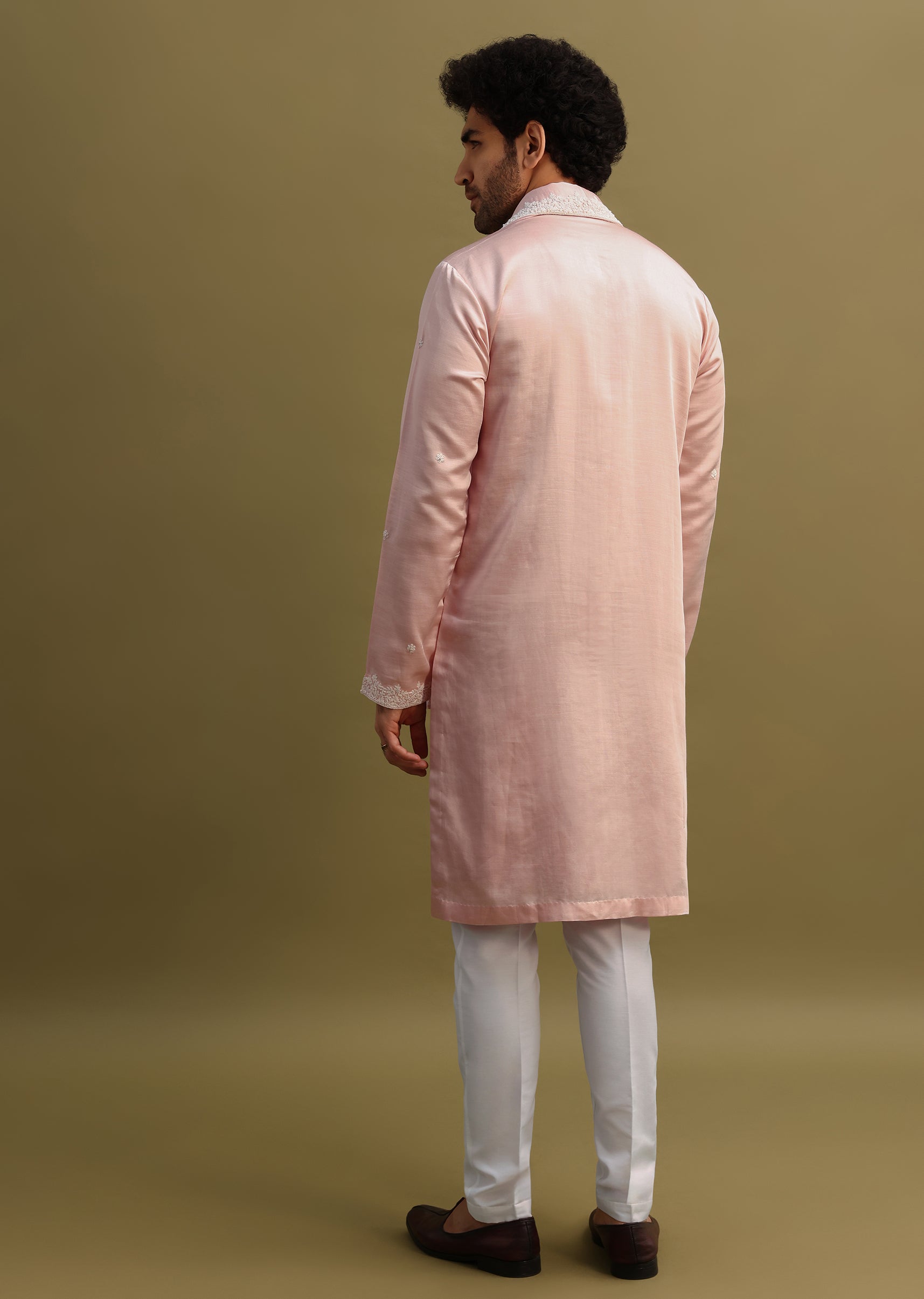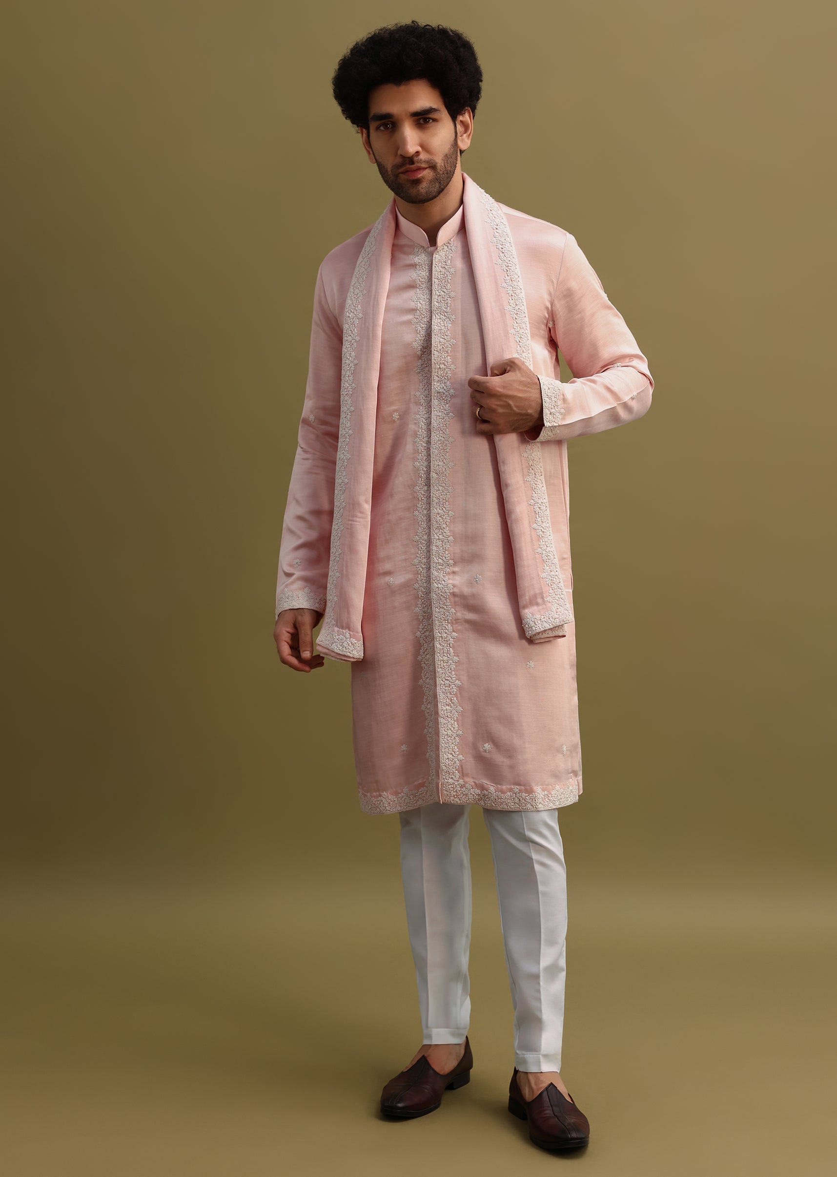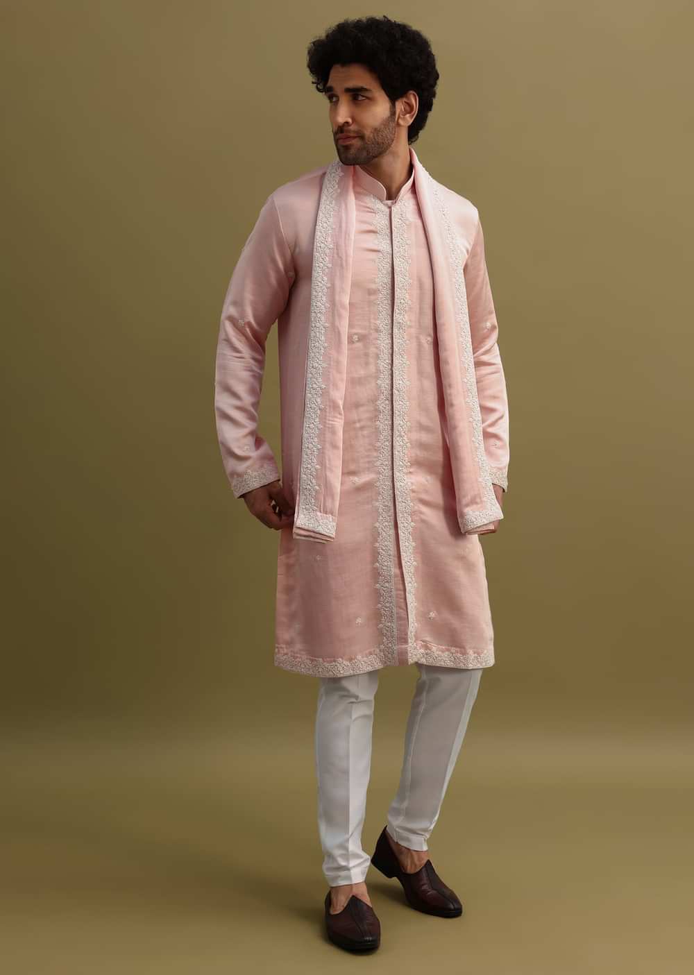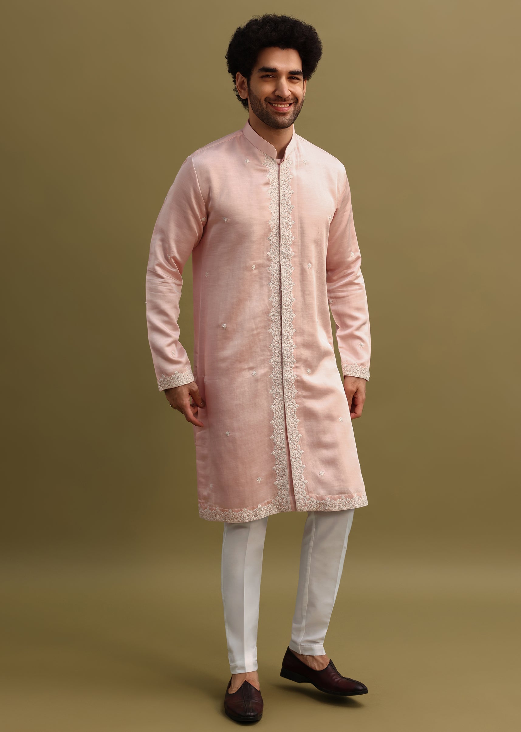 Sway the night away in a mesmerizing vision. Dance with joy in a peach kurta, delicately spun with shimmering threadwork. The matching dupatta along with white pant completes your elegance, making you a star of the sangeet.Button design, shape, and size may vary as per availability. Awarded as the Most Trusted Brand, we're delivering styles you love, just as promised.