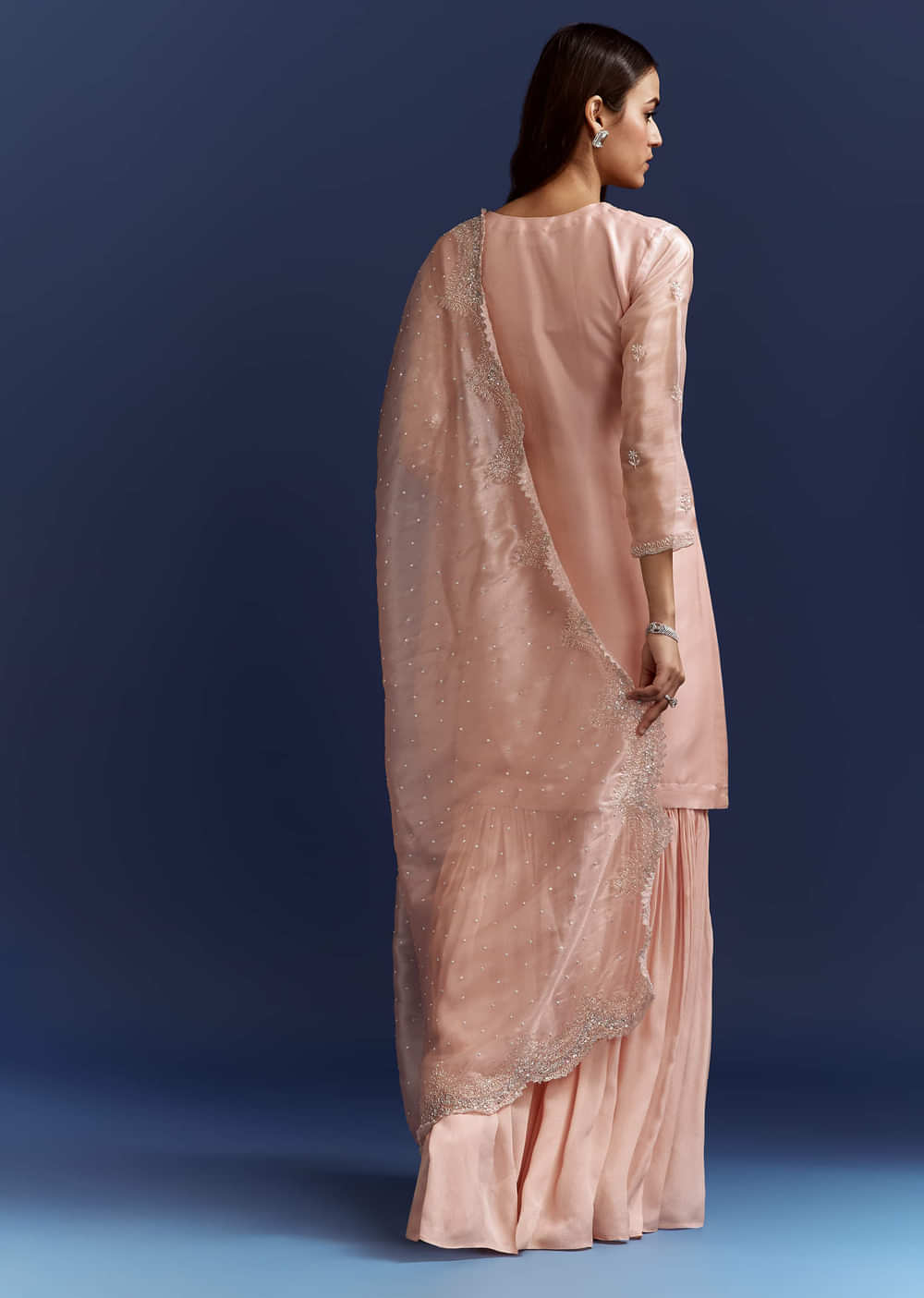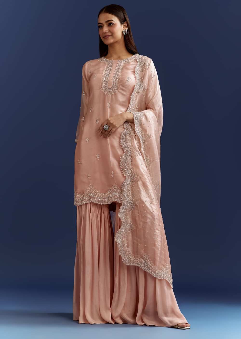 In soft peach tones, this tissue fabric kurta features cut dana and sequins work, paired with a coordinating sharara and stone embellished dupatta. Perfect for sangeet or mehendi events. Standard... More Product Details