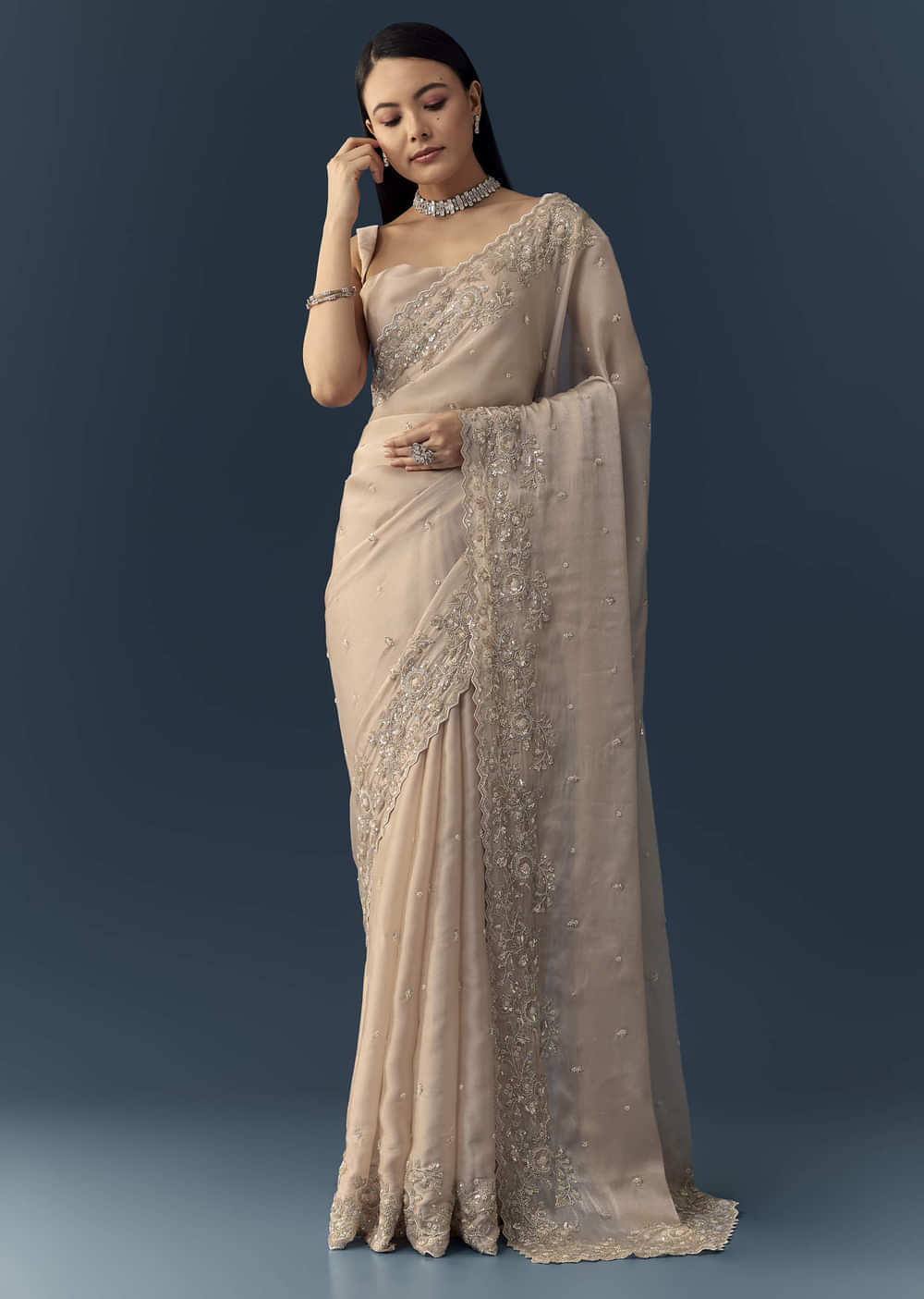Embrace graceful sophistication with this peach tissue organza saree, featuring a delicate cutwork border and intricate all-over embroidery with cutdana, sequins, and beads. The soft peach hue and sheer organza texture create a dreamy, ethereal look, perfect for festive occasions, weddings, or elegant evening gatherings. Paired with an unstitched blouse fabric, this saree beautifully combines traditional artistry with modern refinement. Awarded as the Most Trusted Brand, we're delivering styles you love, just as promised.