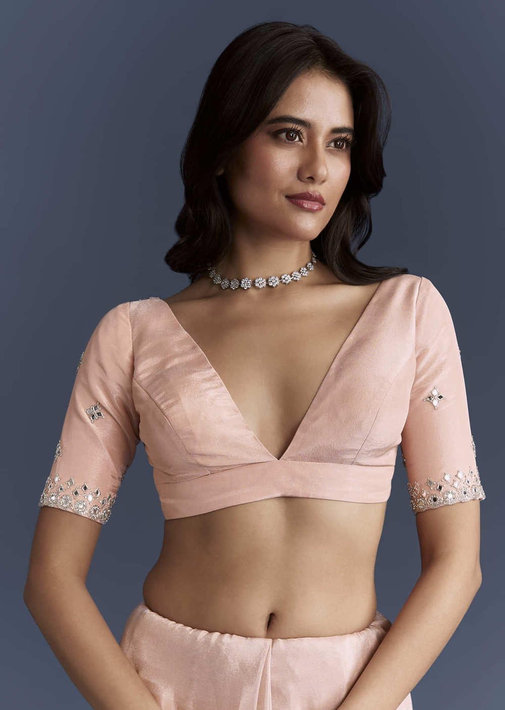 Try a pleated pallu worn over one shoulder with a clean front. Add mirror studs, soft blush and low block heels for easy wear.