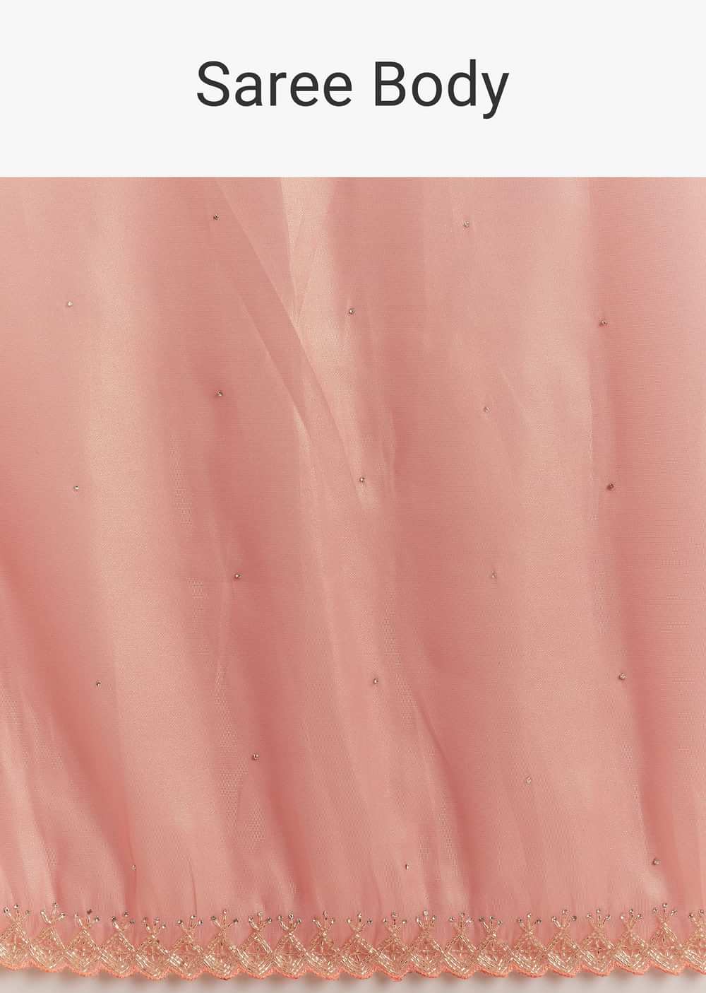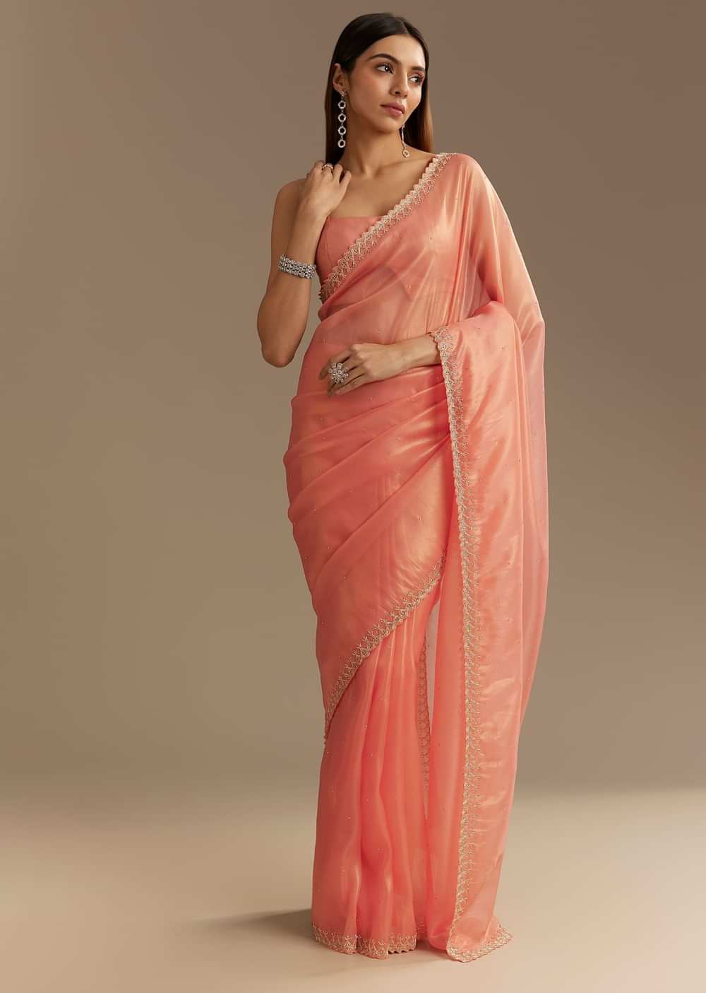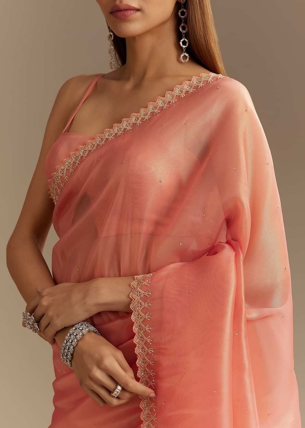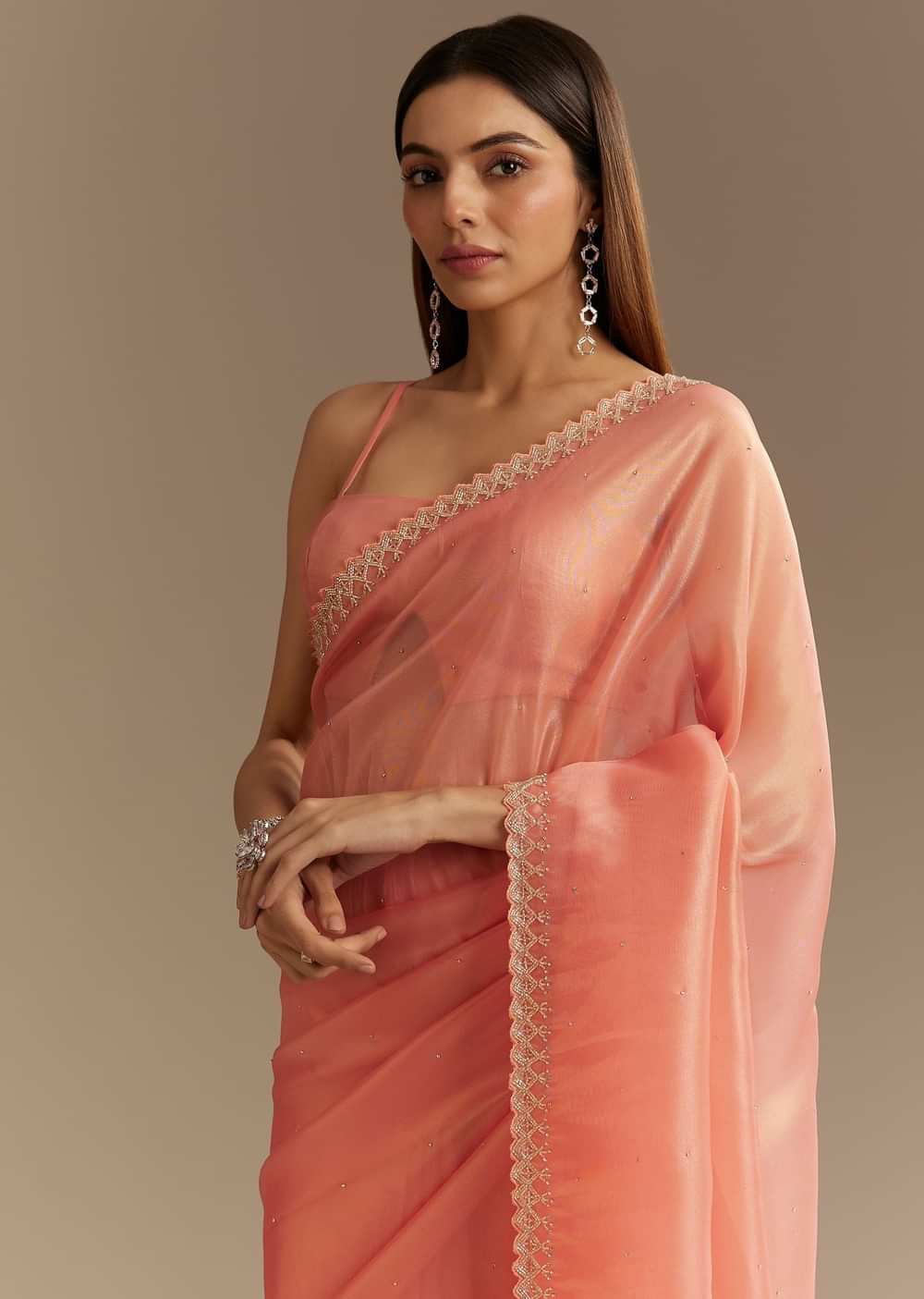 Peach Tissue Saree With Stones Cutdana Embellishments And Scallop Border