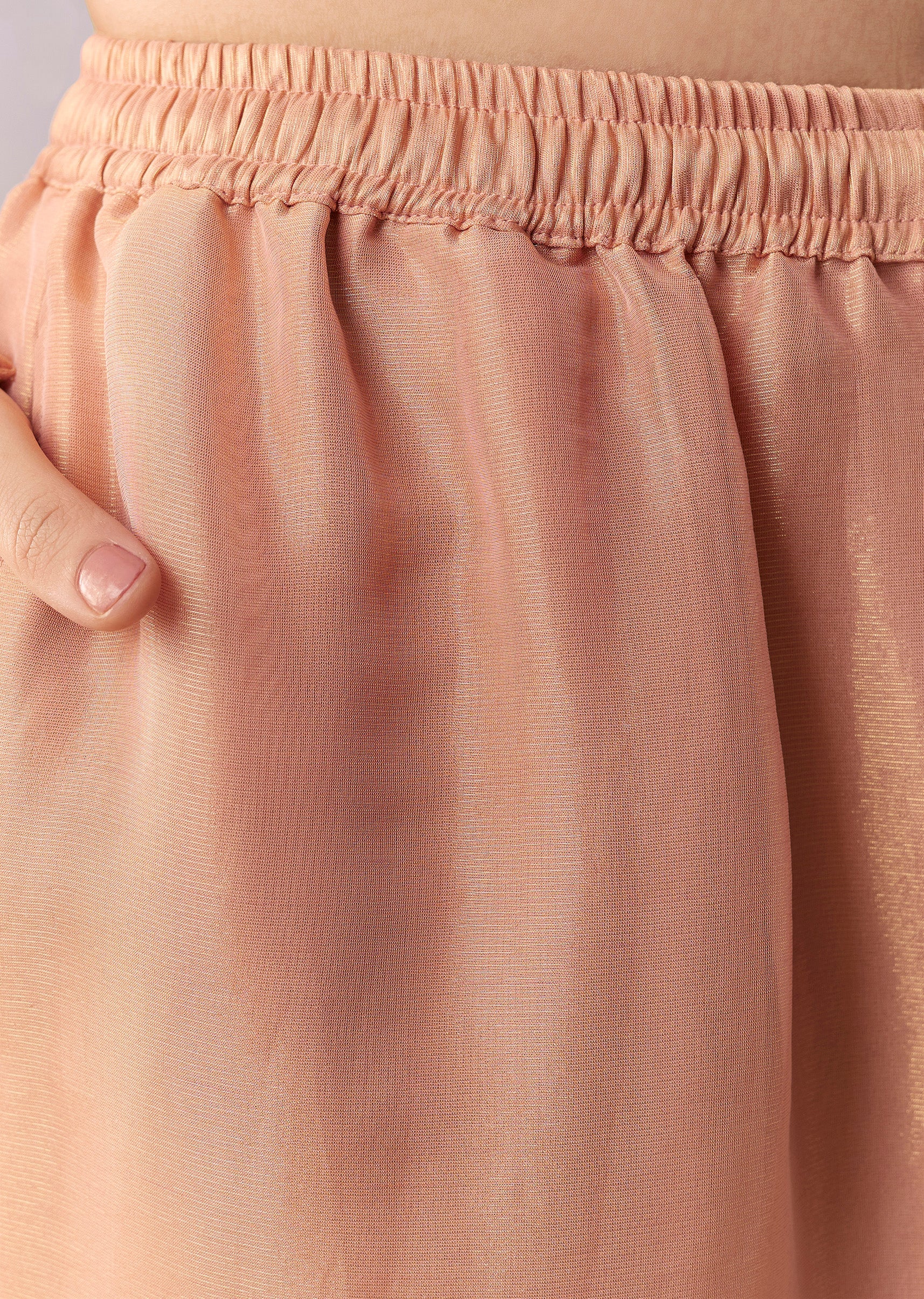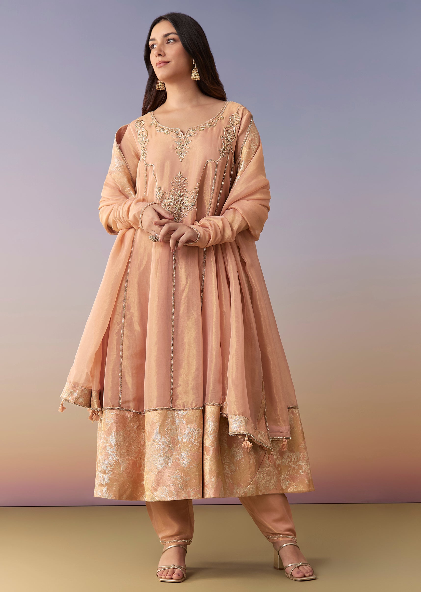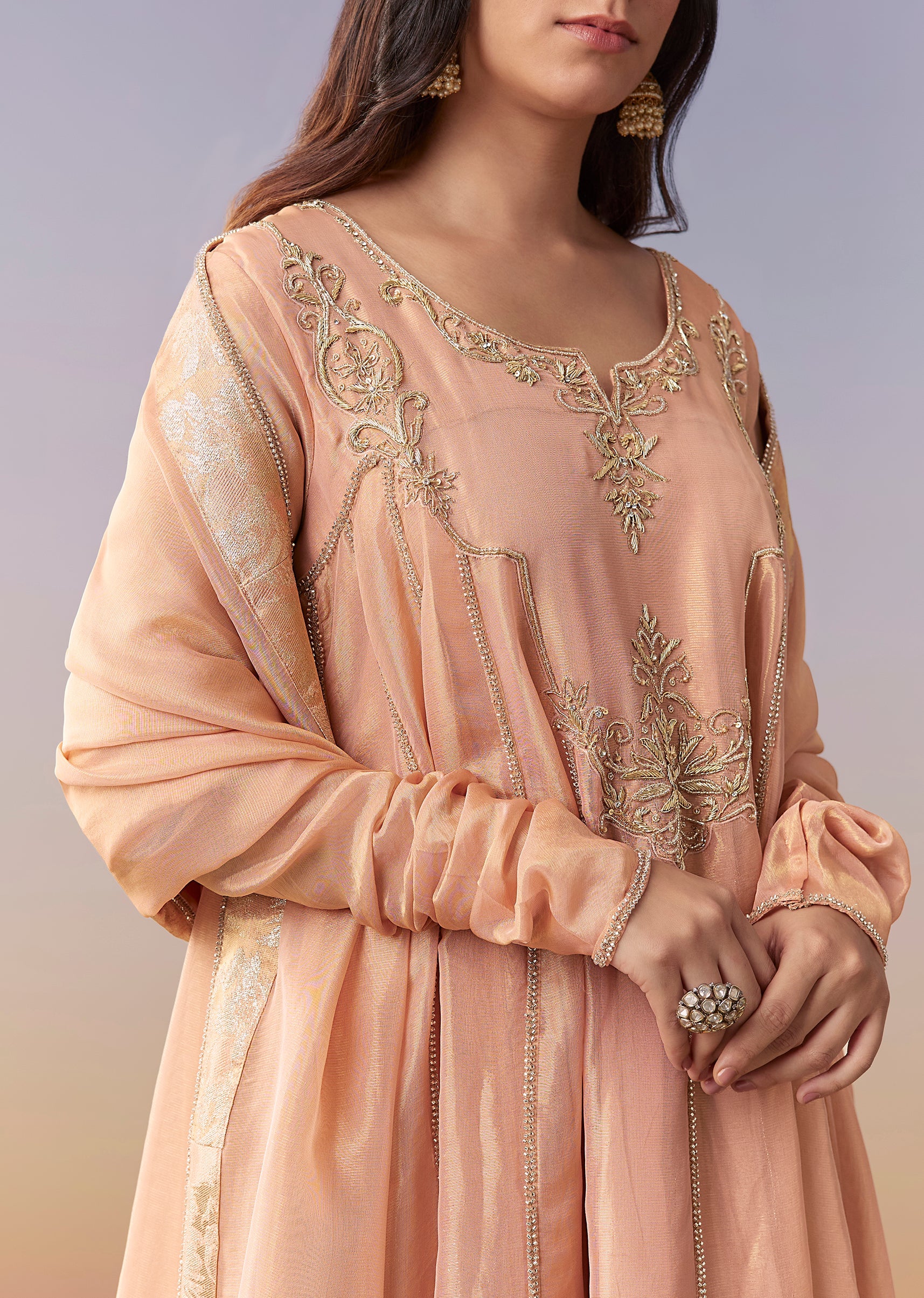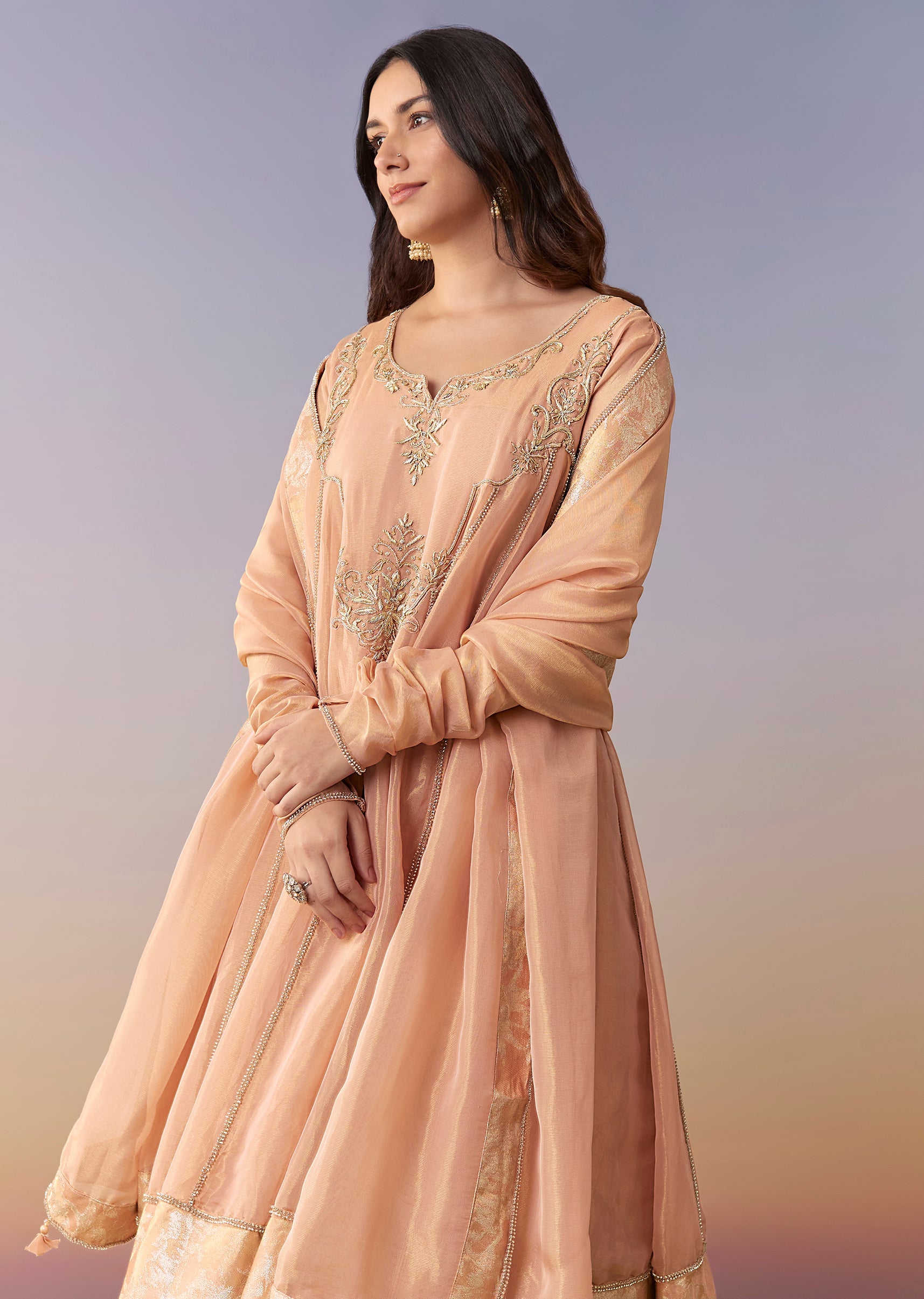 Peach Zardosi Tissue Anarkali Suit Set With Pant And Dupatta