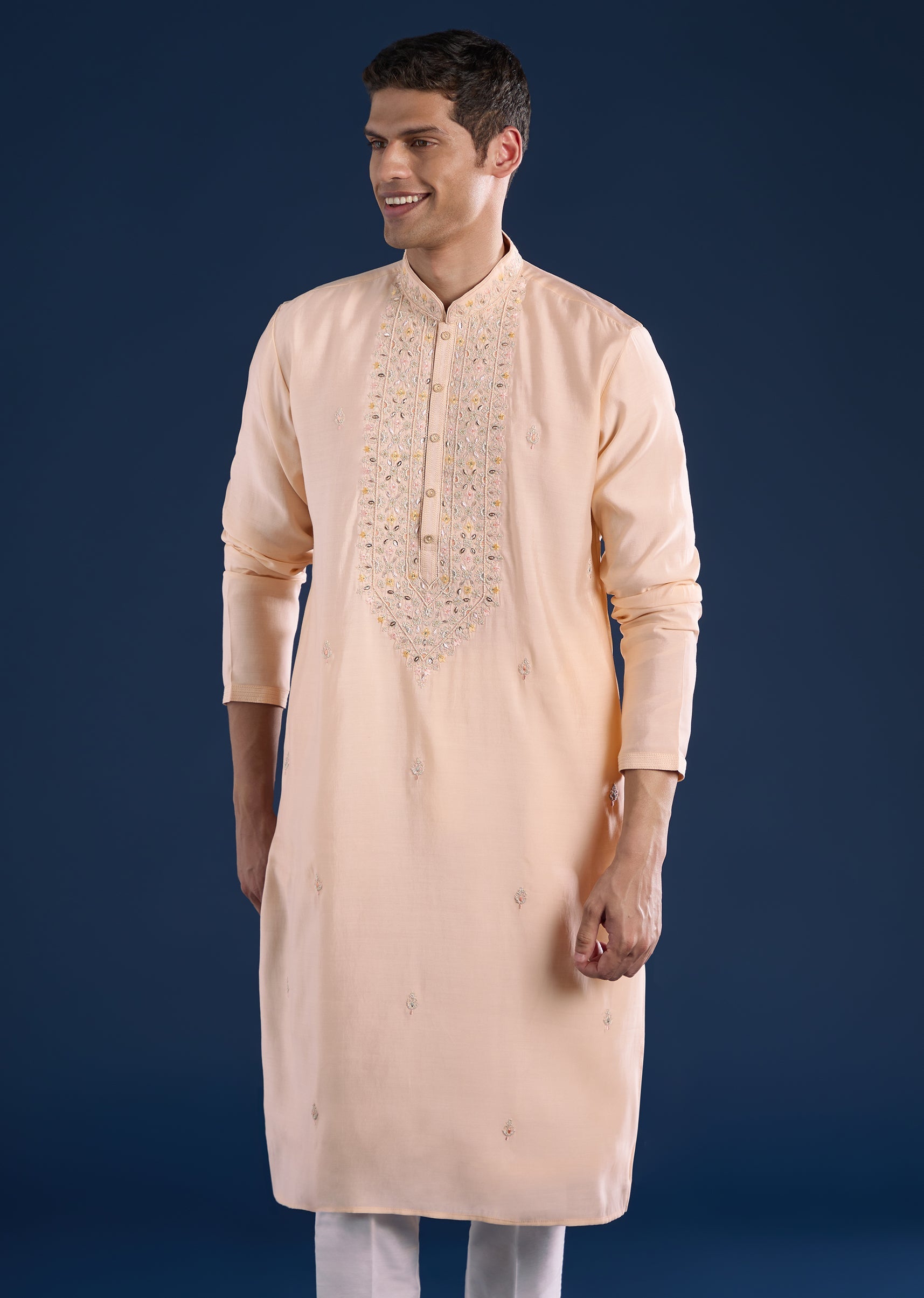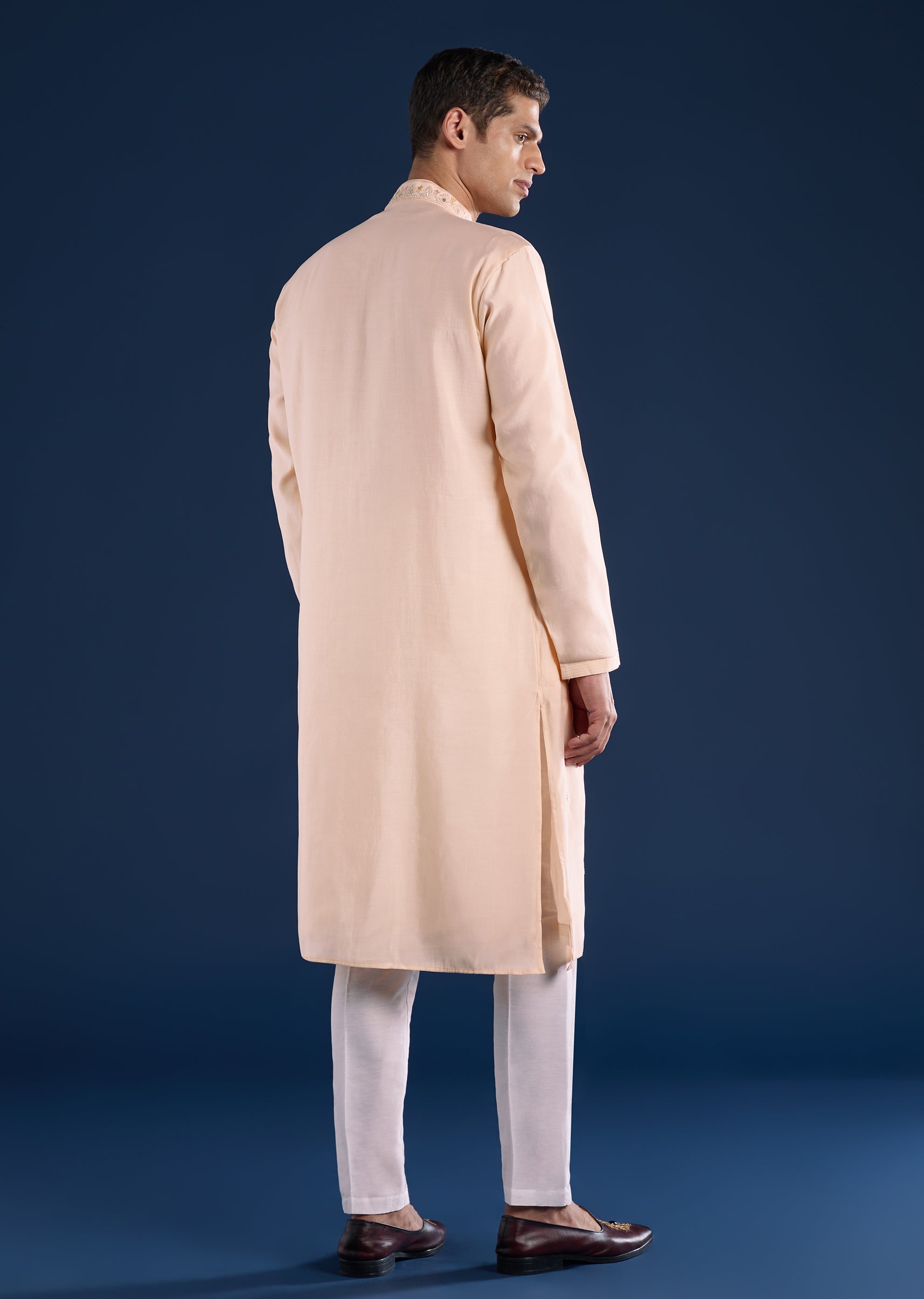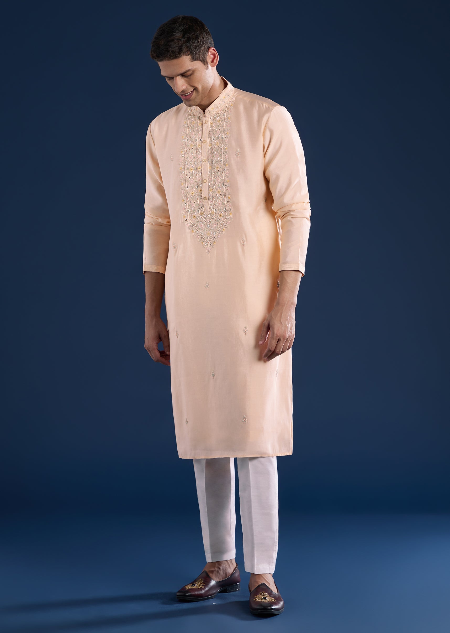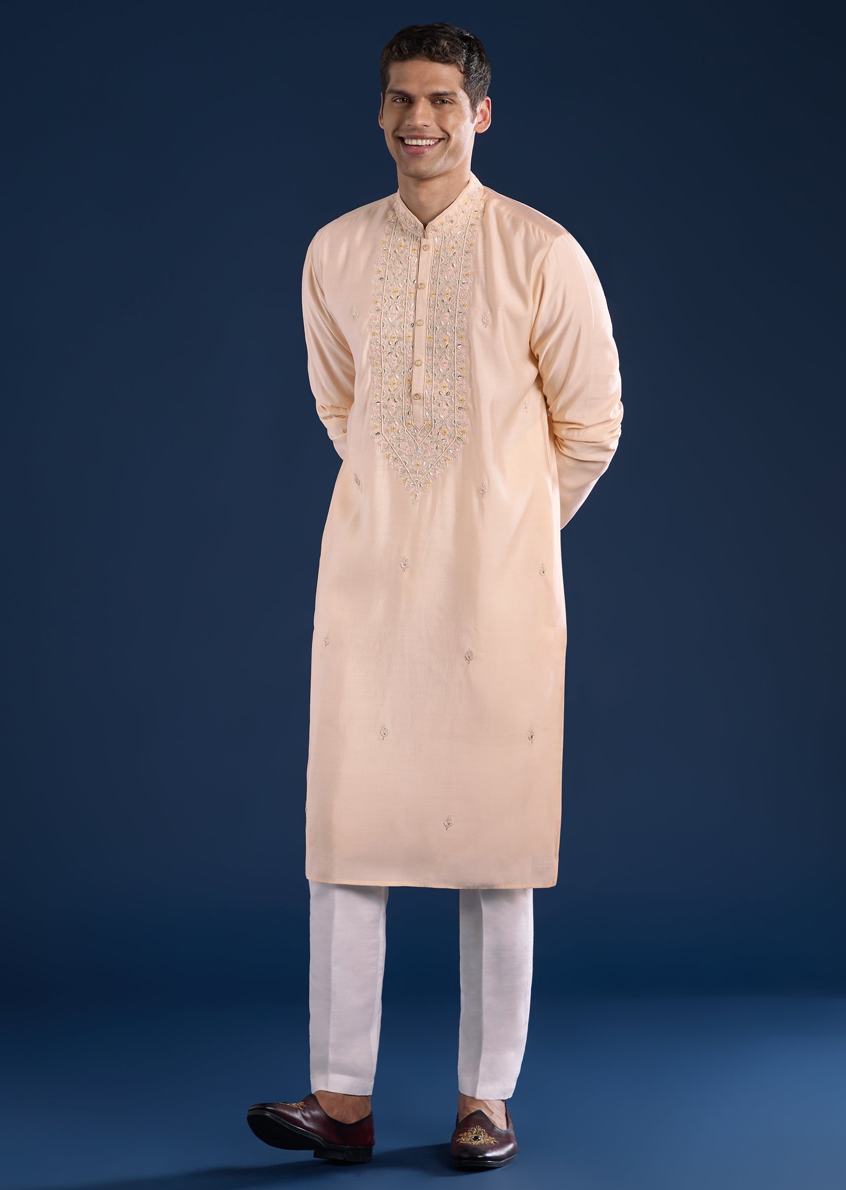 This peach kurta set is crafted in art silk and detailed with resham thread, zari highlights, and refined motifs for a subtle festive lift. Finished with a mandarin collar, full sleeves, and side slits, it pairs effortlessly with straight-fit trousers and a partially elasticated waist—ideal for pooja and festive gatherings. Awarded as the Most Trusted Brand, we're delivering styles you love, just as promised.