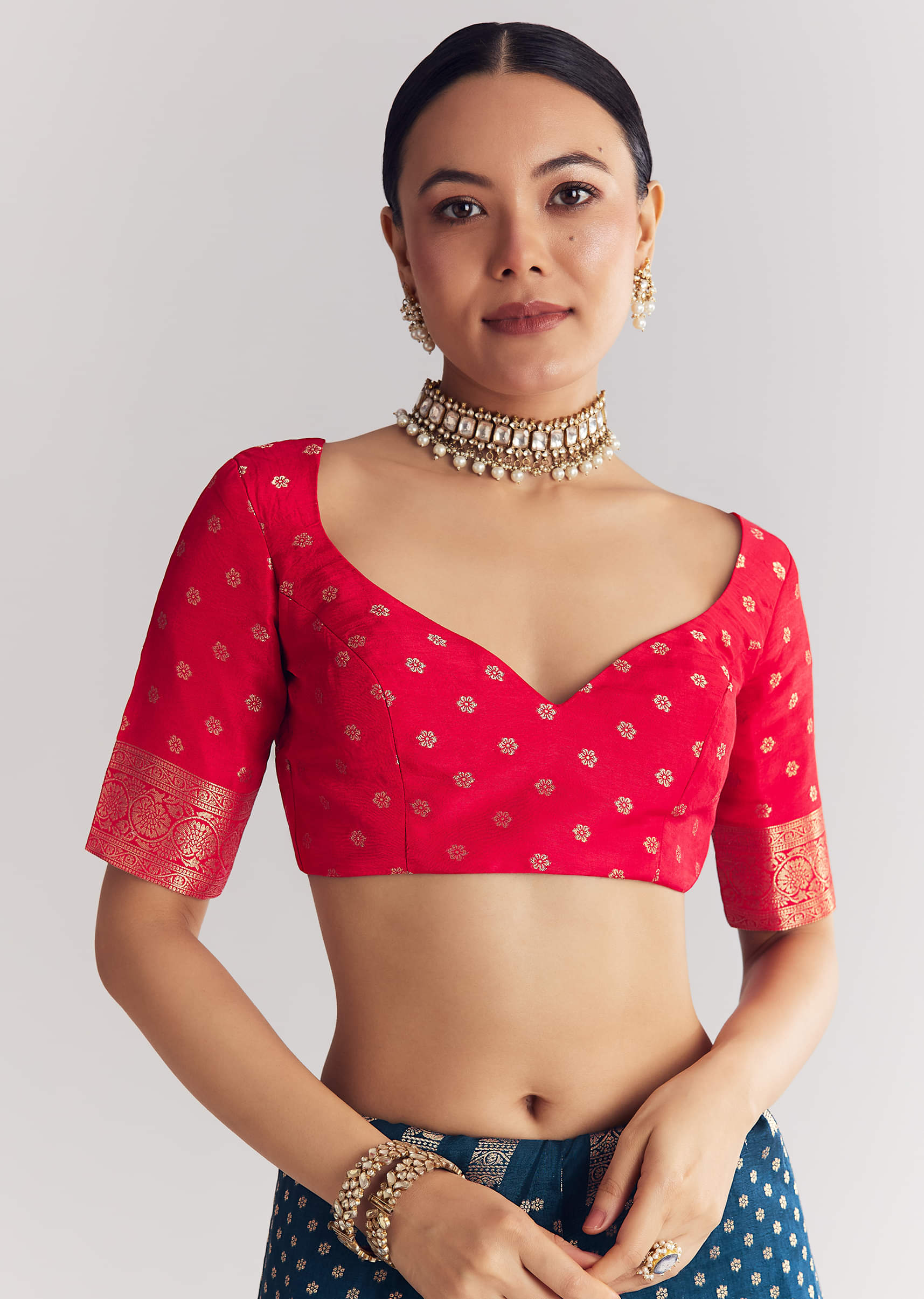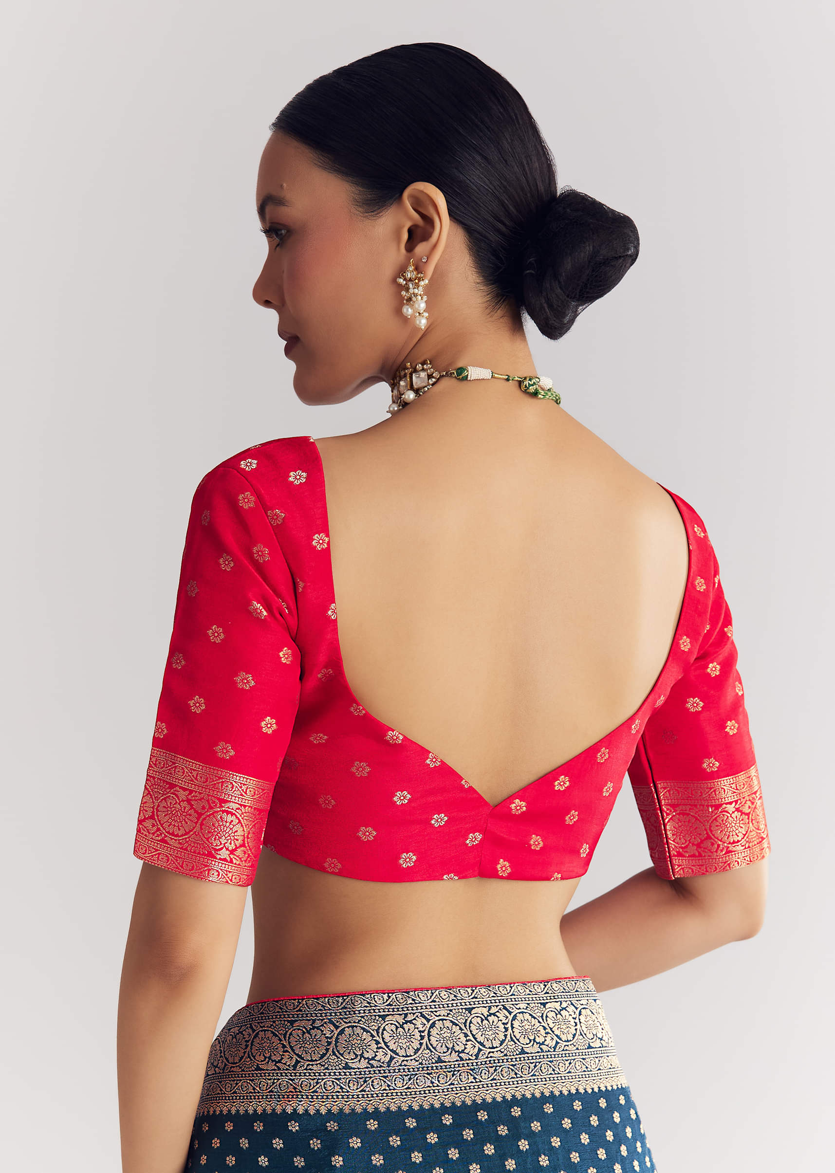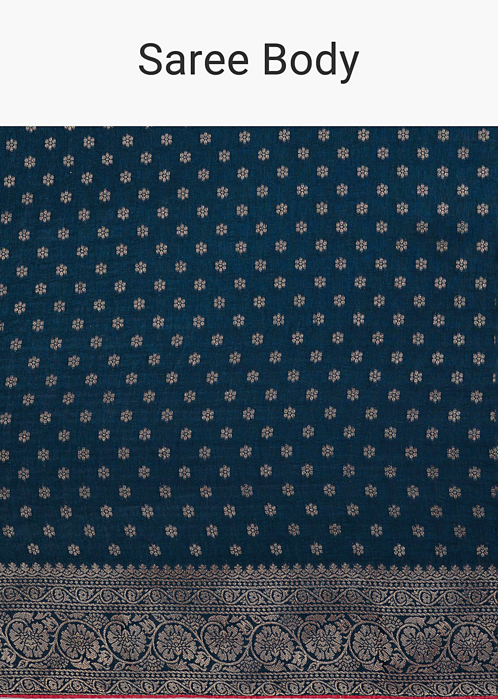 Immerse yourself in the allure of this luxurious peacock blue Dola silk masterpiece, this saree is a timeless celebration of tradition with woven butti all over with contrast red blouse. Each weave whispers stories of grace, making you the muse of every gaze. Awarded as the Most Trusted Brand, we're delivering styles you love, just as promised.