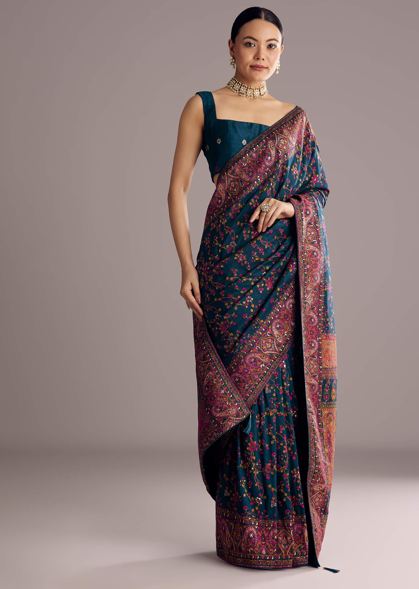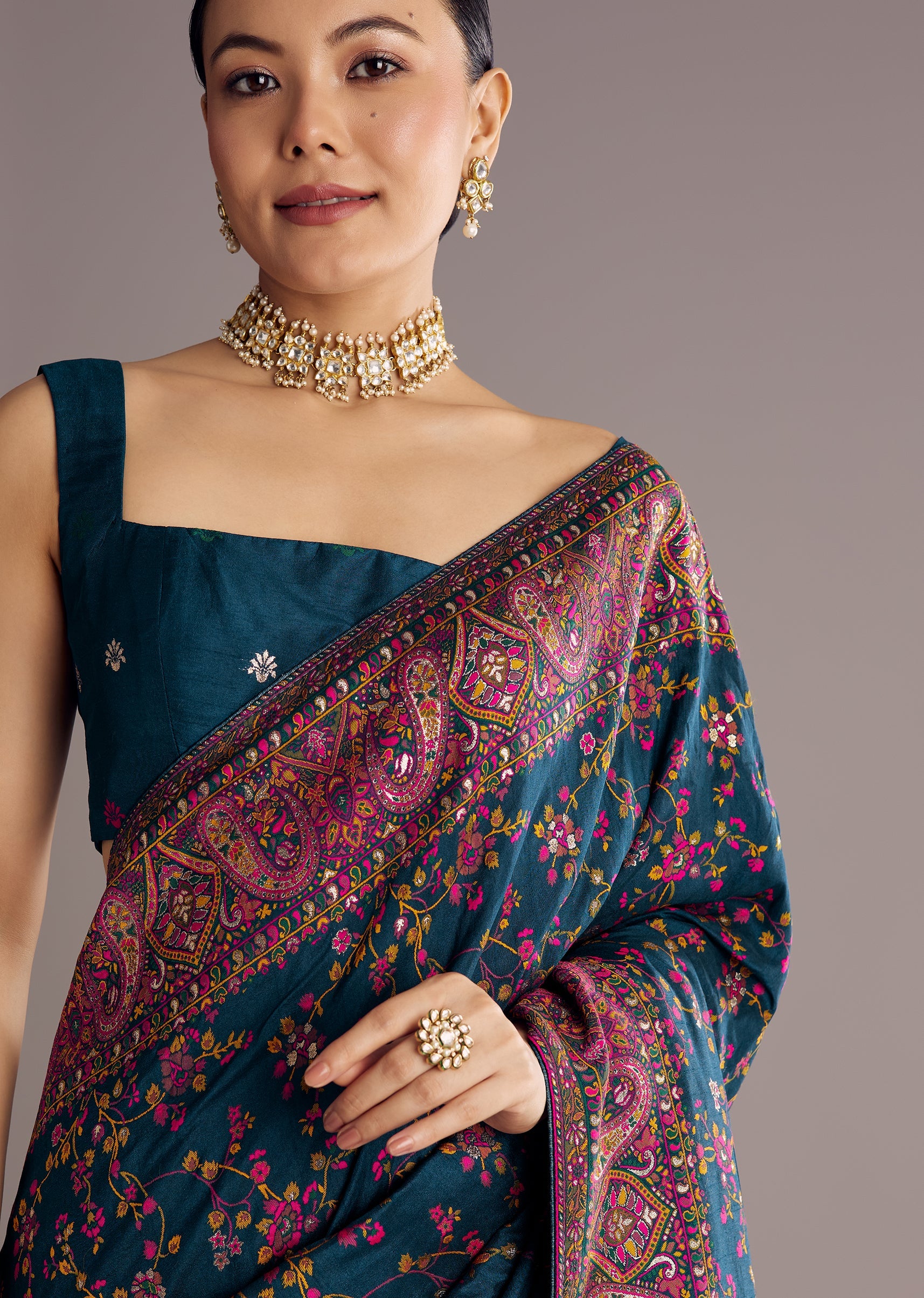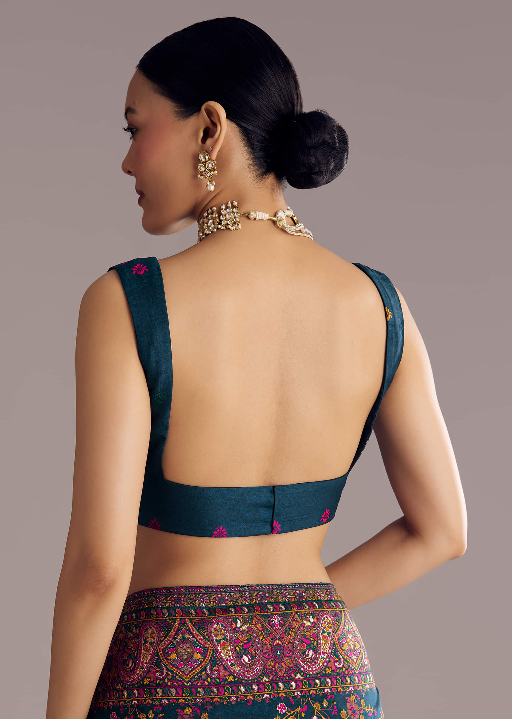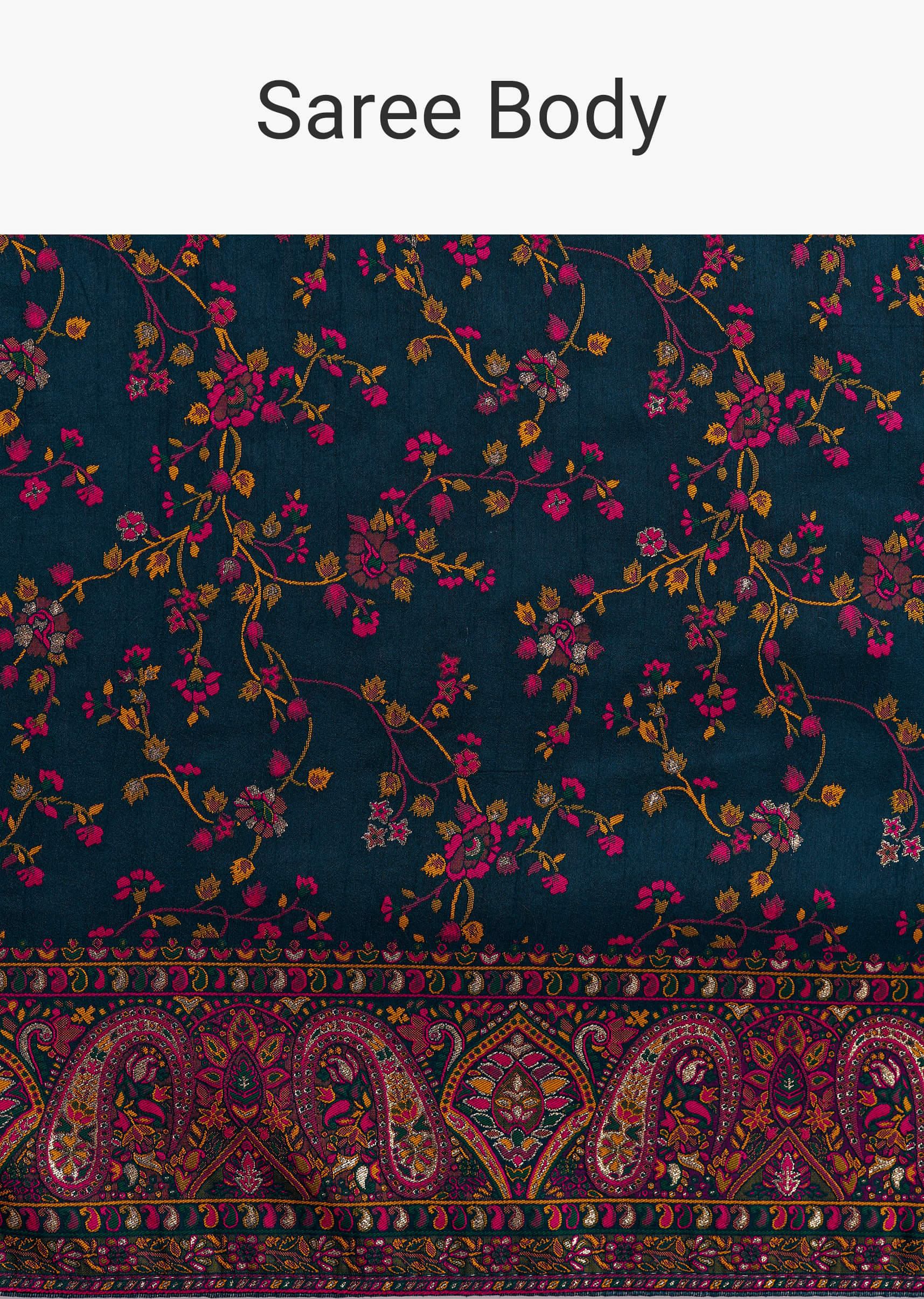 Peacock Blue Dola Silk Saree With Floral Jaal Weave