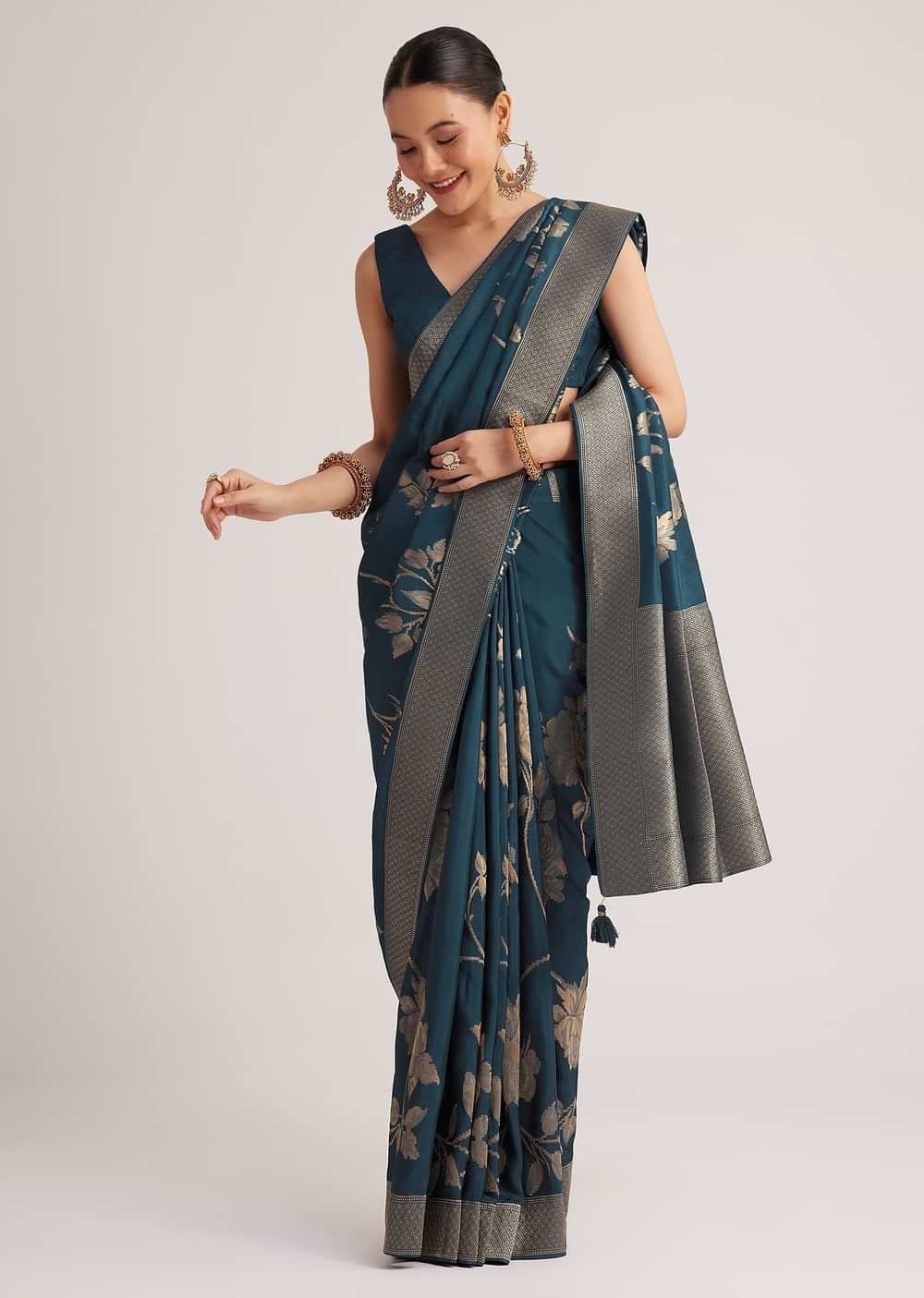 Radiating timeless beauty, this saree showcases a luxurious dola silk base adorned with intricate floral motifs that evoke a sense of grace and sophistication.The vibrant peacock blue hue adds a regal charm, making it an excellent choice for festive gatherings, and special cultural occasions.With its rich texture and delicate detailing, it offers a flawless drape that enhances your elegance.Perfect for those who appreciate tradition with a modern touch, this saree is a celebration of exquisite craftsmanship. Awarded as the Most Trusted Brand, we're delivering styles you love, just as promised.
