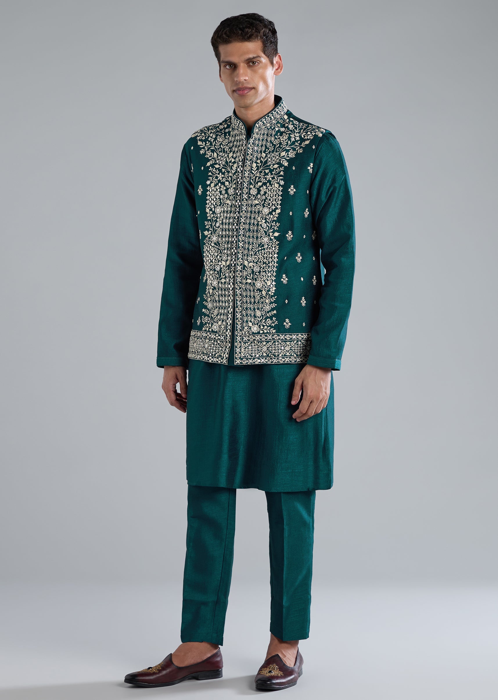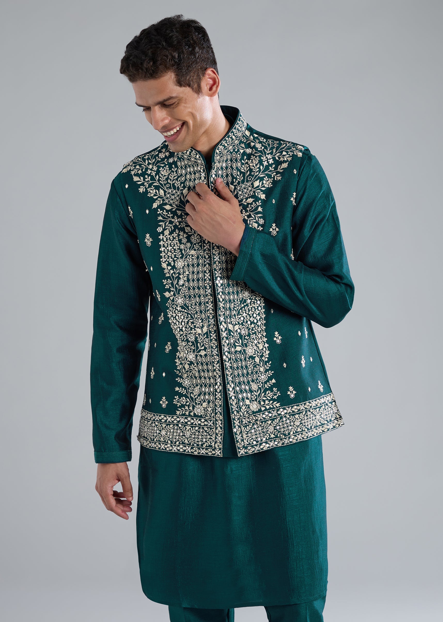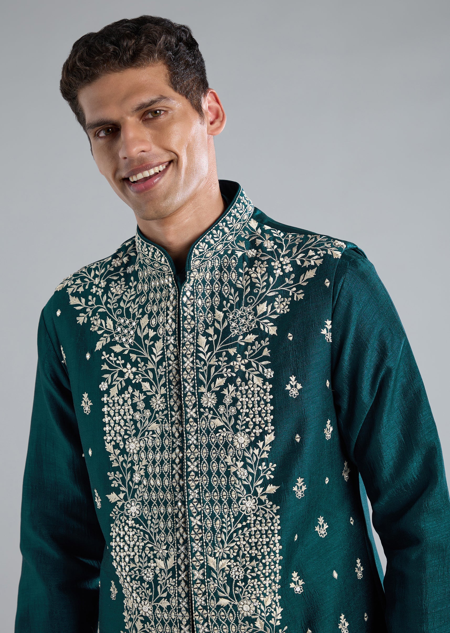 Peacock Blue Kurta Jacket Set With Mirror Thread And Resham Detailing